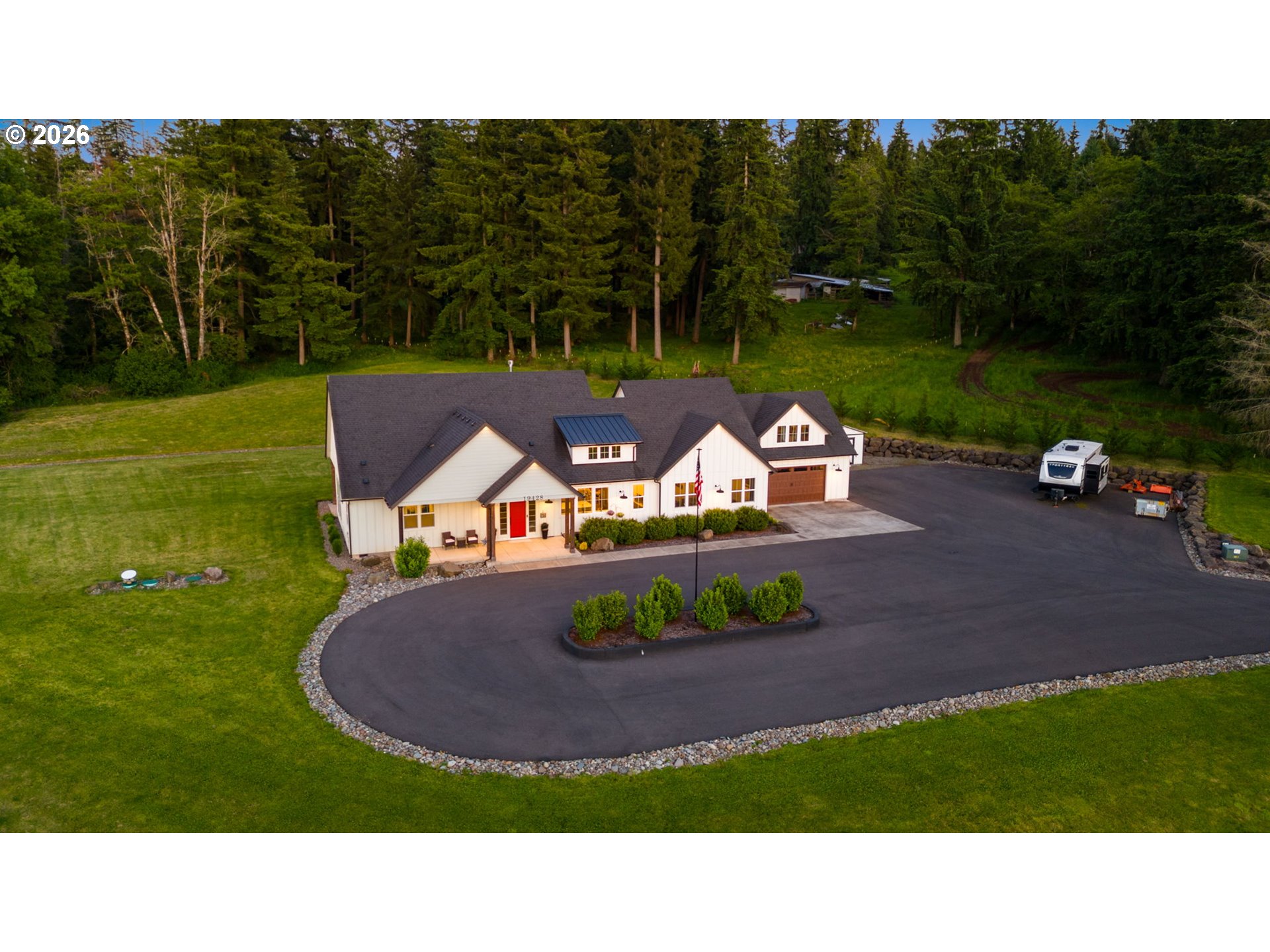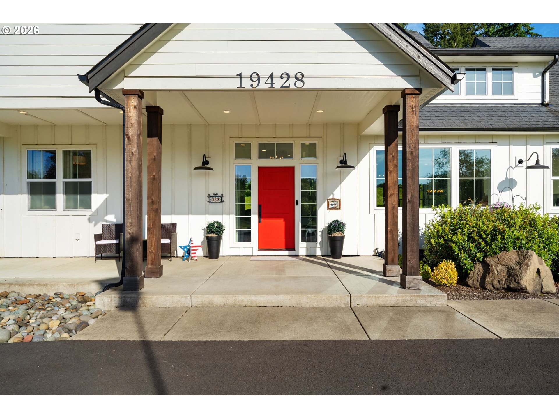 (503) 893-8874Back on the market with a few updates! **New listing**—a beautiful Craftsman-style Modern Farmhouse on 5 flat, usable acres in the Battle Ground Lake area. Built in 2018, this custom home blends privacy, function, and comfort, just minutes from downtown Battle Ground. A 320-ft private driveway leads to a landscaped setting with territorial views, mature trees, and a horseshoe-shaped driveway.The exterior showcases board-and-batten siding, large wood beams, and a welcoming front patio. Inside, you’ll find 2,464 sq ft of single-level living plus a 450 sq ft bonus loft. The open floor plan features 10-ft ceilings, luxury vinyl plank flooring, and abundant natural light. The great room offers floor-to-ceiling windows, a double-sided fireplace, and custom built-ins.The kitchen includes stainless steel appliances, a large quartz island, built-in refrigerator, 5-burner gas range with hood and smart convection, and a farmhouse sink overlooking the front of the property. A walk-in butler’s pantry with outlets and a coffee/wet bar provides the perfect amount of additional storage and prep space. The dining nook is surrounded by floor-to-ceiling windows with peaceful views of the property.The primary suite features a soaking tub, curbless walk-in tile shower, dual vanities, and separate dual his-and-hers spacious walk-in closets. The covered back patio runs the length of the home and includes a shiplap ceiling, recessed lighting, and exposed beams—ideal for entertaining or relaxing.The property also includes a built-in fire pit, 12x16 storage shed, privacy landscaping, concrete walkways, and perimeter fencing. Additional highlights include an oversized 676 sq ft 2-car garage with 11-ft ceilings, 400-amp underground electrical service, public water with filtration/softener system, pressure distribution septic, and ample parking for RVs or boats. A 40x40 asphalt pad with 220V is wired for a future shop, barn, or hot tub. Shop plans are provided with the sale of the home!
