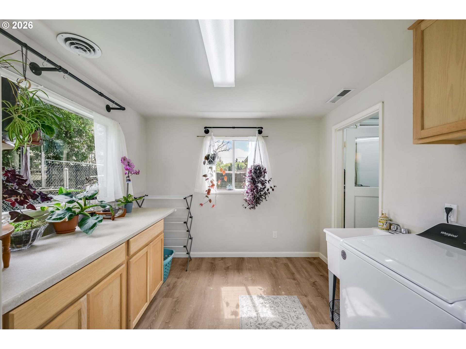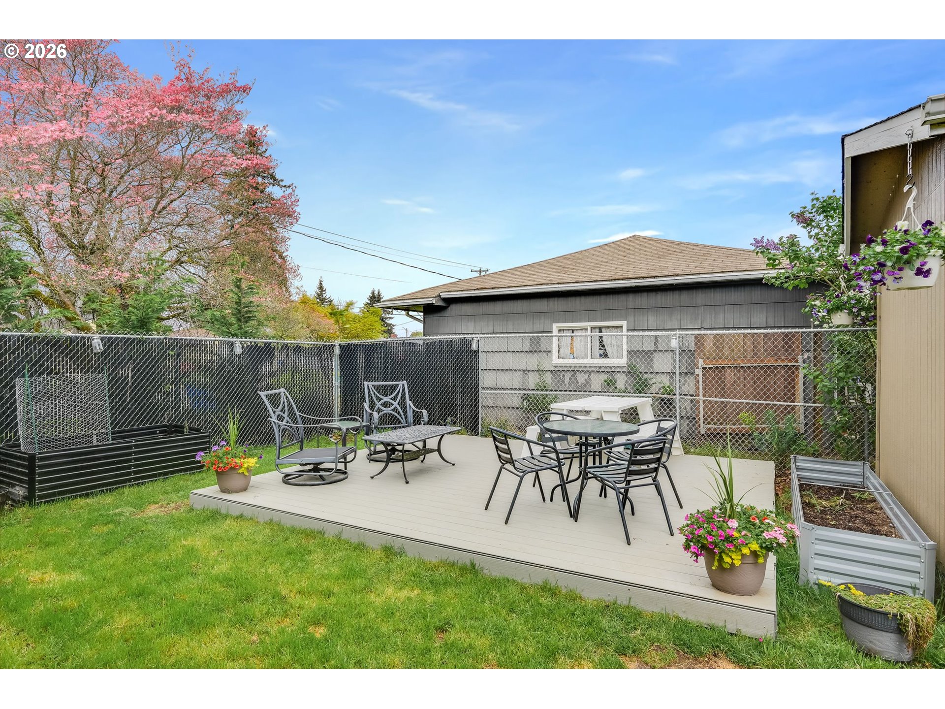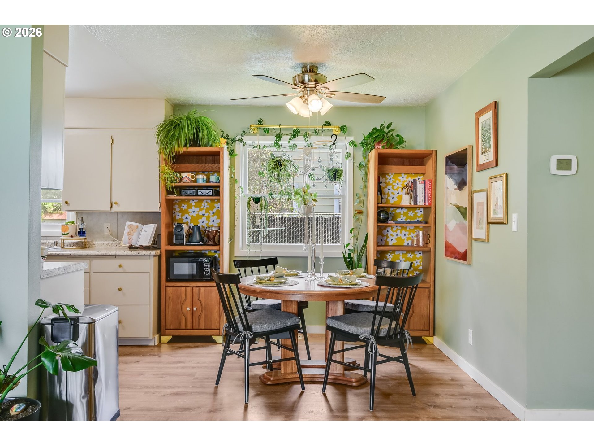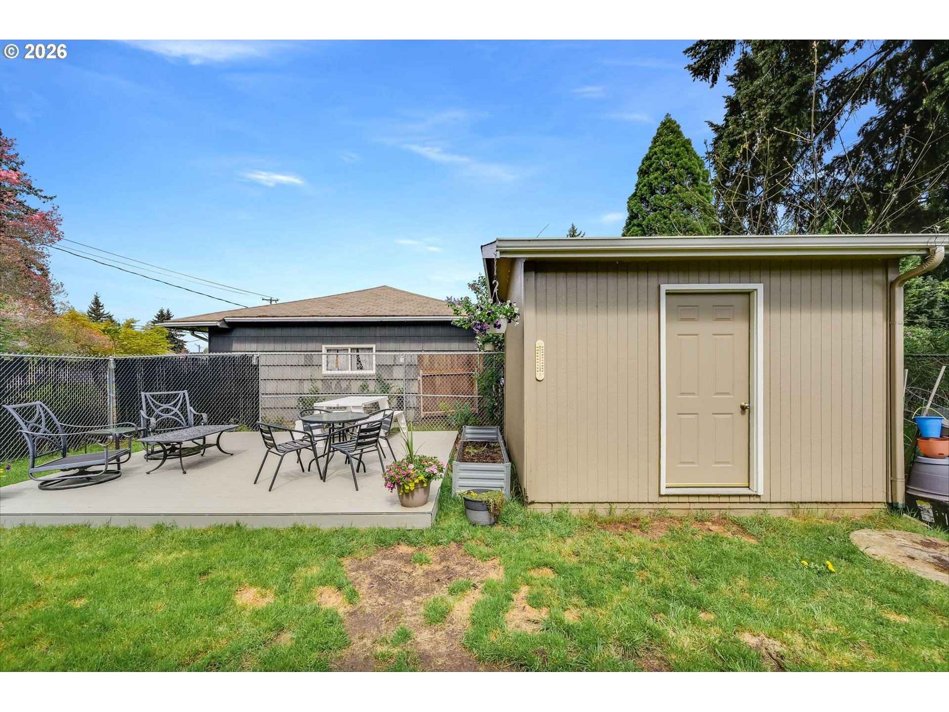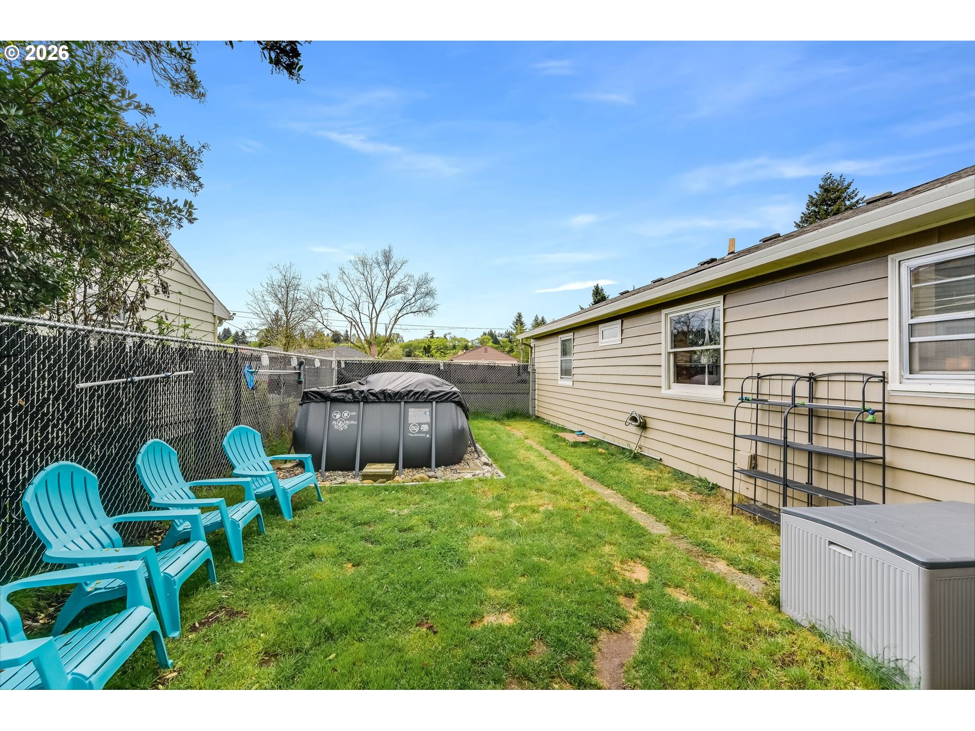 Bright and cheerful, this charming one-level home sits on a spacious corner lot surrounded by mature landscaping! Nearly floor-to-ceiling picture windows flood the living room with natural light, showcasing gorgeous original hardwood floors that flow through the main living areas and all three bedrooms. Updated kitchen features solid surface counters, casual eating area, and stainless appliances - refrigerator included! Fully renovated bathroom with new shower surround and dual-flush toilet. Large, heated utility/mudroom offers a sink, laundry area with folding station (fridge included), and great storage. Built-in garage cabinets add even more storage. Out back, enjoy a fully fenced yard with deck, raised garden beds, side yard, and a 10x12 tool/storage shed. Plus, above ground pool included! Centrally located near schools, trails, parks, and everyday amenities. Open House: Saturday, April 18, 12–2pm.