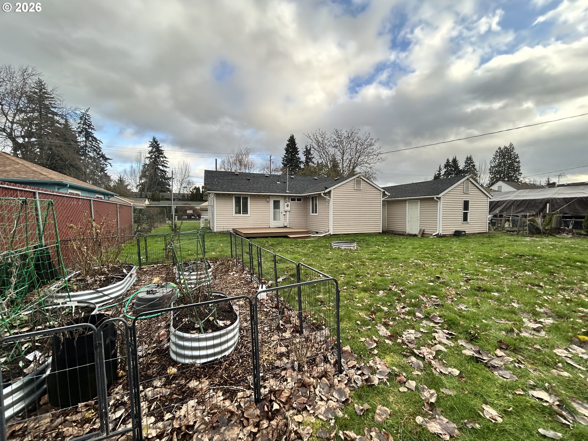 This delightful 2-bedroom, 1-bath home sits on an impressive .22-acre lot, offering endless outdoor potential. Inside, you'll find a cozy layout with stainless steel appliances in the kitchen and a comfortable flow throughout the home. The fully fenced backyard is perfect for pets with a back gate for additional access and for gardening enthusiasts with its raised beds. The backyard firepit creates a perfect ambiance for memorable gatherings outdoors. Enjoy summer evenings on the back deck and take advantage of plentiful RV parking. A detached garage with a bonus workshop area provides excellent hobby space. A rare find with room to grow!