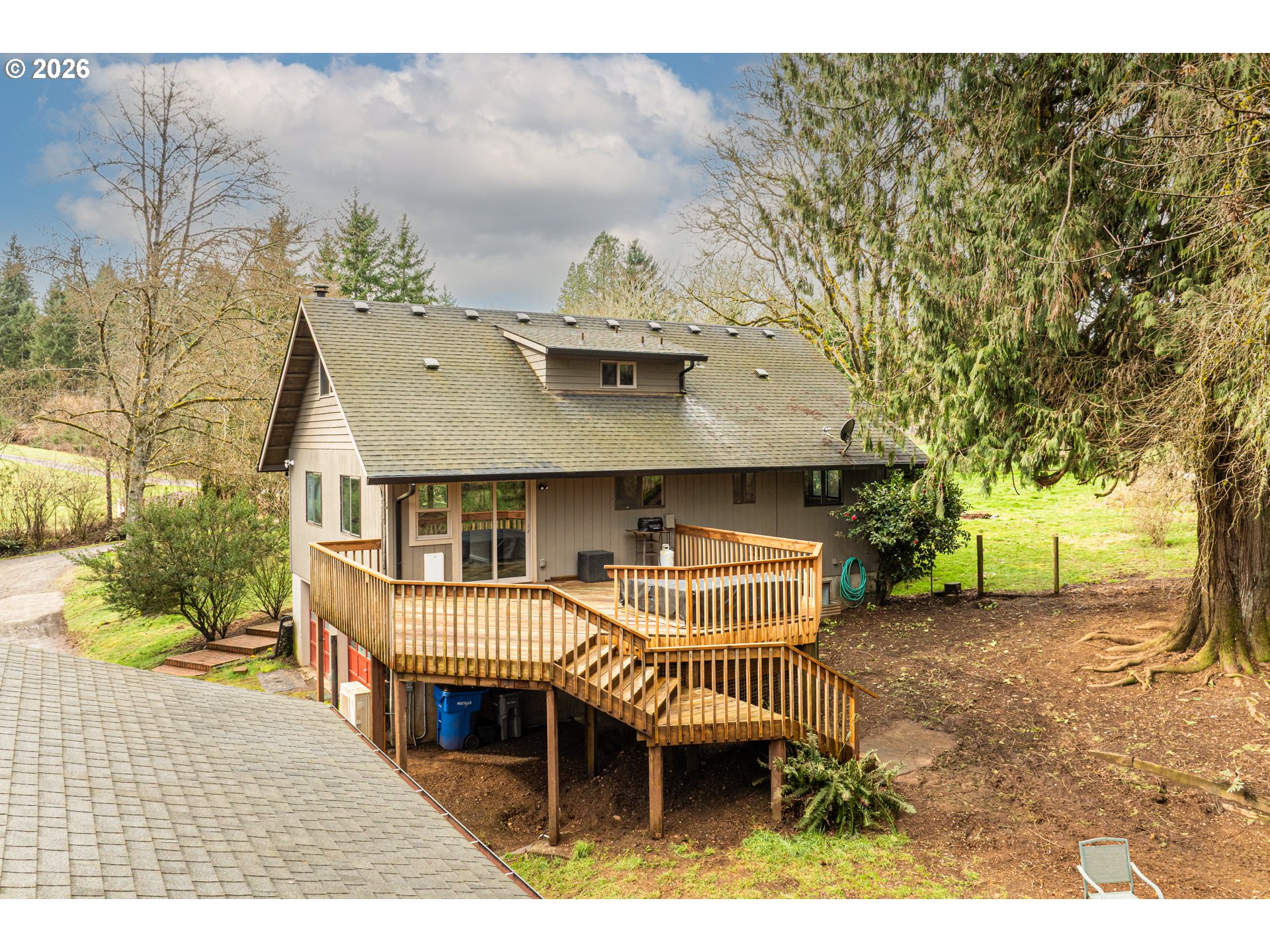 Enjoy the serenity of wooded surroundings in this custom-built home featuring four spacious bedrooms, two and half baths on 2+ acres. Thoughtfully designed layout with kitchen offering an abundance of cabinetry and counterspace, perfect for everyday living and entertainment. Large picture windows fill the home with natural light while showcasing peaceful views of the surrounding forest landscape. Lower living space includes convenient private outside access complete with built-in kitchen cabinets making it ideal for separate living quarters. Step outdoors and experience everything this property has to offer; variety of mature fruit trees, blueberries, raspberries, natural creek, welcoming front porch overlooking the expansive front yard, and a spacious deck with a hot tub, the perfect place to relax and unwind while enjoying the tranquil setting and wildlife. This property explodes with color in the Spring and offers garden boxes for a bounty of home grown vegetables. 1 car garage plus storage attached, 2 car garage detached with workshop. Generous storage throughout the home. Minutes to Battle Ground amenities. Don't miss out on this amazing home and property!