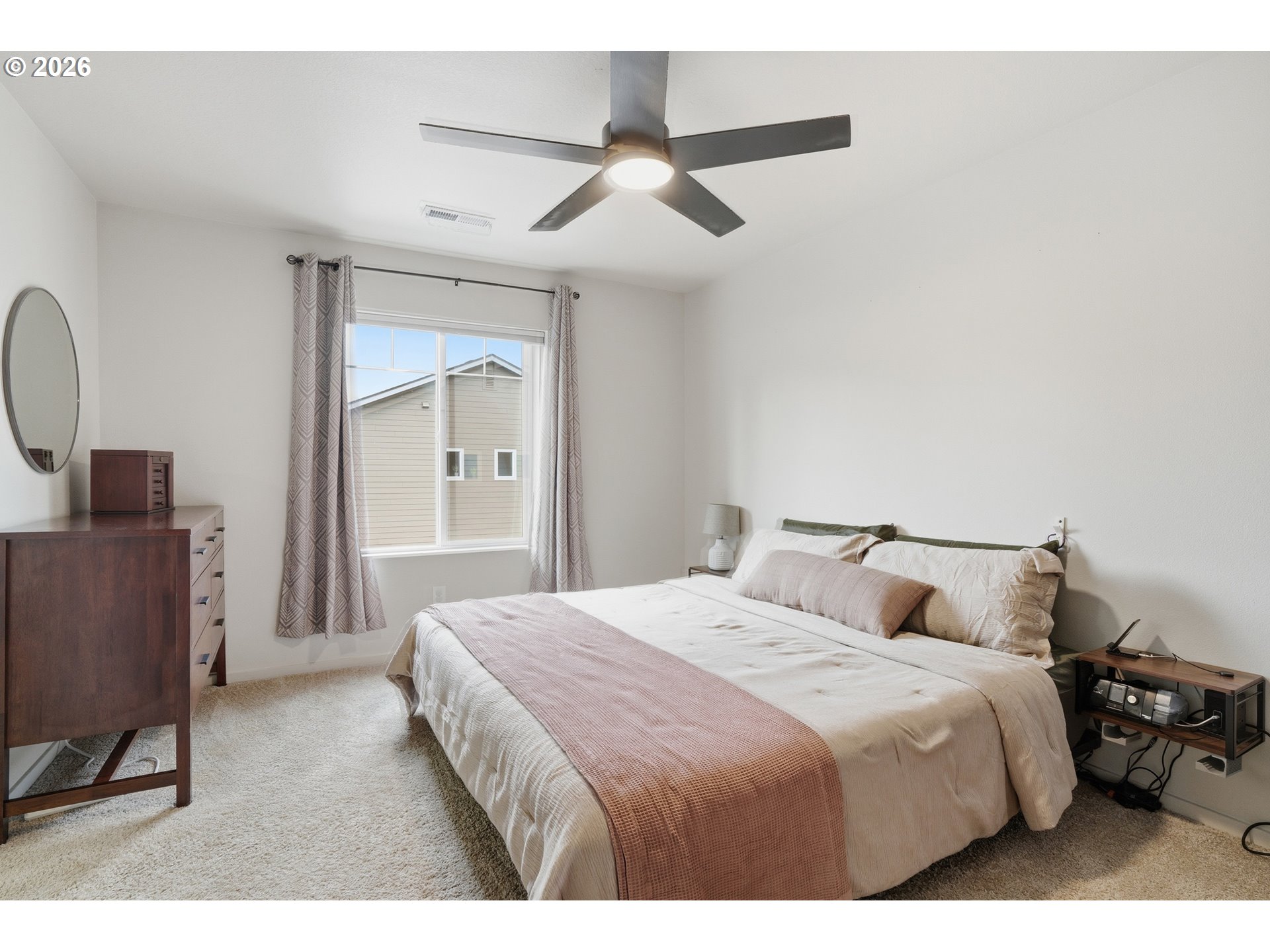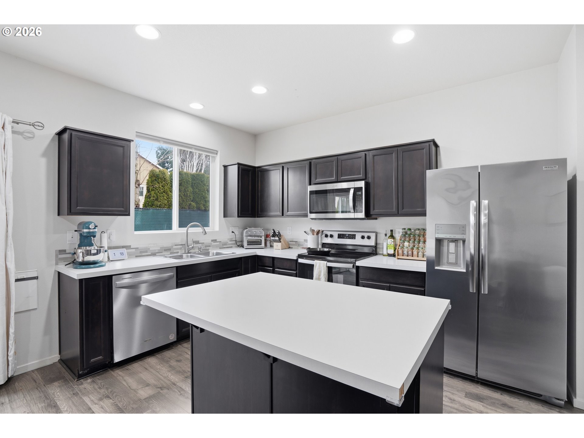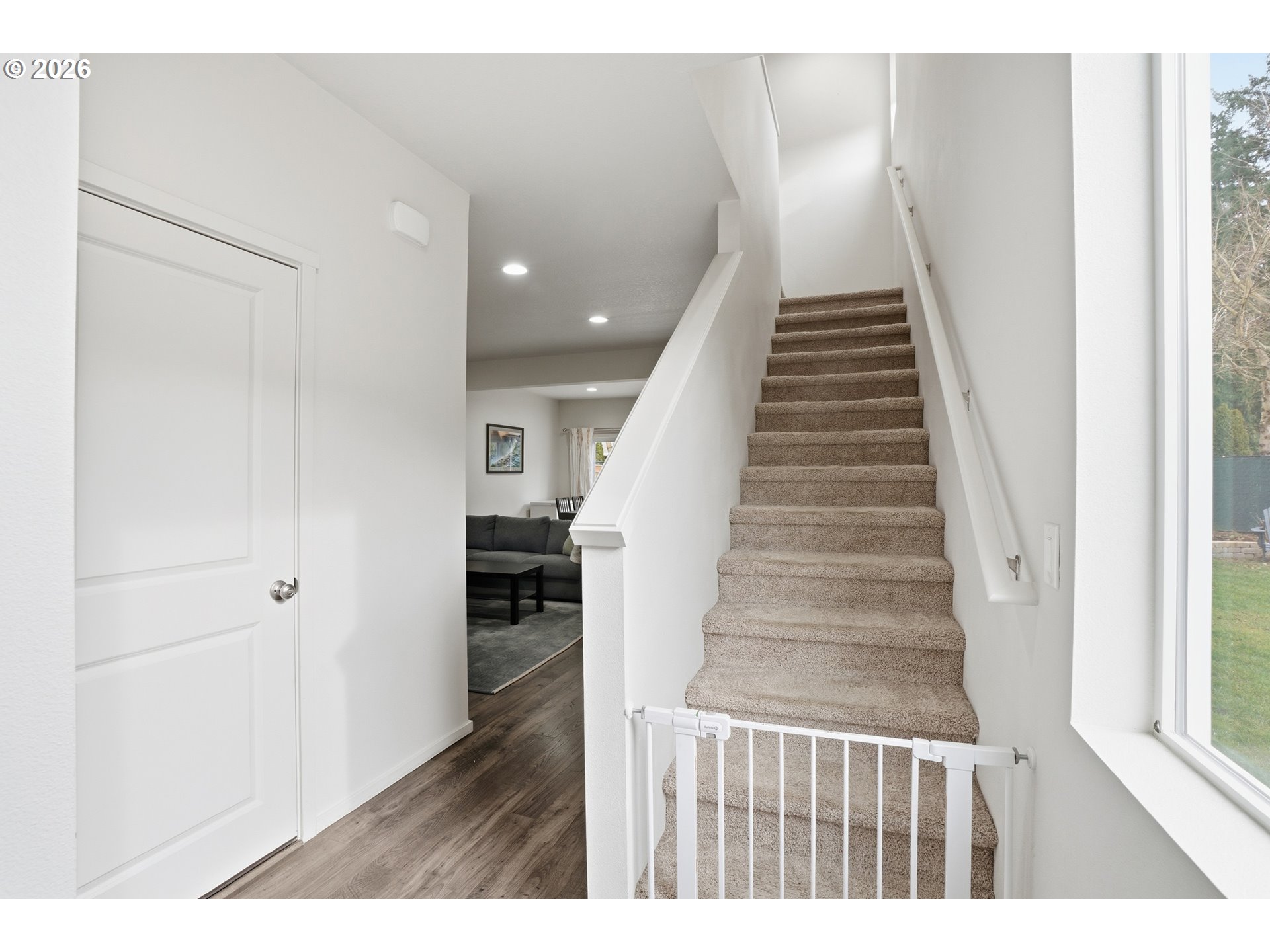 Welcome home to this beautifully situated two-story end-unit townhome, thoughtfully enhanced with smart home technology and a truly one-of-a-kind outdoor setting not found in any other townhome in the community. With 3 bedrooms and 2.5 baths, this home lives larger than expected thanks to its rare end-unit location, offering added privacy, abundant natural light, and an expanded footprint. The open and inviting main level is anchored by a well-appointed kitchen featuring a center island, stainless steel appliances, ample cabinetry, and integrated smart home features designed for modern living. A sliding door off the kitchen opens to a spacious brick patio—ideal for entertaining or relaxing—leading down to an exceptionally rare, private, fenced grassy yard. This oversized outdoor space is exclusive to this home and sets it apart from all other townhomes in the neighborhood, offering a level of outdoor living seldom found in this style of property. Upstairs, plush carpeted bedrooms create a comfortable retreat, complemented by two full bathrooms. The primary suite features a walk-in closet and private bath, while smart climate and convenience features enhance comfort throughout the home. Washer, dryer, and sound system are included, making this residence truly move-in ready. An attached one-car garage with additional driveway parking adds everyday convenience. Located within the Four Seasons HOA, this home is minutes from I-205 and close to shopping, schools, parks, and essential amenities—providing an easy commute and a connected lifestyle. A rare opportunity to enjoy low-maintenance living paired with modern technology, exceptional privacy, and an outdoor space that is truly unmatched.