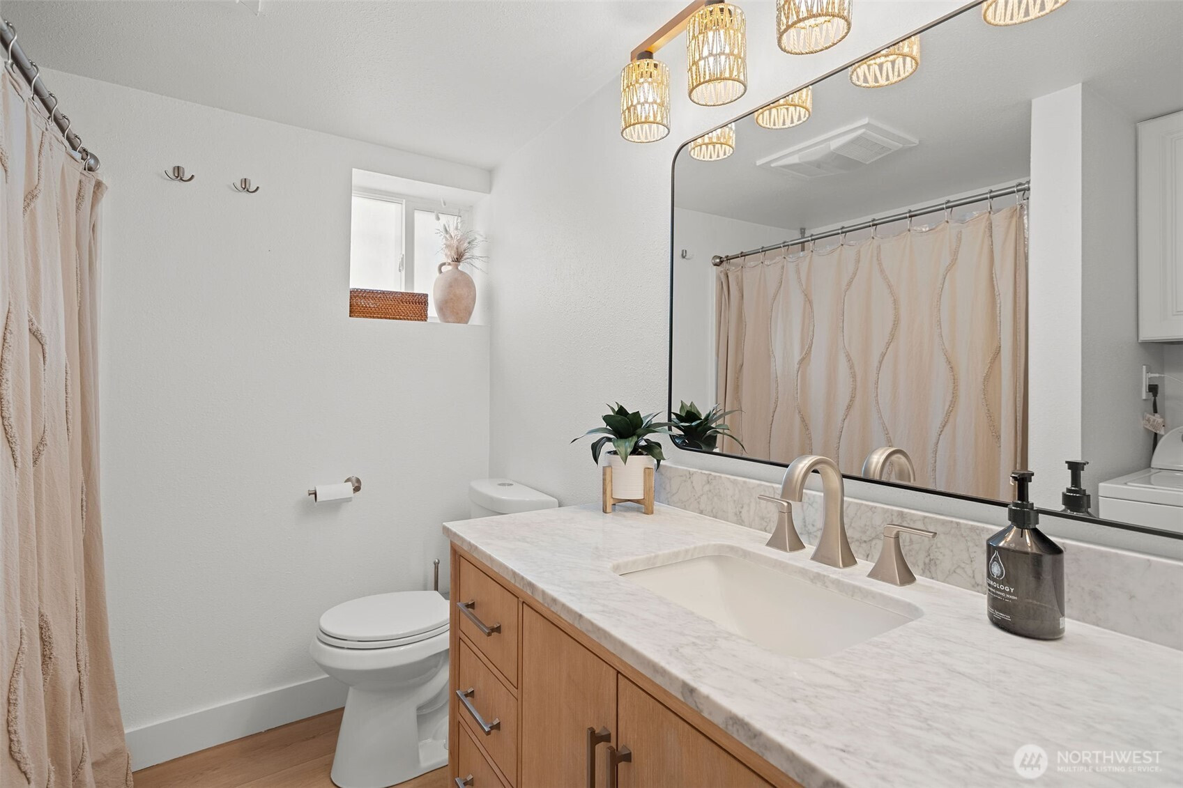 Modern, fully remodeled and move-in ready, this beautifully updated home offers style, function, and convenience. Enjoy all new LVP flooring seamlessly throughout, new trim, new interior paint, new outlets throughout, new closet shelves, and a completely renovated bathroom with new vanity, lighting and toilet. The kitchen features stainless steel appliances, butcher block counters, and a sleek tile glass backsplash. Additional upgrades include a new water heater, recently repainted exterior, and newer roof for peace of mind. Take in views of Vancouver Lake and enjoy being just minutes to Vancouver Lake and Frenchman's Bar for outdoor recreation. Conveniently located near schools, shopping, dining, and transit. One deeded carport conveys with ample guest parking available. A Turn-key opportunity in a prime location you don't want to miss. All appliances convey!