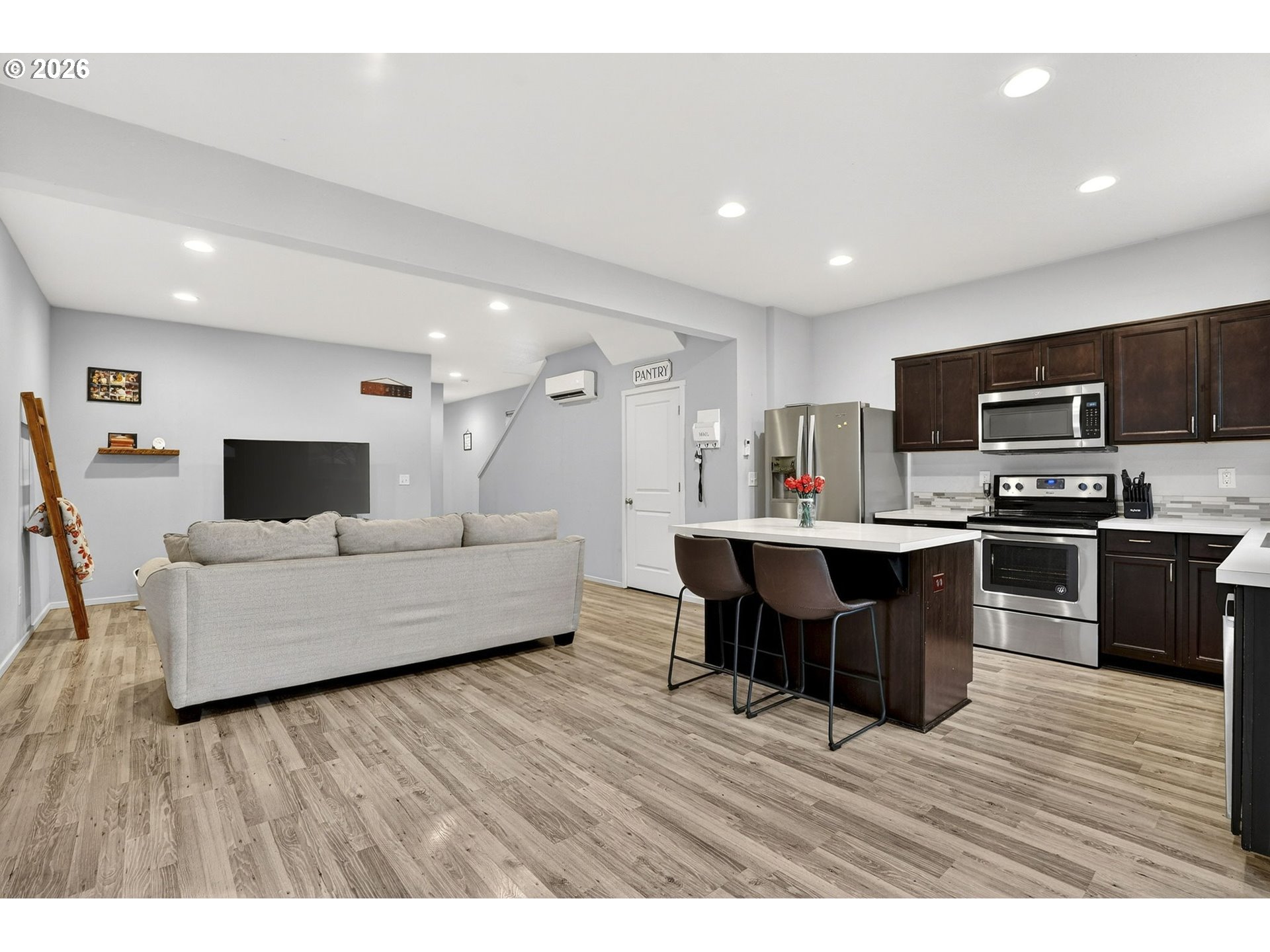 Thoughtfully designed, this end-unit townhome-style condo offers a blend of comfort and function. The kitchen features granite countertops, stainless steel appliances, island, and pantry. The open layout flows naturally into the dining and living spaces; ideal for daily routines or casual entertaining. Upstairs, a small loft space provides flexible use—perfect for a home office, reading nook, or creative corner—while the laundry room is conveniently located on the same level as the bedrooms. Take a look out your backdoor to find a fenced backyard with a patio and pergola, perfect for enjoying the outdoors year-round. A mini-split system provides efficient heating and cooling. Less than 1 mile to 205 and 2 miles to Evergreen High School.