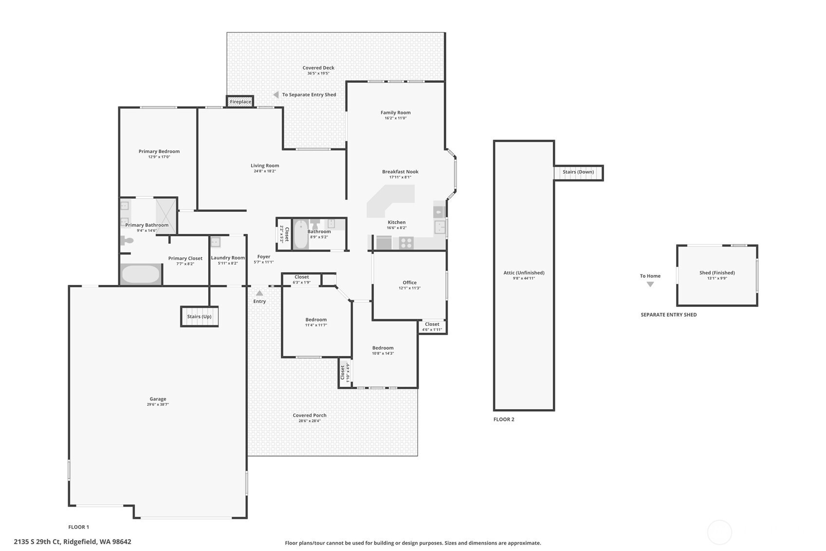 1/2 ACRE LOT - RIDGEFIELD - WISHING WELLS ESTATES. One-of-a-kind private oasis nestled on .58-acre lot backing to green-space and walking paths. PRIDE OF OWNERSHIP SHINES in this meticulously cared for ONE-LEVEL 1998-built home with many recent updates. Offering a rare combination of casual luxury, hobbyist dreams, and "turn-key" peace of mind. NEW & REFRESHED FOR 2026: Step into a home that feels brand new with complete professional interior repaint and new carpeting too. Featuring Brazilian Hardwood Floors and a Gourmet Kitchen w/Expansive Granite Island. 2023 Primary Ensuite remodel is spa-inspired - custom-tiled walk-in shower, jetted tub, double vanity, spacious walk-in closet, and stylish barn door. HOBBYIST’S DREAM- LOVE CARS? - LOVE GARDENING? - Lots of Raised Garden Beds and Check-out the finished 5-car garage and attached RV/Boat carport (2018). Custom driveway expanded (2017) for effortless maneuvering. Garage features a massive attic w/pull-down ladders—potential bonus area! OUTDOOR LIVING & CREATIVITY: Relax & Unwind on the NW Inspired Timber-Vaulted Front Porch w/skylights, Covered Back Deck for year round enjoyment, and a 30-ft stone patio w/fire pit (2020). Don't miss the Detached Art/Music Studio or Office—fully finished w/electricity & floor insulation (2025). Matching Roofs on all 4 structures (2018), New Hot Water Heater (2025), and New attic/under-house insulation (2025). Near RORC and Schools (Go Spuds!). Experience the BEST of Ridgefield living!