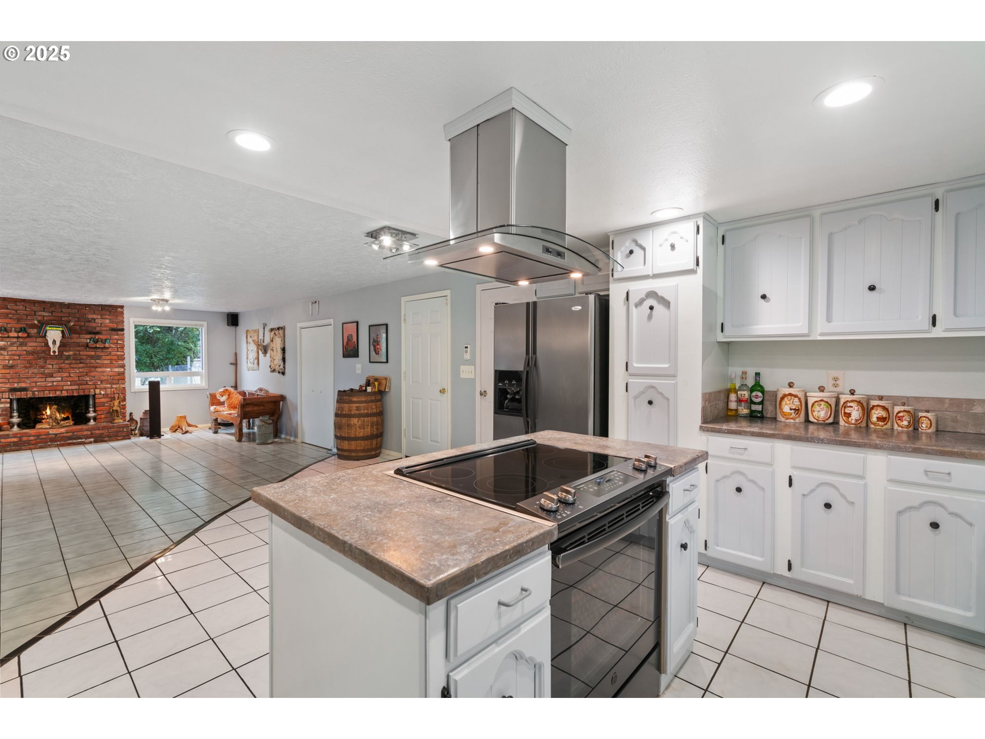 CookIsland, Cooktop, Dishwasher, FreeStandingRefrigerator, StainlessSteelAppliance, Tile