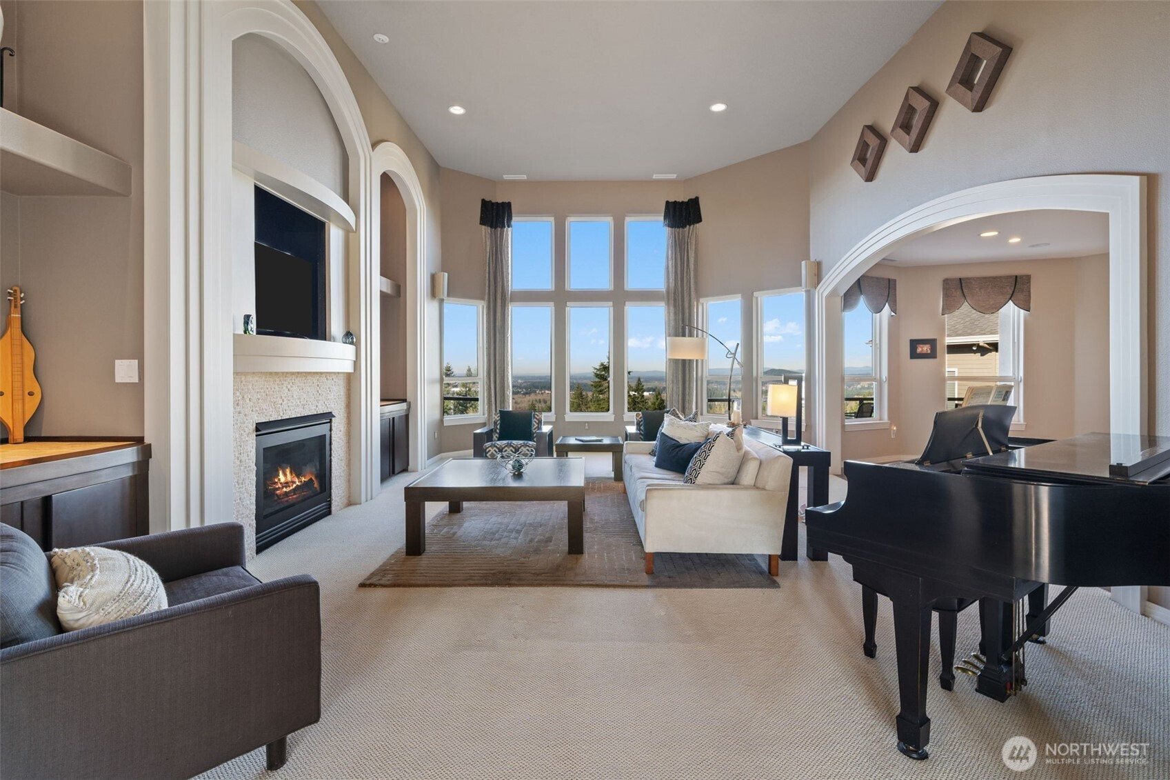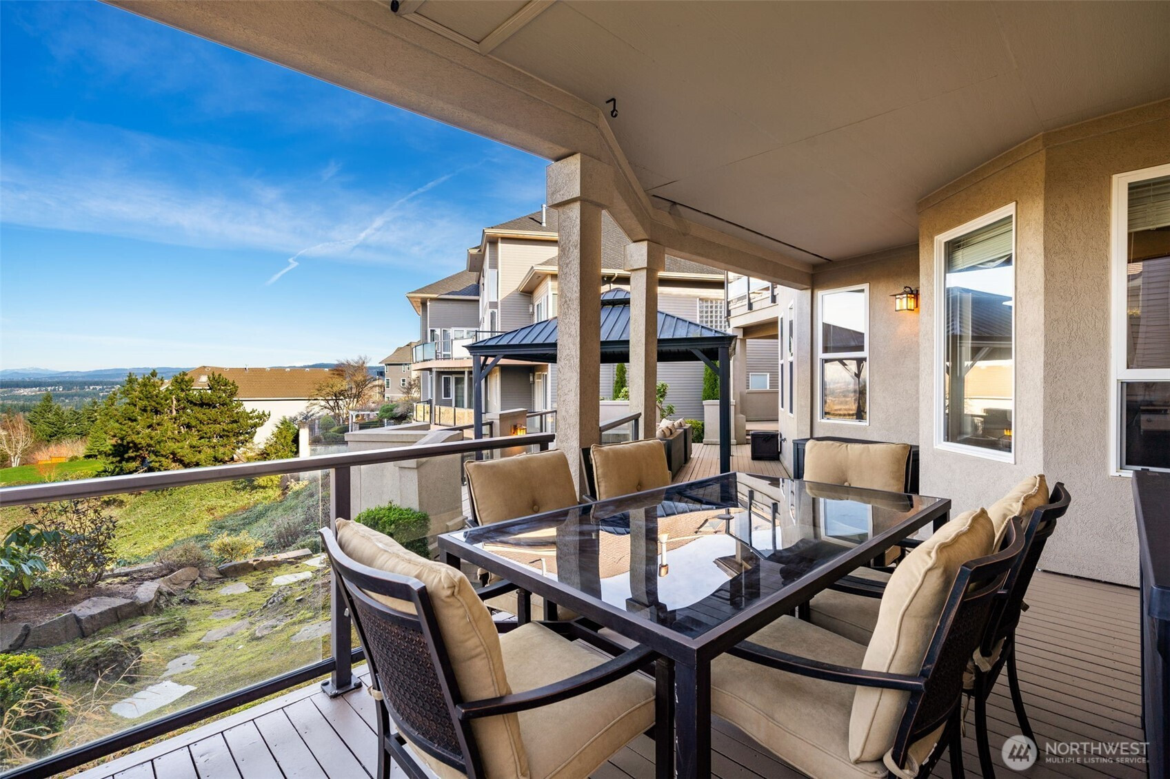 This one has it all - views, versatility, and major upgrades. Enjoy a main-floor primary suite with spa-like bath featuring heated tile floors, gas fireplace, jetted tub, and dual sinks, all overlooking vast mountain views. The updated kitchen shines with brand-new gourmet appliances, new vent-hood, and hardwood floors flowing through the kitchen, dining nook, and bar. Soaring 15’ ceilings, surround sound, gas fireplace and dimmable lighting elevate the living room, while a dream main-floor office with built-ins makes working from home effortless. Step outside to a huge covered back deck with gazebo seating, formal dining space, and gas hookups for endless entertaining. The lower level offers ideal multi-generational living potential, with two bedrooms, a Jack-and-Jill bath, additional bathroom, office/workout room with private sauna, and space ready for a second laundry. Energy-efficient heat pump on the main floor, separate lower-level furnace, full foundation waterproofing, elevator-ready design, and a 3-car garage with WiFi control complete this exceptional Camas home.