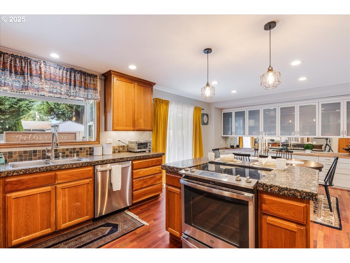 (503) 893-8874This well loved home has an amazing setting on a large usable level nearly 15,000sf lot. As you enter this mid-century homes large main level entry the functional split-level layout presents itself immediately. Upon entry at the main level you will appreciate the non-slip slate tile flooring, large laundry closet, huge family room that is host to the wood burning fireplace, Slider to the covered deck and hallway half bath.As you ascend the entry stairs you are greeted by a large living room with amazing picture window drowning the space in natural light. From there you are led into the dining room with cherry hardwood floors and built in buffet with tons of additional storage, a granite breakfast bar and cooks island along with updated cabinets and large pantry and an additional slider that leads to the open upper deck. Outside, you will discover, a fire pit and a freshly leveled and seeded yard, gravel firepit area and garden shed. The property also includes galvanized metal covered RV parking up front with hookups, a fenced yard, a two-car garage with cabinetry, NEW HVAC. This home is ready to welcome you!