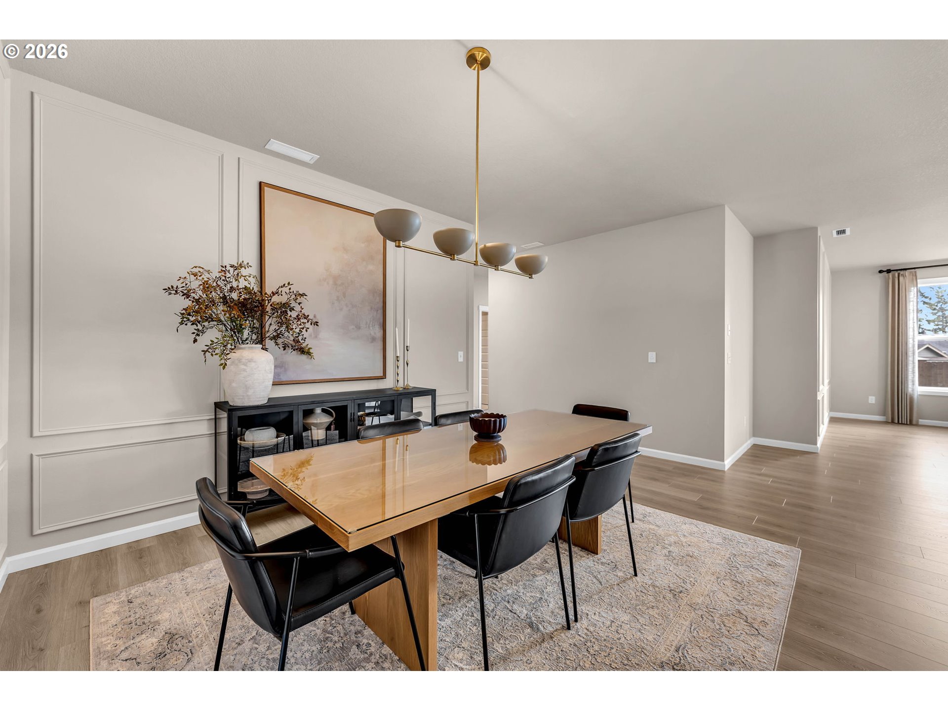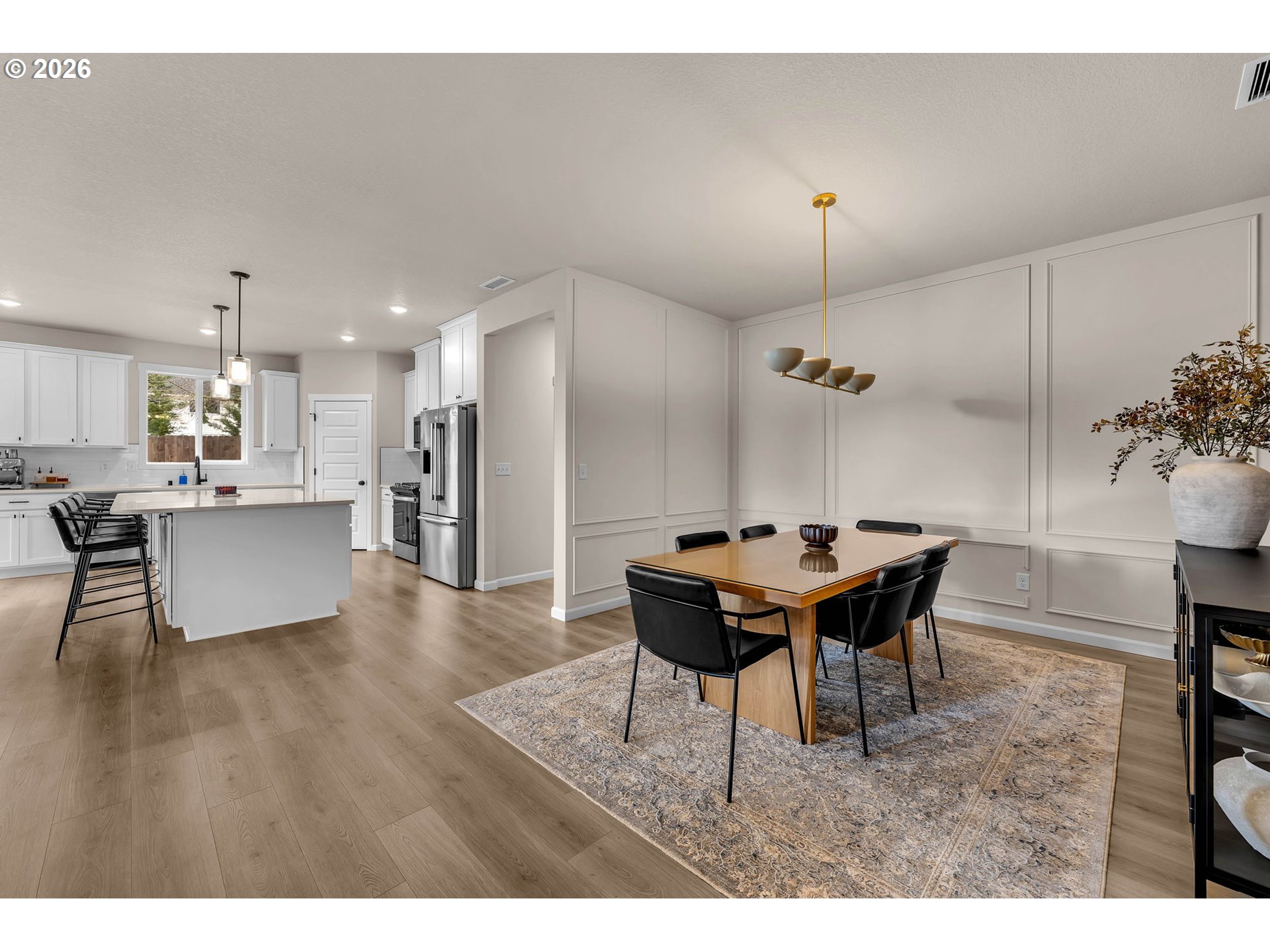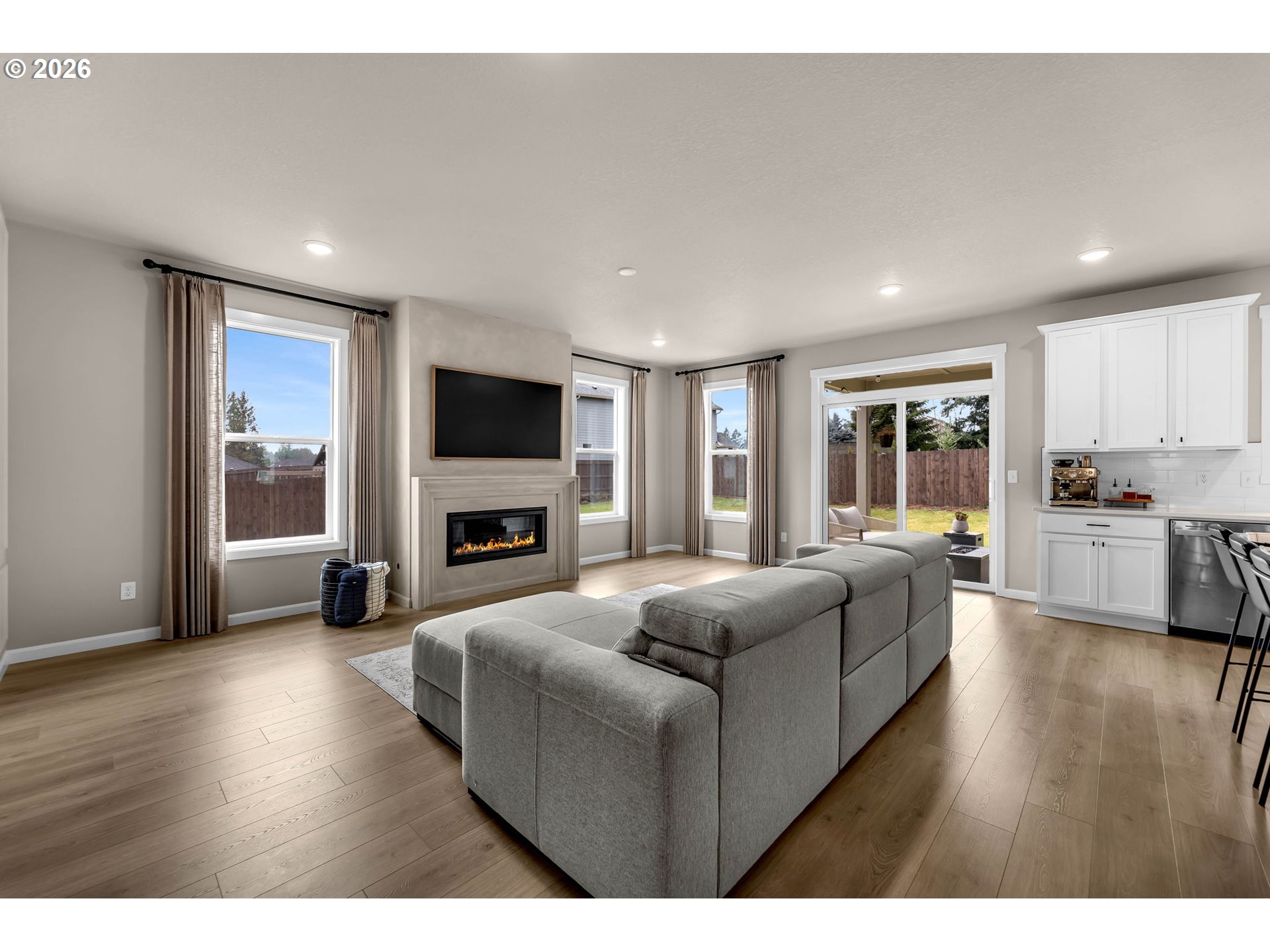 Extra-large 10,468 sqft lot. Single Level with Over-Sized Kitchen Island. Custom Added Wall Paneling in the Dining Room and Living Room. Custom Limestone Plaster Fireplace Surround and Mantel. Added Garage Cabinets for Storage. Amenities include a Covered Patio (with gas hook-up), 9ft Ceilings, Painted White Cabinets, Quartz Slab Countertops in Kitchen and Bathrooms/Laundry, Stainless Gas Appliances, Full Height 4 by 16-Inch Subway Style Backsplash, Under Cabinet and Pendant Lighting, Linear Style fireplace in the Great Room, Laundry Cabinets with Sink, Laminate Plank Flooring throughout. Tile Bathroom Floors and Master Shower. Upgraded flooring in the primary bedroom and closet. Full landscaping, Yard sprinkler system, fencing, garage door opener, and an electric car charger plug. Schedule a showing today! 3D Scan and Tour available. All installed appliances stay!