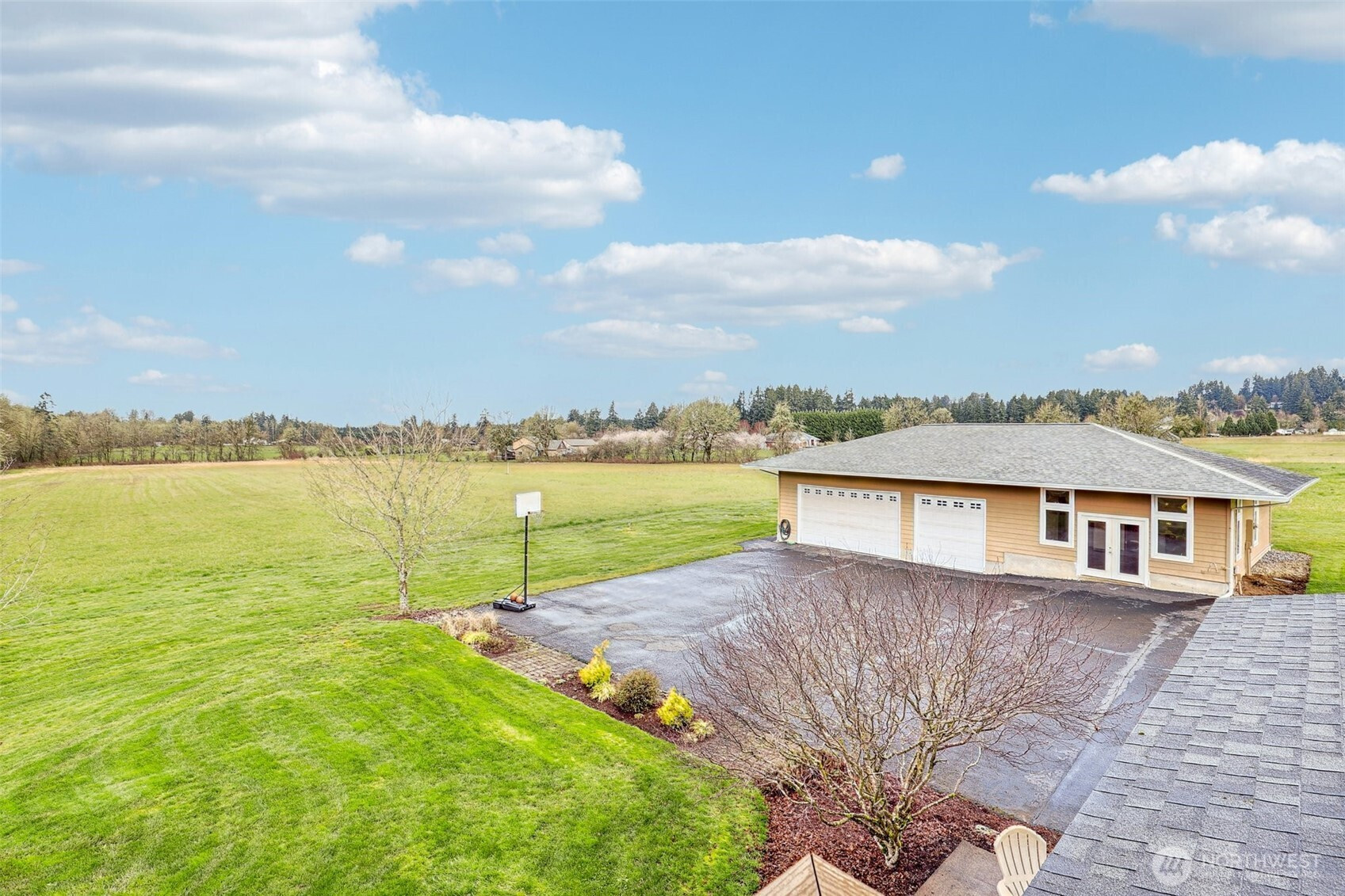 Custom home with welcoming covered front porch. 6-lite entry opens to spacious foyer with soaring ceiling, stairwell with solid mahogany railings and balusters. Great room family room with 3-sided propane fireplace, stone surround hearth, built-ins, ceiling fan, and French door access to covered patio. Gourmet island stainless kitchen features abundant custom cherry cabinetry with pull-outs, tile and laminate counters, island dining, desk area, separate breakfast bar and dining area. Upstairs primary en-suite offers a propane fireplace, ceiling fan, walk-in closet, dual sink tiled vanity, soak tub with dual shower heads, private water closet, wainscoting, and French doors to view deck. Five additional bedrooms, den/office with French doors and bookcases, loft, laundry/mud room with sink and storage, storage room, powder room, and two full baths. Main level features 9-ft 6-inch ceilings and radiant heated stained concrete floors; upper level has 9-ft ceilings, wide hallways, carpet and tile. Abundant natural light from clerestory and large windows throughout. Extra-deep 3-car garage, work bench, storage and an attached 716 sq ft ADU with French door entry, great room, kitchen, bedroom, full bath, laundry hookups, electric water heater, high ceilings, stained concrete floors. Exterior: 9.02 flat usable acres, covered patio, fire pit slab, hot tub, fenced raised beds, tool shed, play structure, barn with loft. Mortgage savings may be available for buyers of this listing.