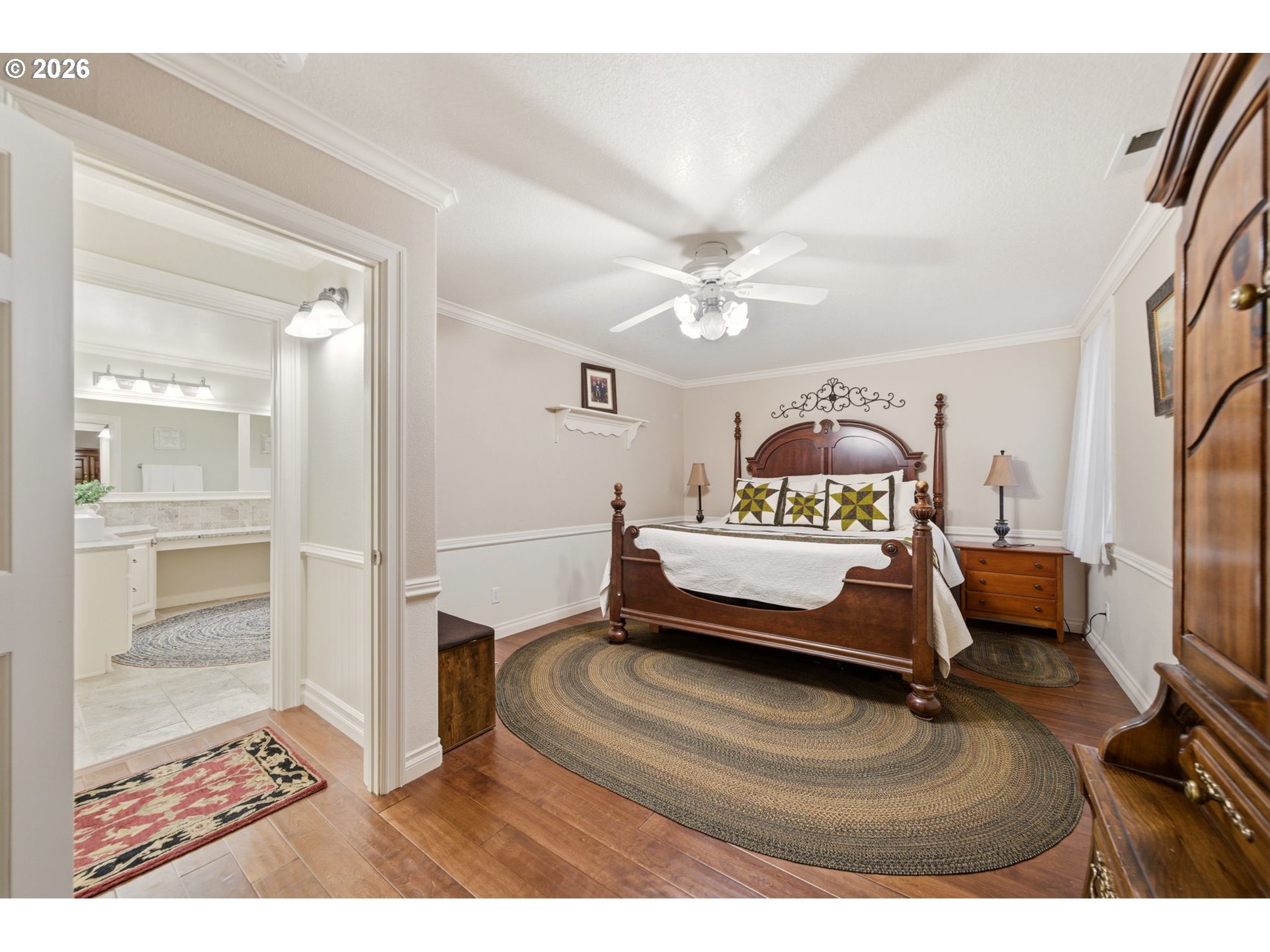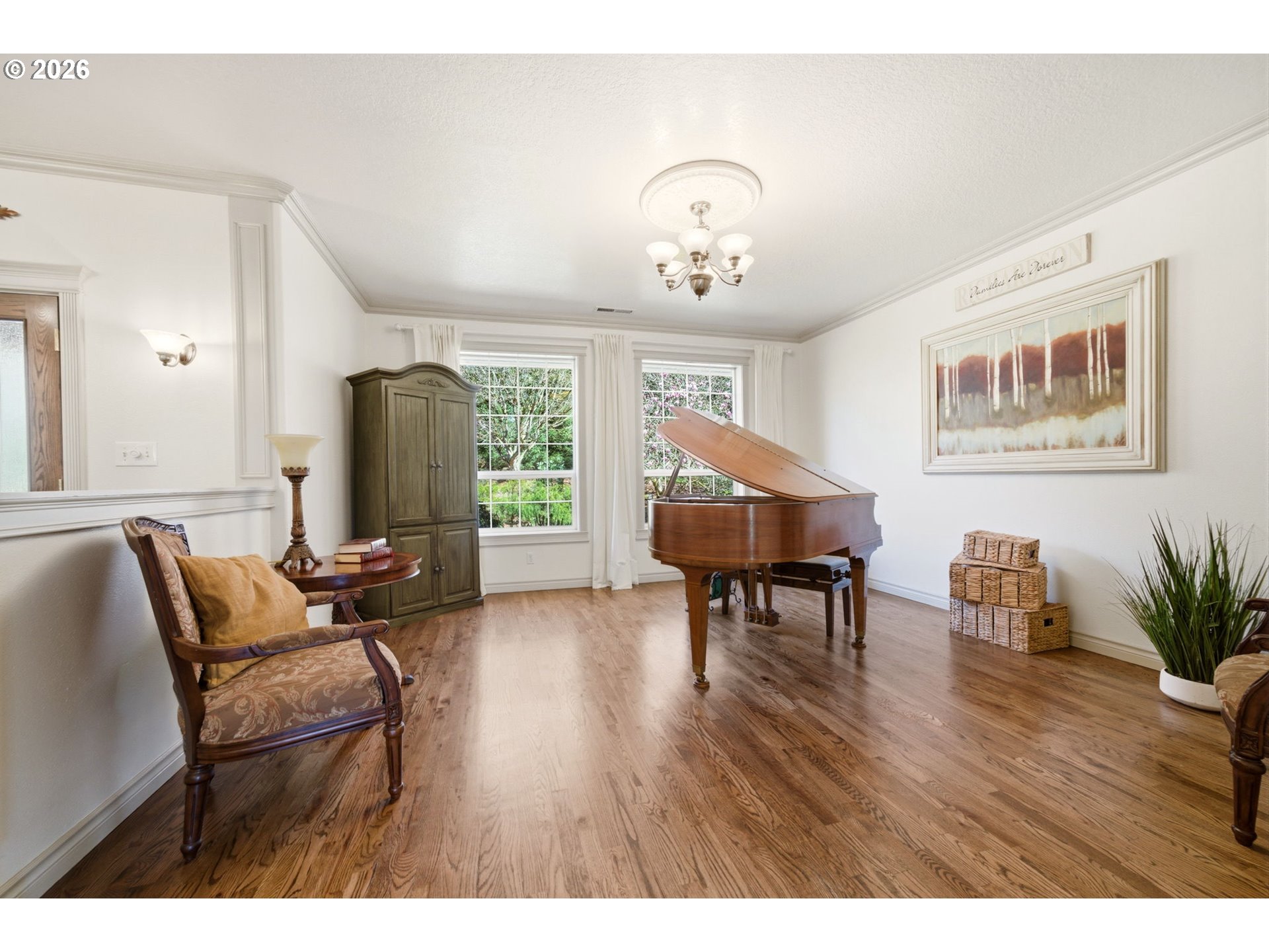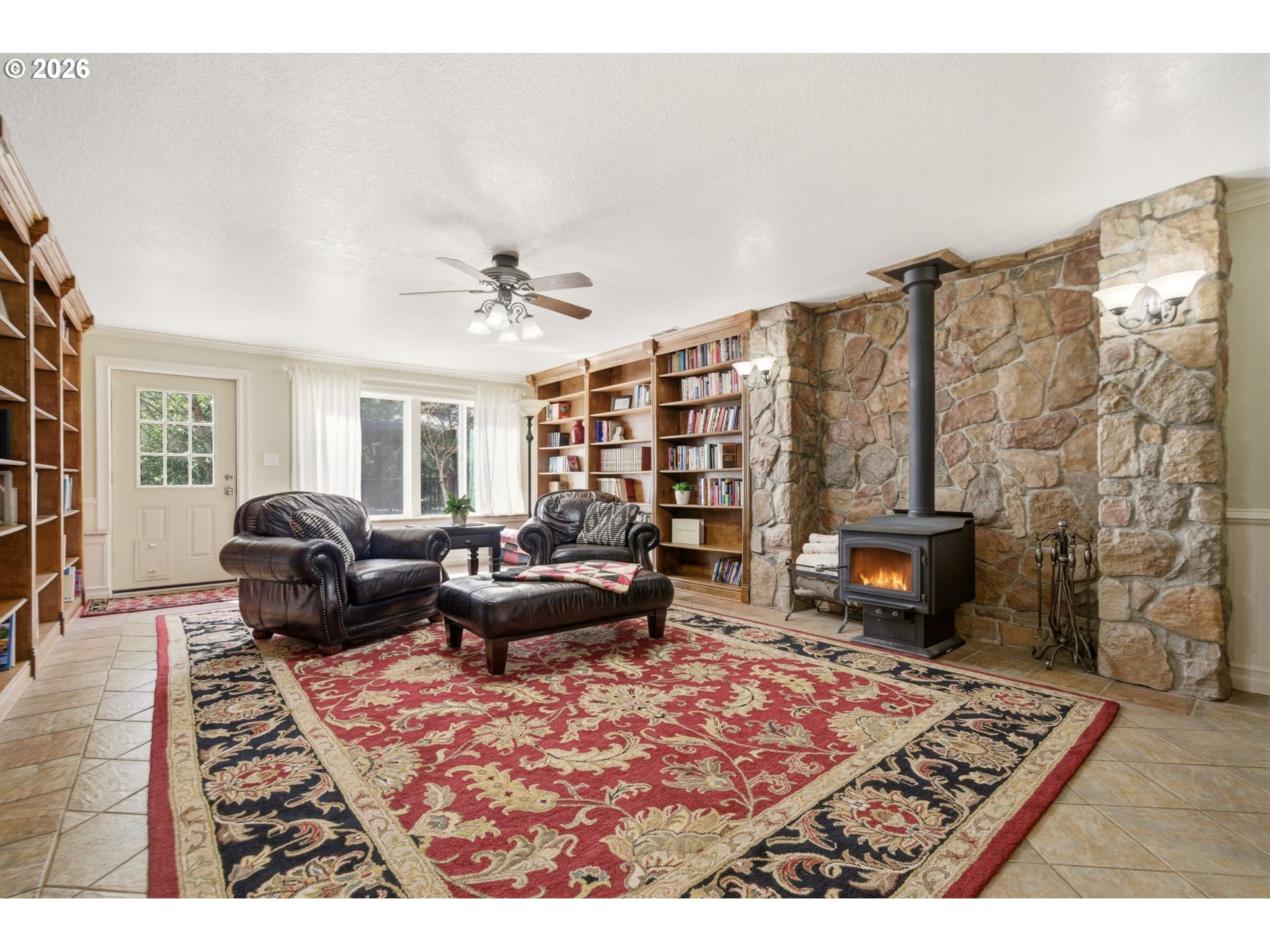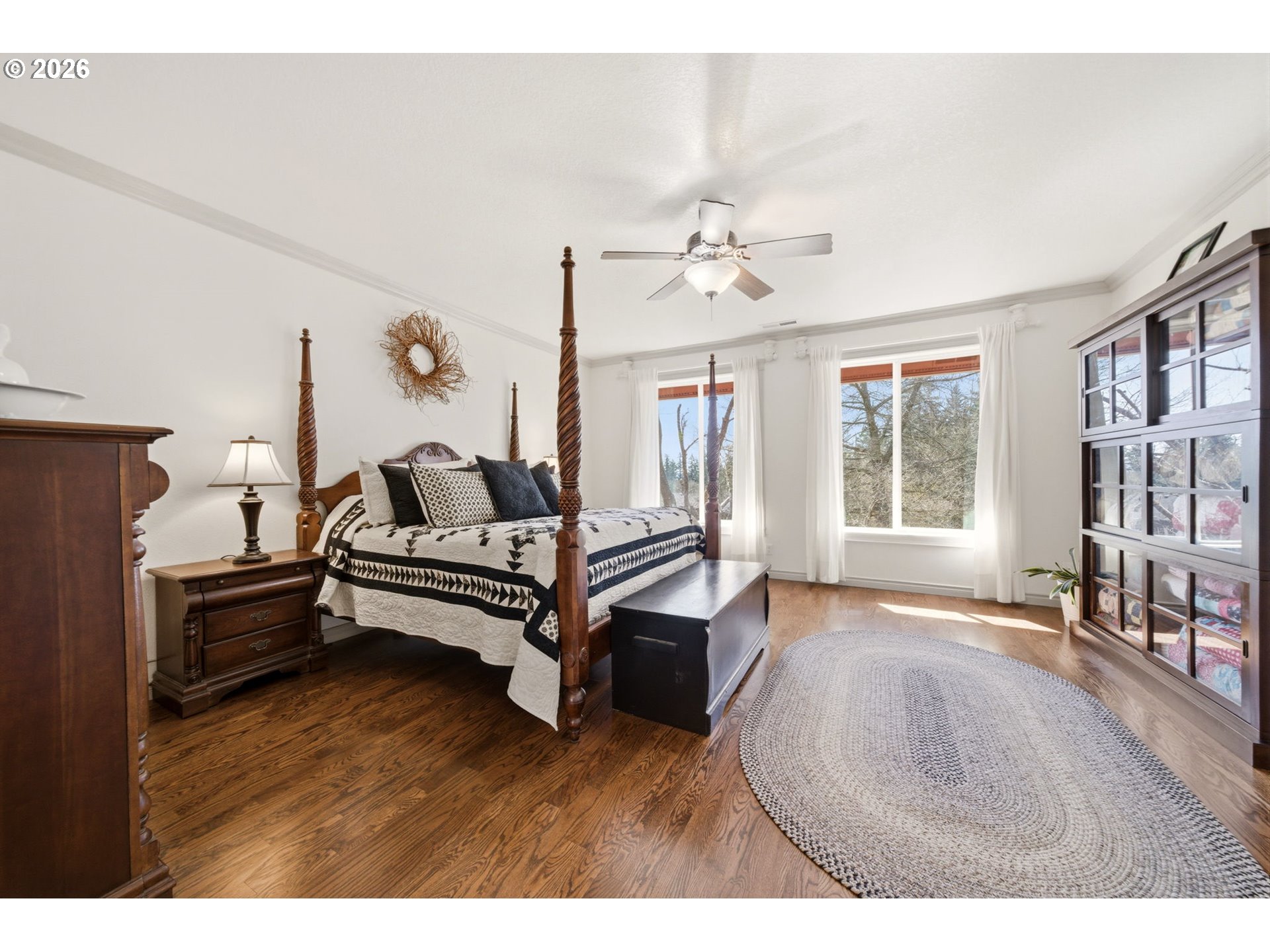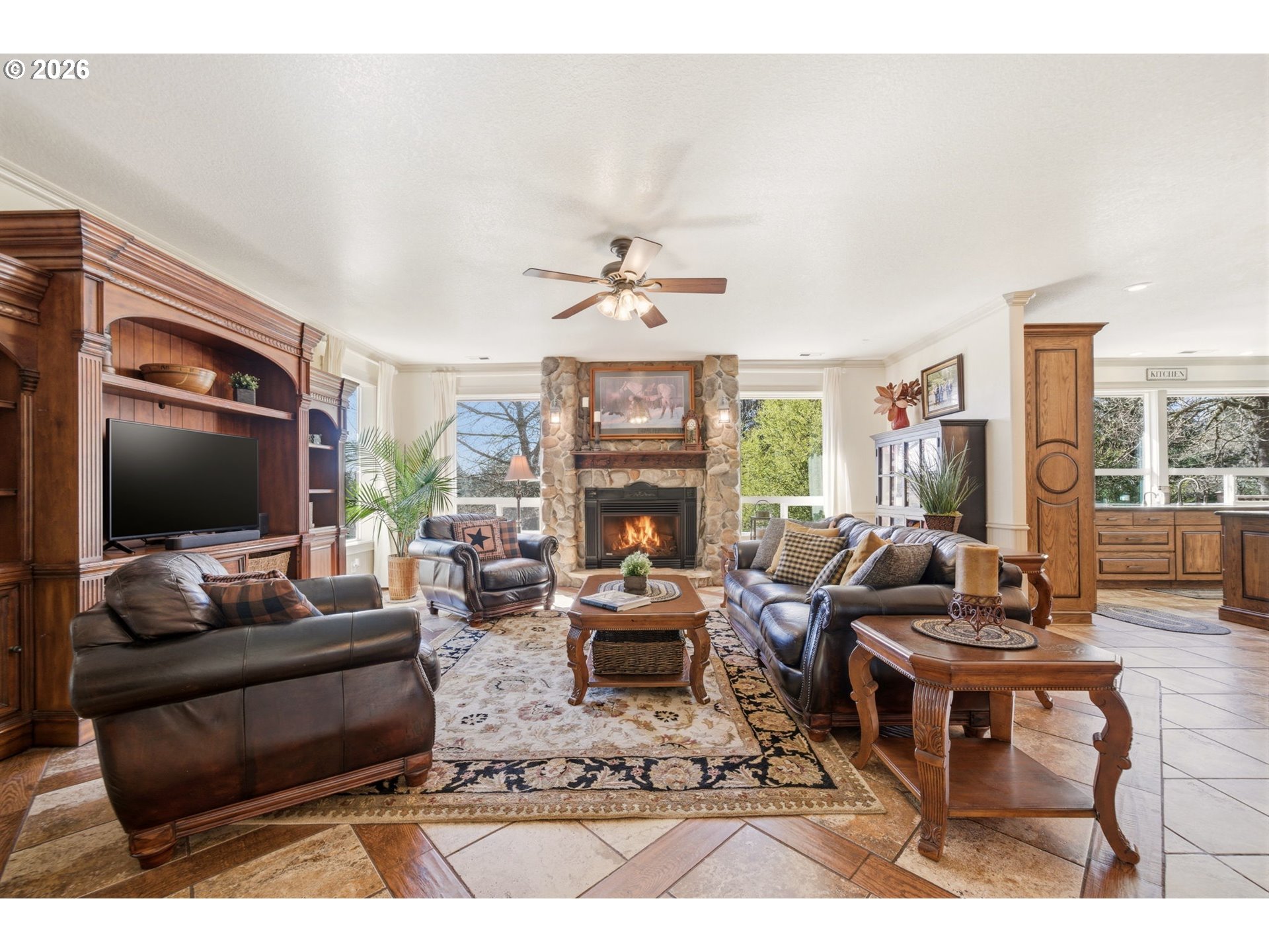 This timeless New England–style Colonial offers refined country living just minutes from downtown Camas, set on over two private, park-like acres directly across from Lacamas Park with immediate access to miles of scenic trails. A striking two-tier waterfall sets the tone as you approach the entrance, welcoming you into beautifully landscaped grounds with year-round color and natural privacy. Spanning more than 4,600 square feet, this custom-built home features an open, light-filled layout with hardwood and tile flooring, extensive custom woodwork, and spaces designed for both everyday living and entertaining. The gourmet kitchen includes a Sub-Zero refrigerator, Wolf range, double Dacor ovens, granite countertops, large island, and picture window overlooking the landscaped grounds. The main level features a primary bedroom and dedicated home office, along with multiple living areas and formal and casual dining spaces. The lower level includes four additional bedrooms, a library with built-ins, and abundant storage. Built for comfort and efficiency with a new Trane heat pump, 98% efficient Lennox furnace, central A/C (2026), R60 insulation, and earthquake-resistant construction. Outdoor living is effortless with multiple spaces for gathering, including a detached deck with gazebo, attached rear deck, built-in barbecue, and brick firepit. For those seeking a self-sustaining lifestyle, the property offers a mature orchard and garden area featuring grapes, raspberries, boysenberries, blueberries, and strawberries, along with a chicken coop and run and a fenced pasture—ideal for a mini farm or homestead. Additional highlights include an attached 2.5-car garage and detached 2-car garage/shop, along with a matching shed, offering ample space for storage, hobbies, and equipment, all combining timeless craftsmanship, modern amenities, and peaceful surroundings.