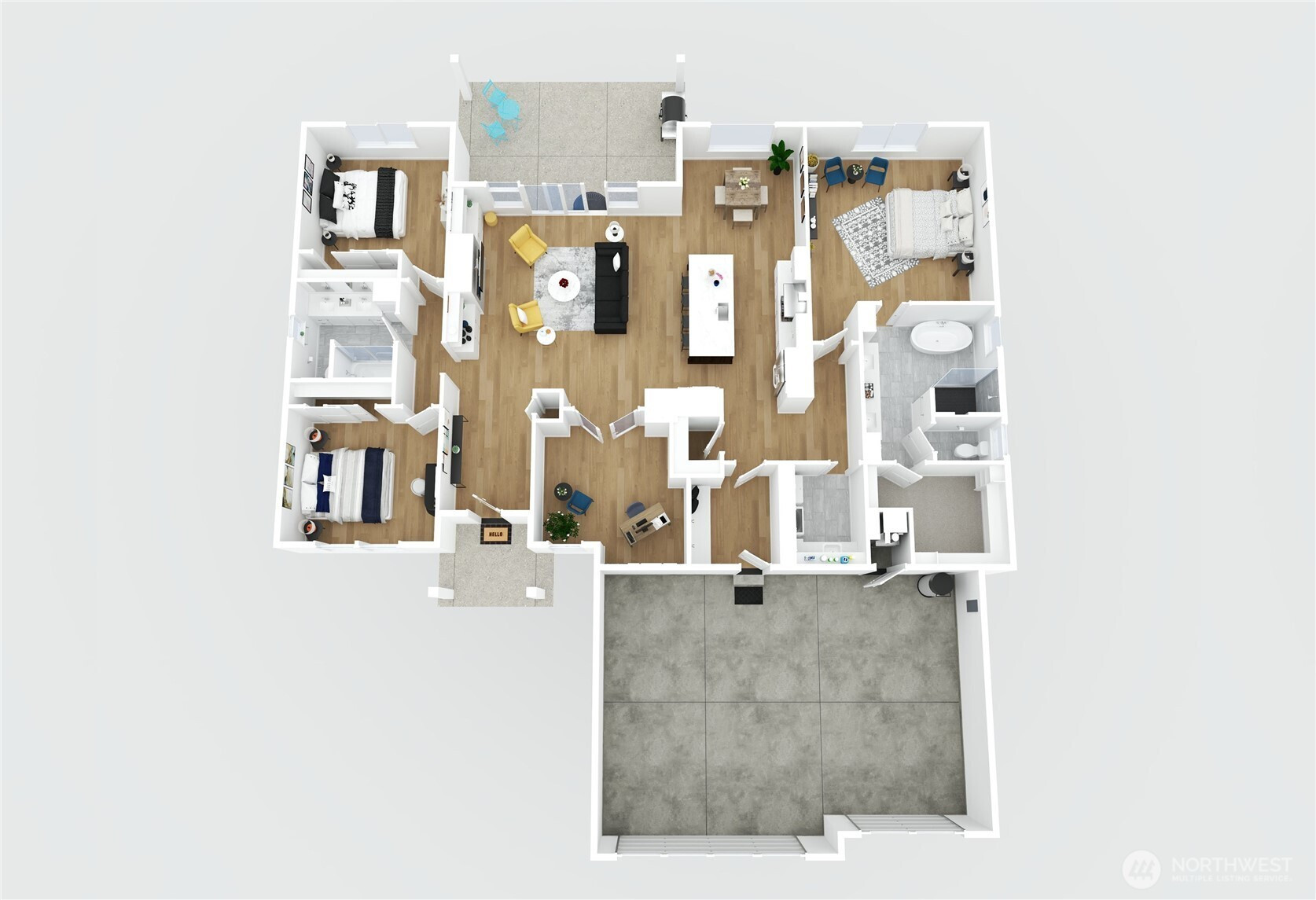 Owner Transferred their Loss is your Gain! Delightful, Turn-Key, 1 Level Home with an Open Flowing Floor Plan. Separated Private Primary Suite to Balance of Remaining Bedrooms, Gently Lived In & Neutral Decor Throughout. Level Driveway & Lot! Extensive Engineered Hardwood Flooring, Gourmet Kitchen with Huge Quartz Island, Gas Cook Top & Open to Great Room & Dining Area with a View of Fireplace, Covered Patio & Back Yard. Tiled Accented Gas Fireplace; Quality Fixtures; French Doors open to Den/Office on Main; All Stainless Appliances Stay; Primary Suite features Double Vanity, Separate Oversized Shower & Full-Standing Soaking Tub + Walk-In Closet. Separate Laundry Rm w/Washer & Dryer, 2 Additional Balanced Sized Bedrooms that are equally accessible to the Main Bath with Double Vanity. Spacious Covered Back Patio for Your 4-Seasons Entertaining; Fenced Level Backyard awaits Your Creative Design & Planting. 3 Car Garage has Room for Toy Cars, Hobbies & or Wood Shop? Located on peaceful Cul-de-Sac Street. Come Take a Look & Stay!