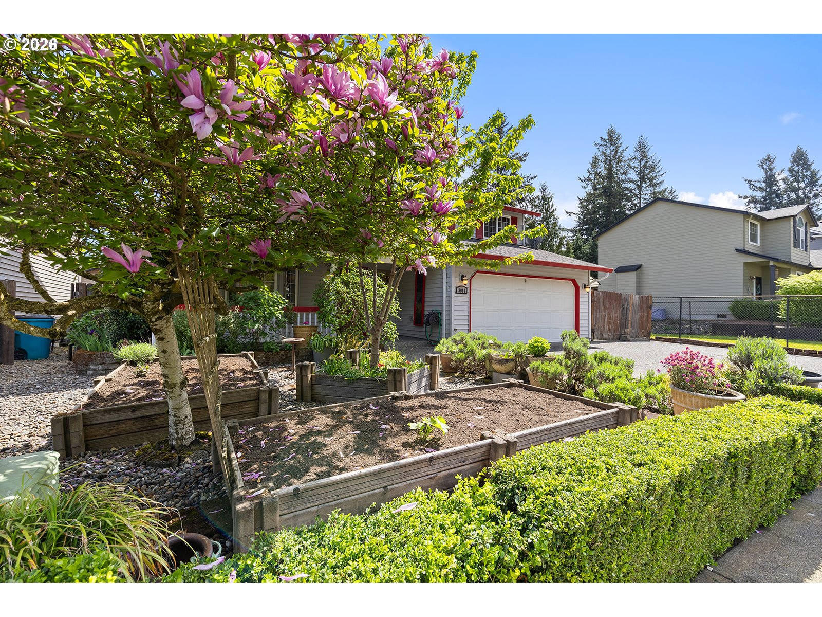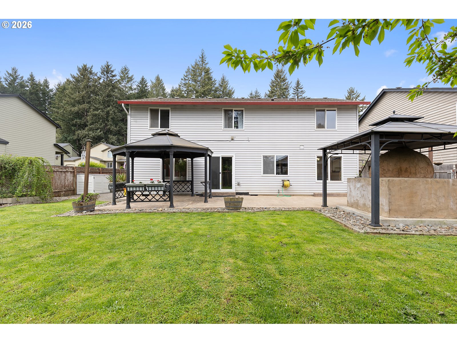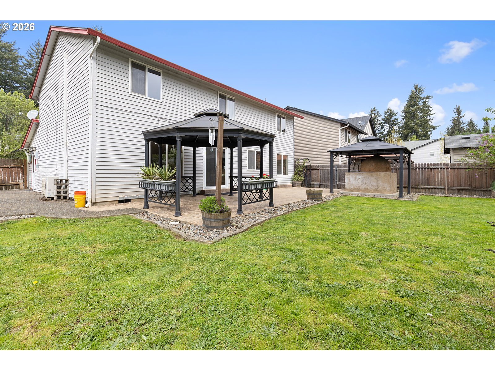 Welcome to a rare 5-bedroom home in the desirable Spring Creek neighborhood, offering the space and flexibility that’s increasingly hard to find. Set on a large, flat lot nestled next to a water retention pond for added privacy with only one neighboring side, this property stands out immediately with level parking, including dedicated RV and/or boat parking. The backyard is designed for both function and enjoyment, featuring an expansive stamped concrete patio, built-in pizza oven (2014), gazebo, and a lofted storage shed—creating a true outdoor retreat. The fully fenced yard is complemented by beautifully established landscaping, with mature shade trees and vibrant blooms including cherry and magnolia trees, along with peonies, jasmine, honeysuckle, and lavender. Inside, the home is clean, refreshed, and move-in ready with new laminate flooring, fresh interior paint, updated trim, and upgraded lighting. The spacious kitchen offers a breakfast bar, oversized pantry, and abundant cabinetry, flowing into both formal and casual living spaces including a dining room, bay window living room, and comfortable family room. Upstairs, all five bedrooms are thoughtfully positioned with ceiling fans and nearby laundry for convenience. The owner’s suite includes dual closets, and both bathrooms have been updated with new flooring and paint. Major system updates include a newer roof (2015), updated electrical panel (2015), Performance Plus hot water tank, and three ductless heat pumps for efficient heating and cooling. With a rare bedroom count, standout outdoor amenities, and practical upgrades already completed, this home offers a compelling combination of space, usability, and value.