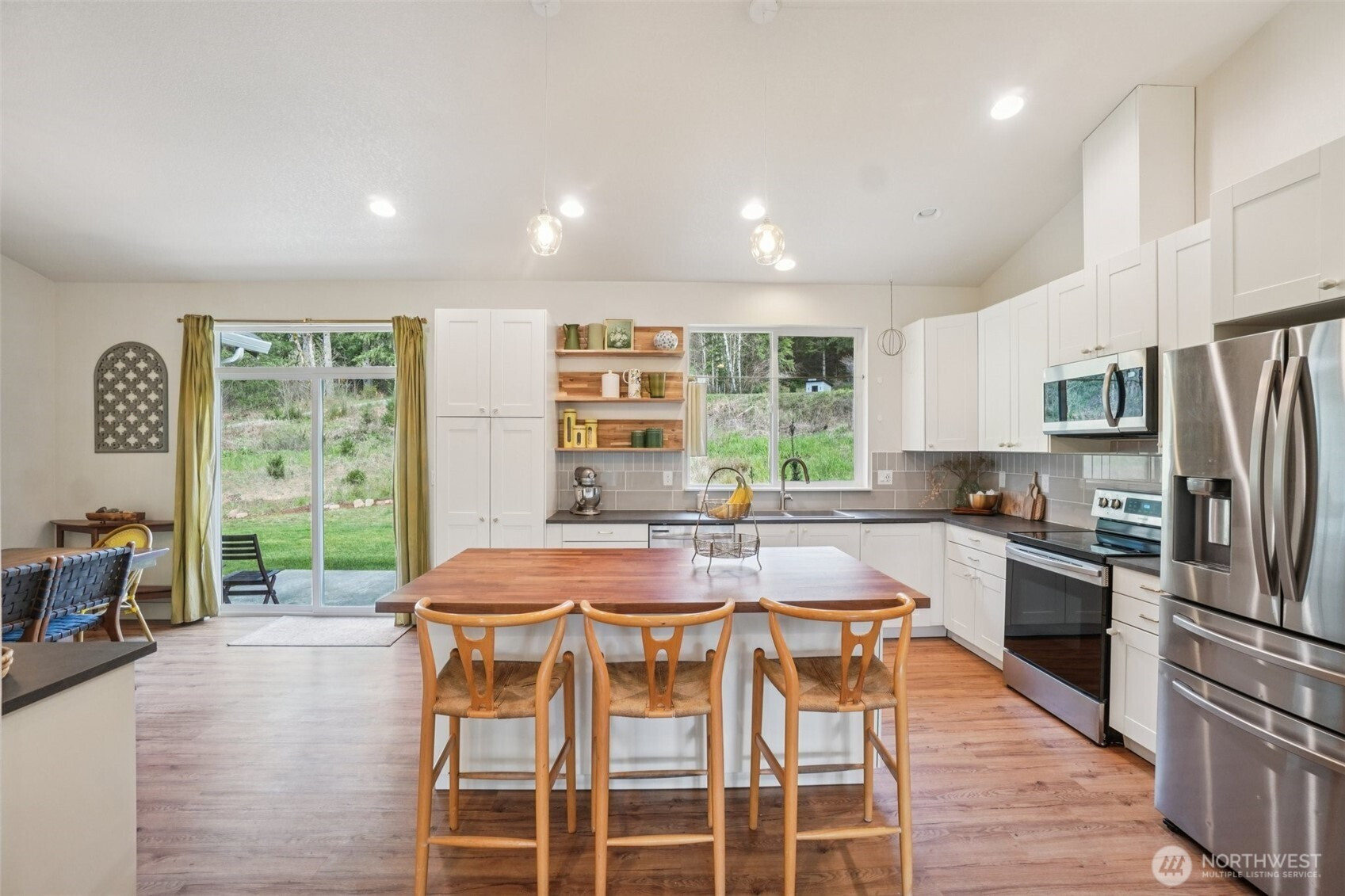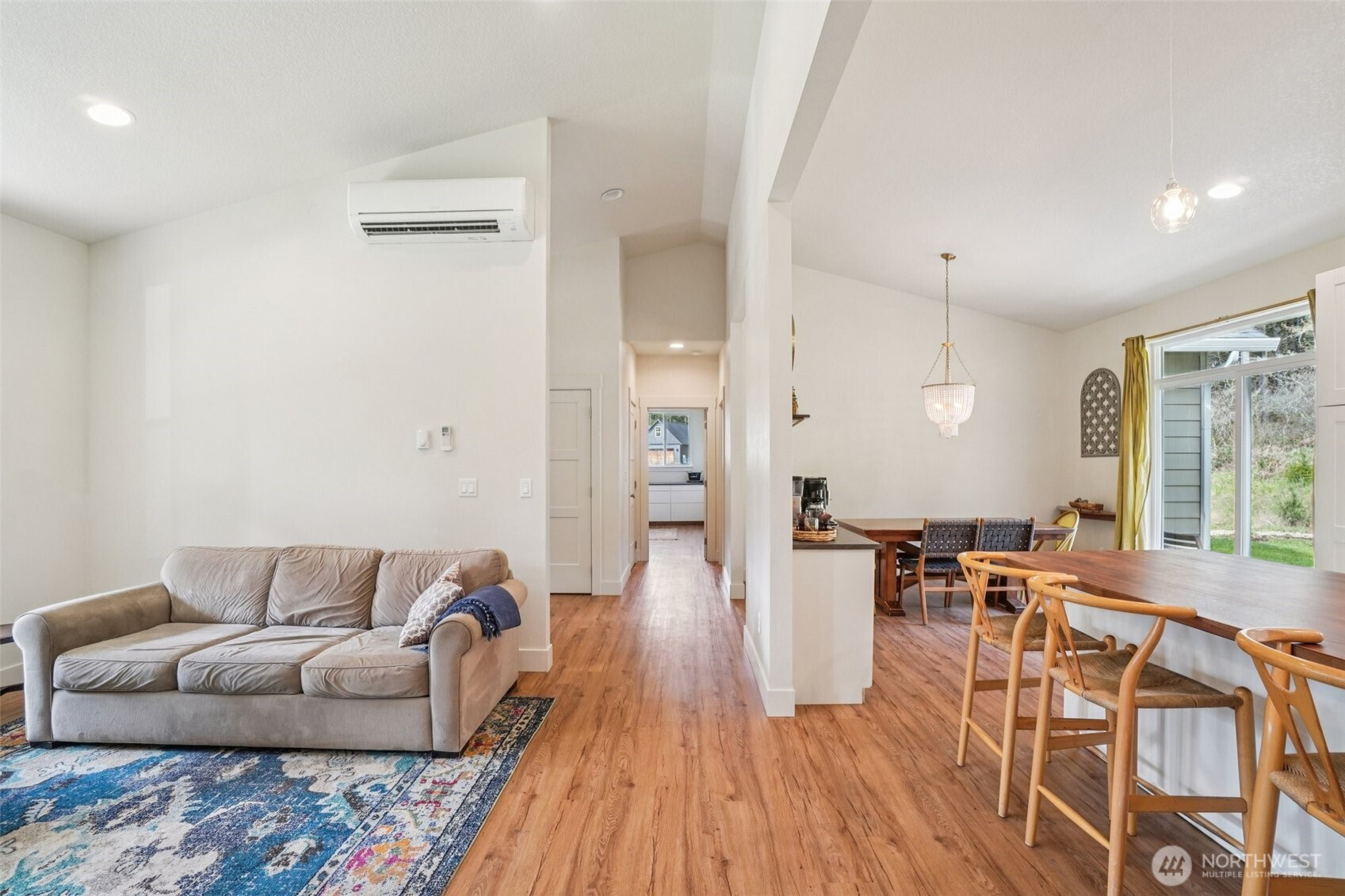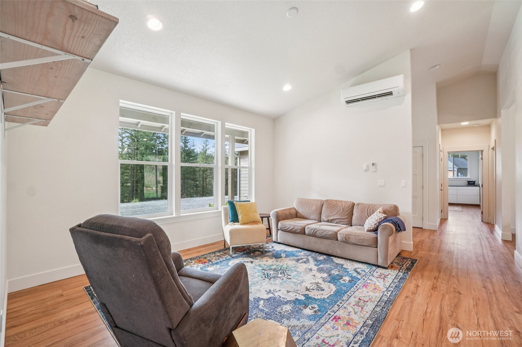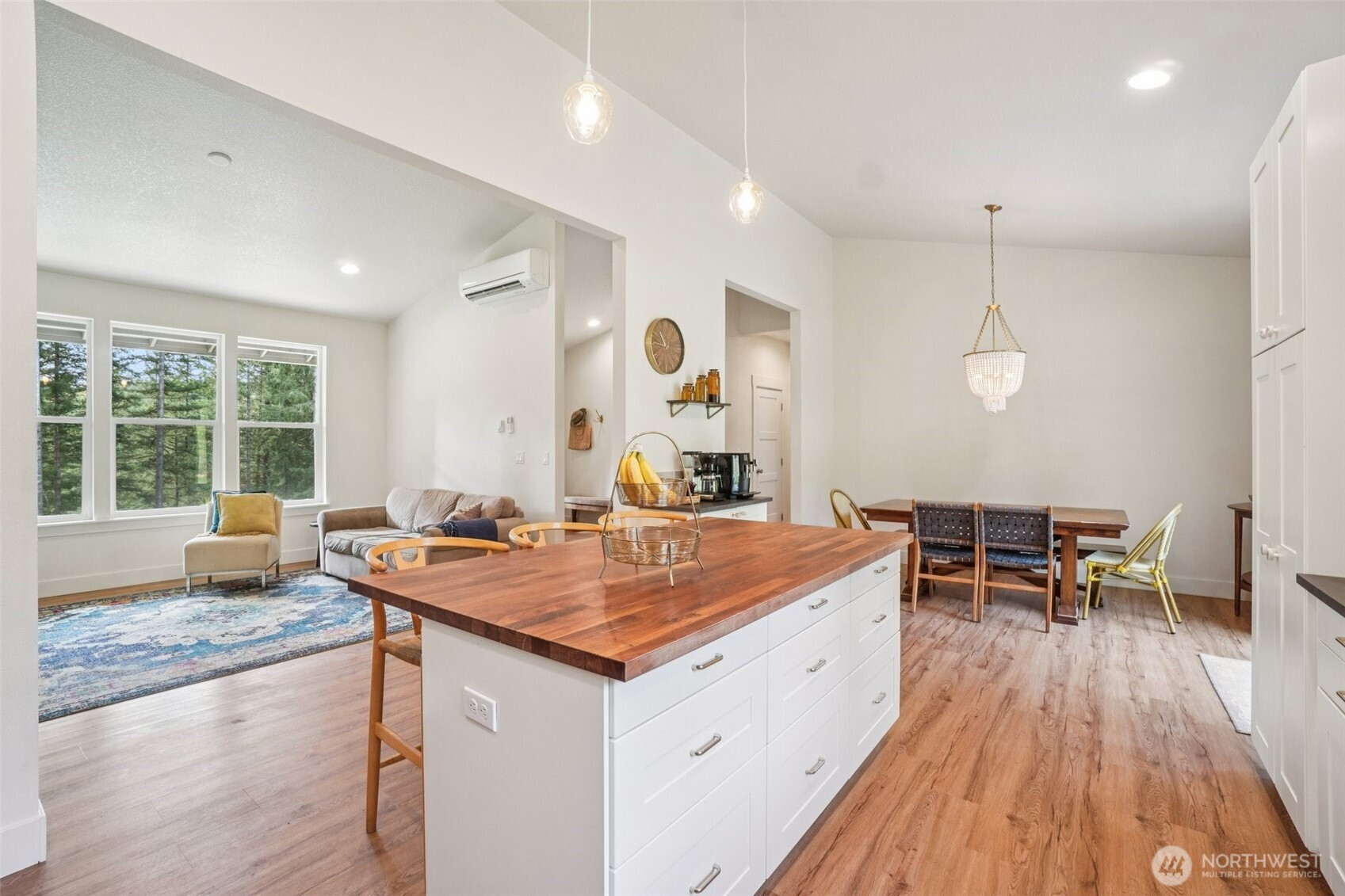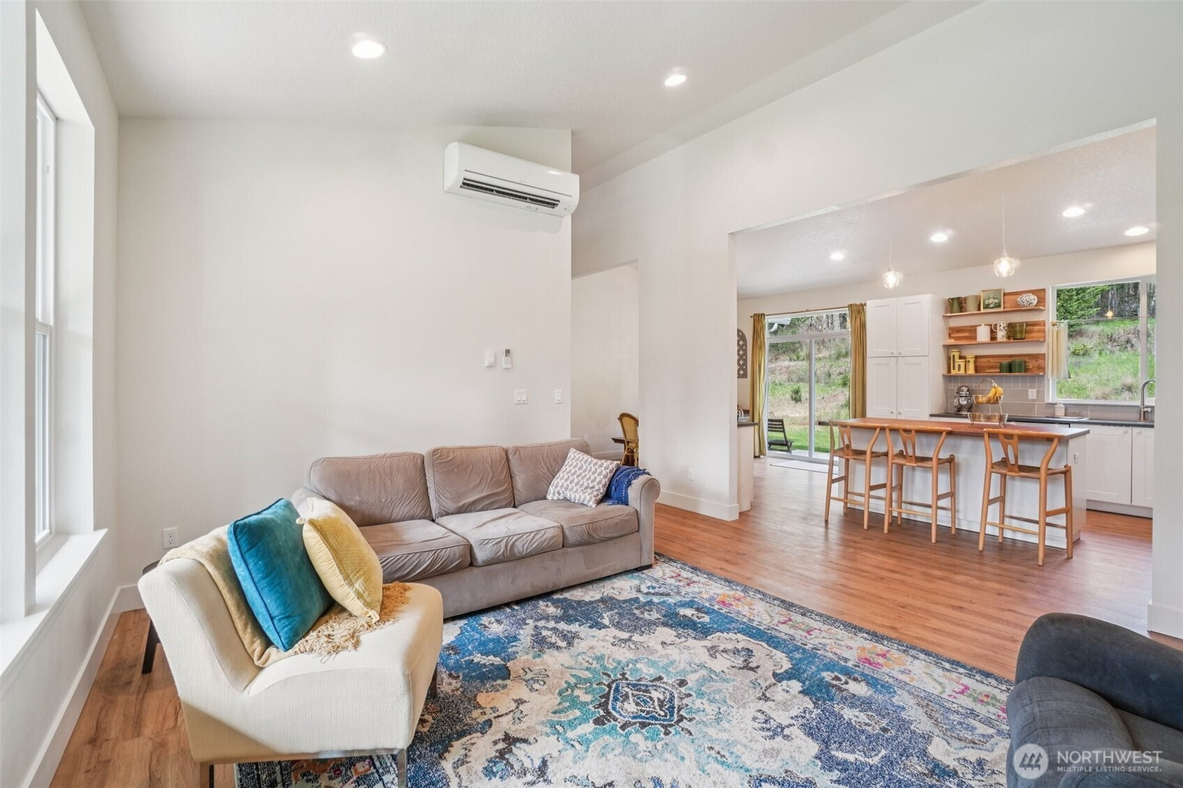 A peaceful, park-like setting, this beautiful 1-level home on 3.42 acres offers the perfect blend of comfort, privacy, and natural beauty with coveted East Fork Lewis River frontage. Right down road from Moulton Falls and Hantwick and Sunset Falls trail heads. Spanning 1,714 sq ft, this 3-bedroom, 2-bath home features a vaulted, open-concept main living area that feels bright and spacious. The thoughtful layout places the primary suite on one end of the home for added privacy, with two additional bedrooms on the opposite side. The kitchen is designed for both function and style, complete with an island, stainless steel appliances, tile backsplash, and abundant cabinet space. The dining area opens to a back patio through a sliding glass door—perfect for enjoying the serene surroundings and sounds of the river. Energy-efficient mini splits provide year-round comfort with both heating and cooling. Whether you're relaxing at home or exploring nearby outdoor recreation, this property offers a rare opportunity to enjoy riverfront living in a truly tranquil setting.