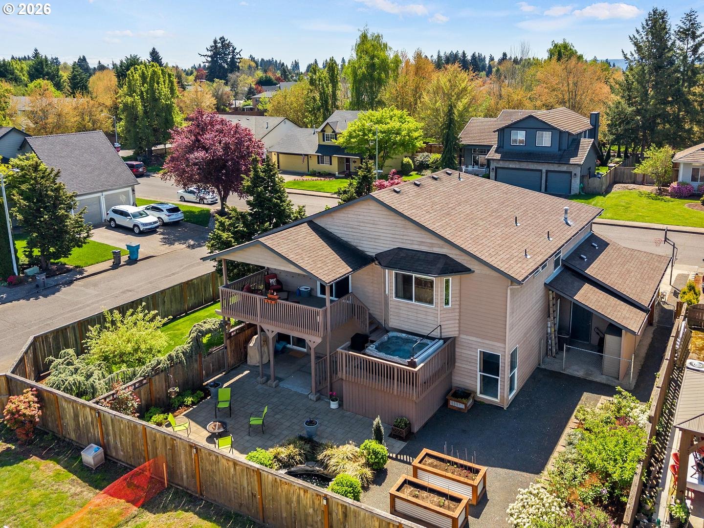 Discover this Felida gem on a beautifully landscaped corner lot! The inverted floor plan puts your main living spaces — kitchen, family room, living room, dining room, and primary suite — upstairs, flooding them with natural light and treetop views. The chef's kitchen features granite counters, stainless appliances, a butler's pantry, and an island, flowing seamlessly into the vaulted family room with gas fireplace. The spacious primary suite includes a walk-in closet and a stunning remodeled en-suite bath. The main level offers incredible flexibility with a massive bonus room, kitchenette, office, bedroom, half bath, and laundry — perfect for guests, a home gym, or multi-gen living. Outside, enjoy a covered deck, paver patio, hot tub, two water features, raised garden beds, and a lush side yard — all fully fenced. The 3-car garage adds to the exceptional value rarely found at this price point.Newer roof (2018), updated carpet, and full backyard landscaping refresh (2020). Close to shopping, parks, and dining. All appliances included!