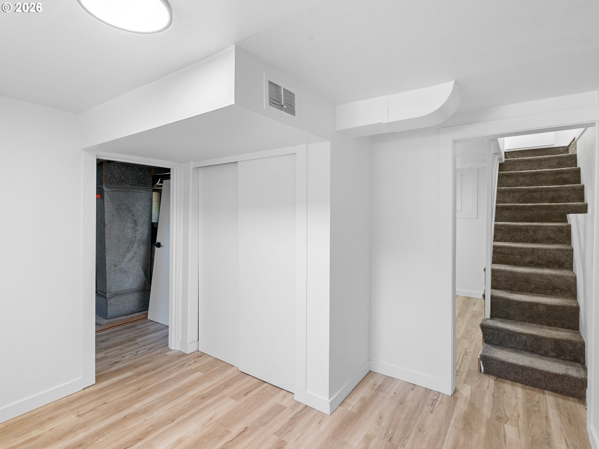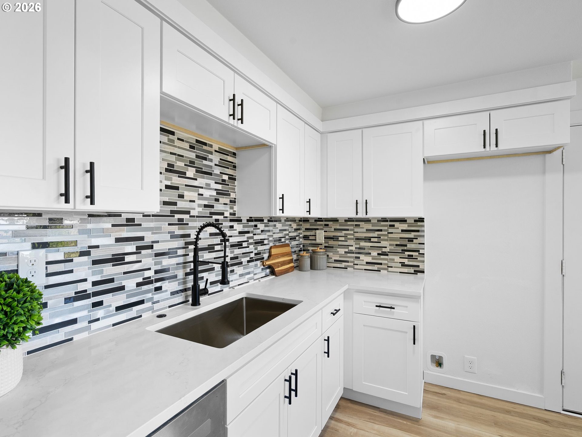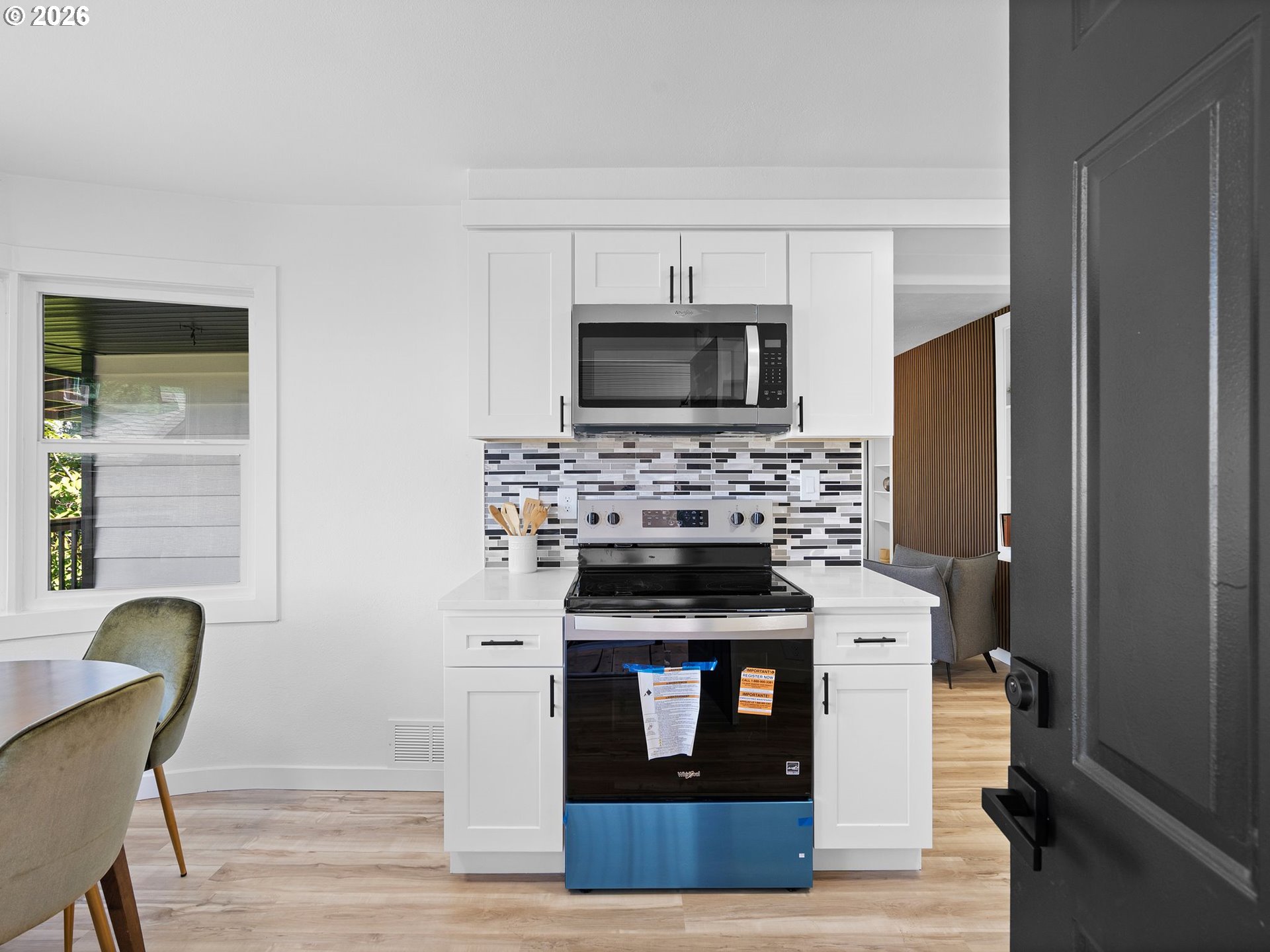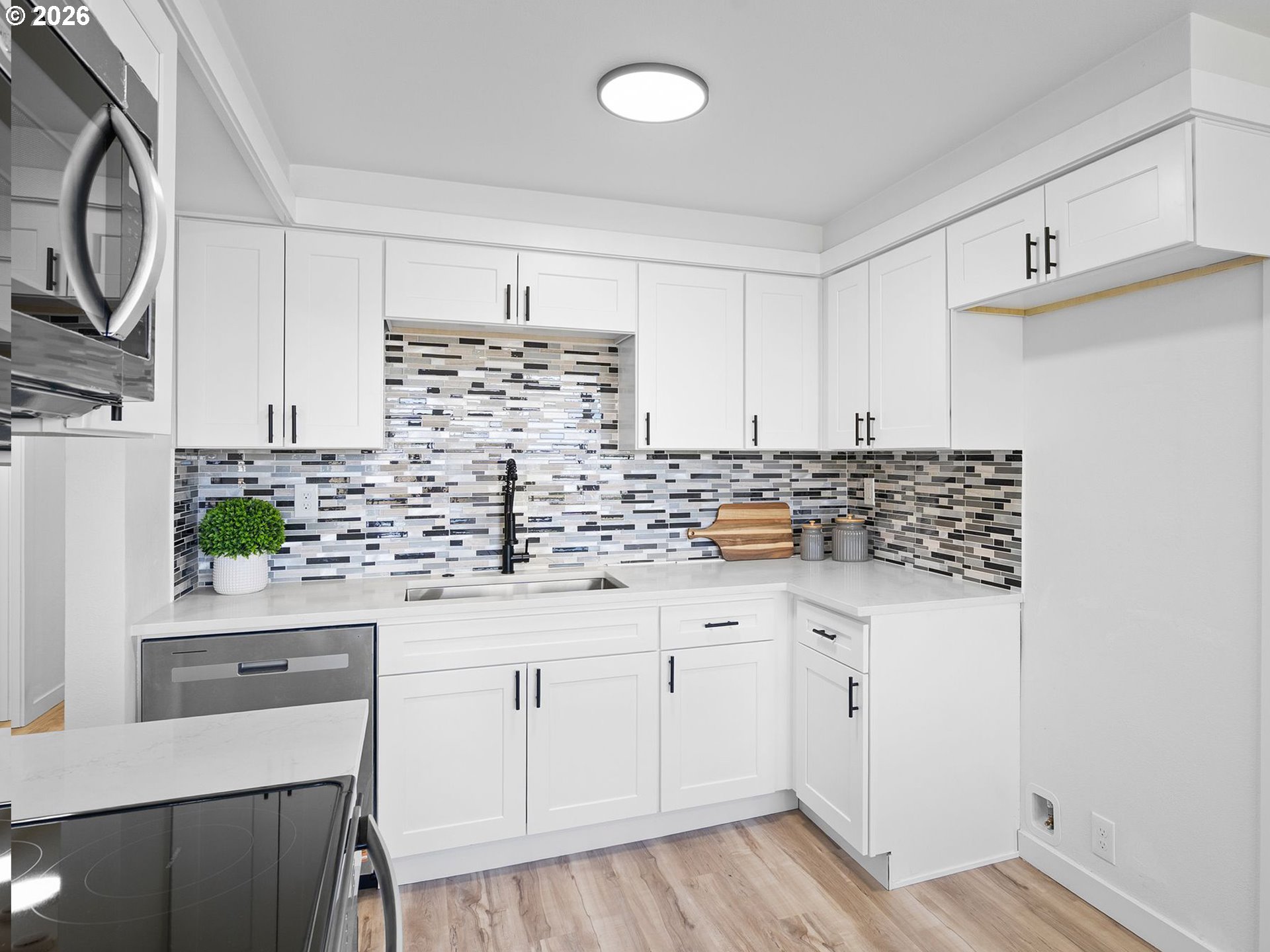 Some homes check boxes. This one stops you in your tracks.Set on nearly half an acre in Vancouver, this fully remodeled mid-century ranch backs to a natural wooded ravine with the kind of privacy and treetop views that make you forget you're minutes from I-5, Hwy 14, Clark College, and everyday shopping. The covered deck is where you'll spend most of your time, morning coffee, evening wind-down, rain or shine and it's covered, so the Pacific Northwest weather is never an excuse to go inside.Inside, the remodel was done right. New kitchen with quartz countertops and new appliances, new flooring throughout, and an updated bath. The living room features a designer wood panel accent wall with built-in shelves that give it real character. The curved bay dining nook looks out over the treetops and is the kind of spot you sit down in and don't want to leave. French doors connect the living space straight to the deck and the indoor-outdoor flow is effortless.Downstairs, the daylight basement with exterior entrance adds two additional rooms plus laundry. The lot is nearly half an acre zoned R-9 with ADU and development potential, buyer to verify with the City of Vancouver. Oversized driveway with RV parking and detached garage round it out.