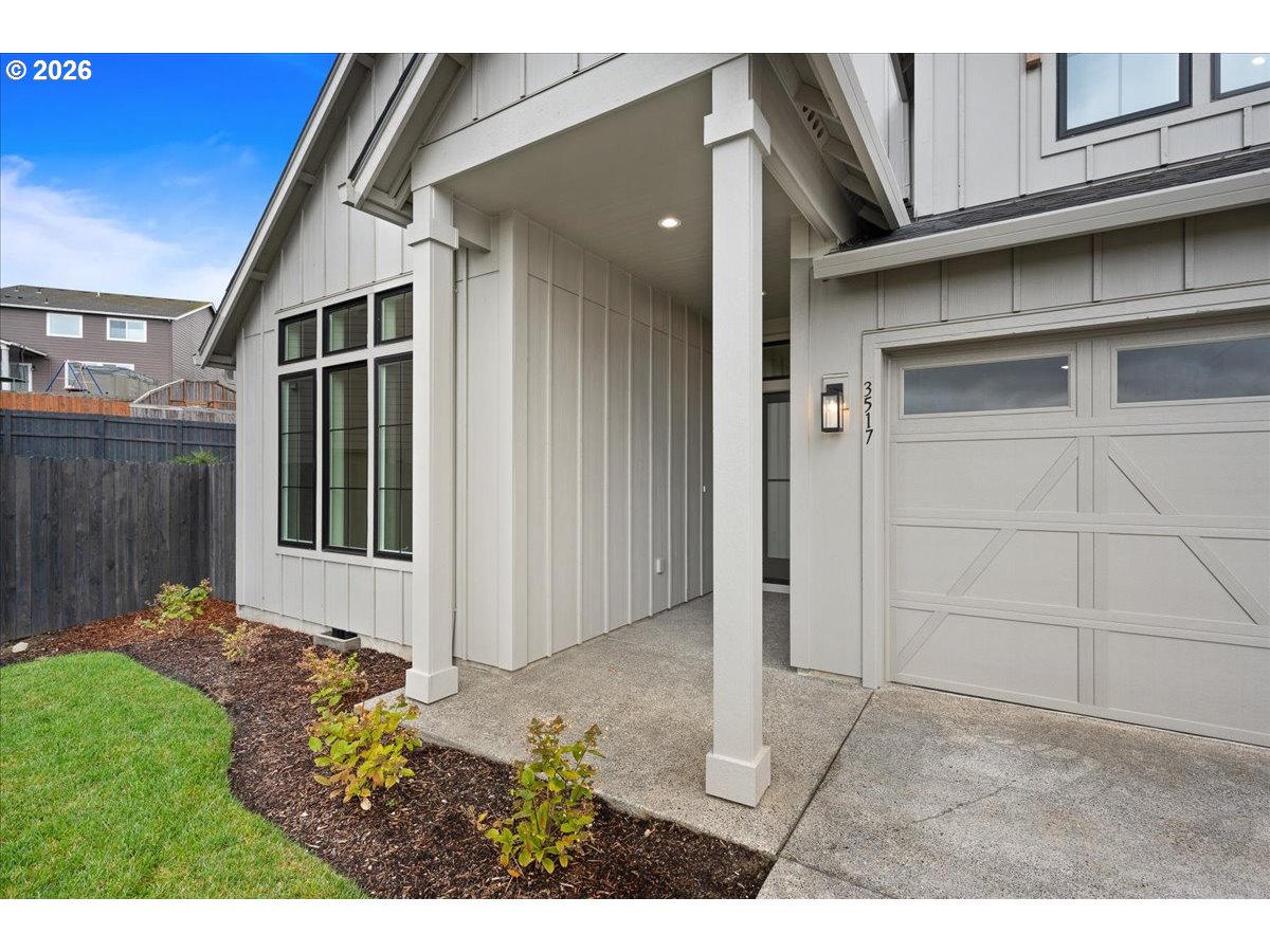 Move-In Ready Home! Photos and virtual tour are of this beautiful new home. Welcome to Paradise Pointe Estates, one of Ridgefield’s newest and most desirable communities. Nestled among mature trees with stunning mountain views, this thoughtfully designed neighborhood offers extensive walking trails, multiple playgrounds, and a serene, nature-focused setting, all while providing convenient access to I-5 and nearby shopping. This Modern Farmhouse-style two-story home showcases quality craftsmanship, modern design, and exceptional attention to detail. The floor plan features 3 bedrooms with a main-level primary suite, an upstairs bonus room with wet bar, 2.5 bathrooms, and a spacious 2-car garage. The gourmet kitchen is beautifully appointed with a large island, walk-in pantry, quartz countertops, and premium KitchenAid appliances, flowing seamlessly into an open-concept great room with soaring 12-foot ceilings and a dramatic floor-to-ceiling linear gas fireplace. The luxurious primary suite offers dual sinks set in a sleek vanity, a spacious walk-in closet, a custom-tiled shower, and a large modern soaking tub designed for ultimate relaxation. Additional features include 8-foot doors and oversized windows on the main floor, creating a bright and open living environment filled with natural light. Enjoy seamless indoor-outdoor living with a generously sized covered outdoor entertaining area—perfect for gatherings and year-round enjoyment. The home also features a beautifully landscaped yard with sprinkler system and full fencing for added privacy and convenience. Additional highlights include central A/C for year-round comfort. Schedule your visit today and experience this exceptional home at Paradise Pointe Estates. Open on weekends or by appointment.