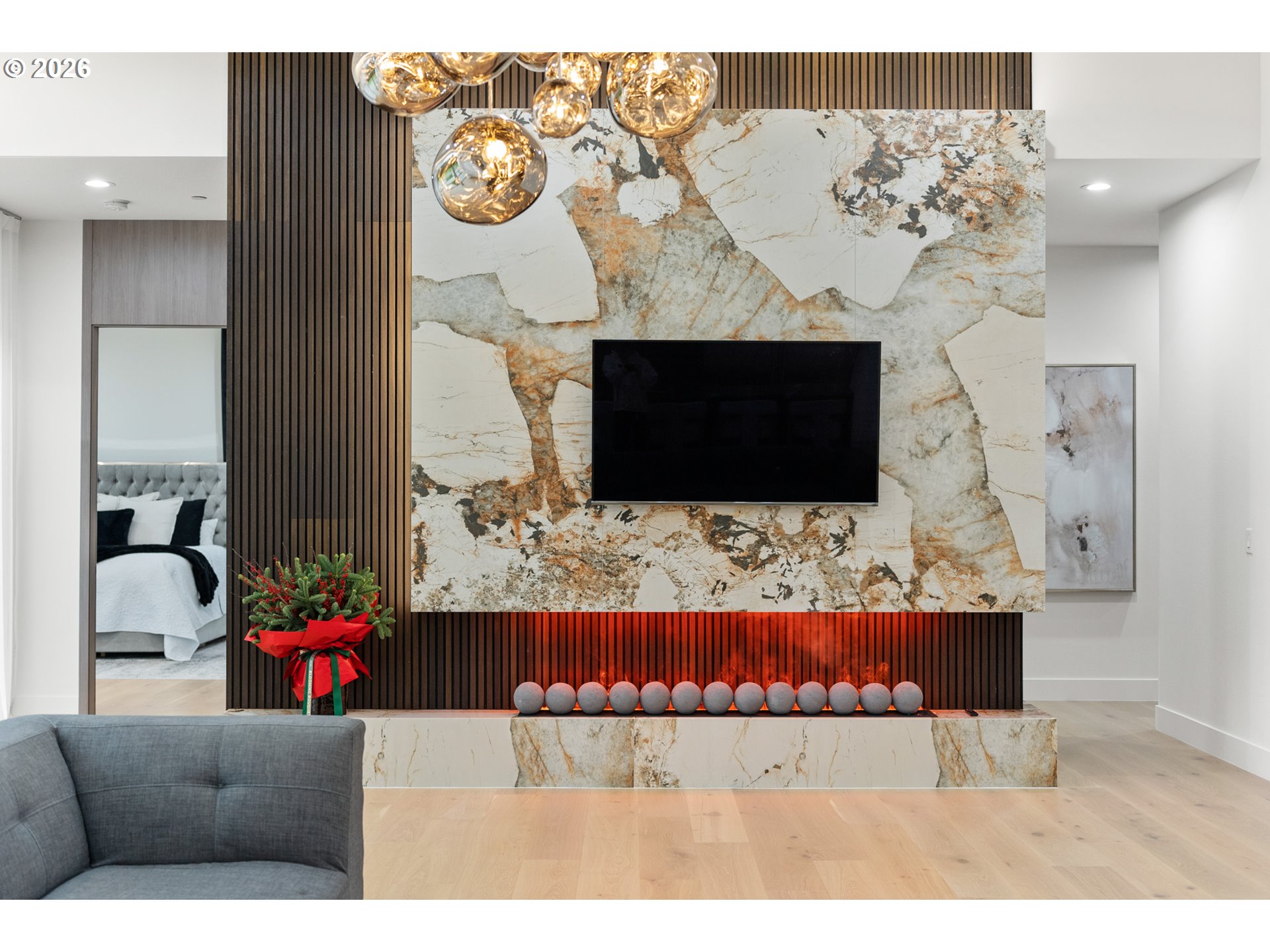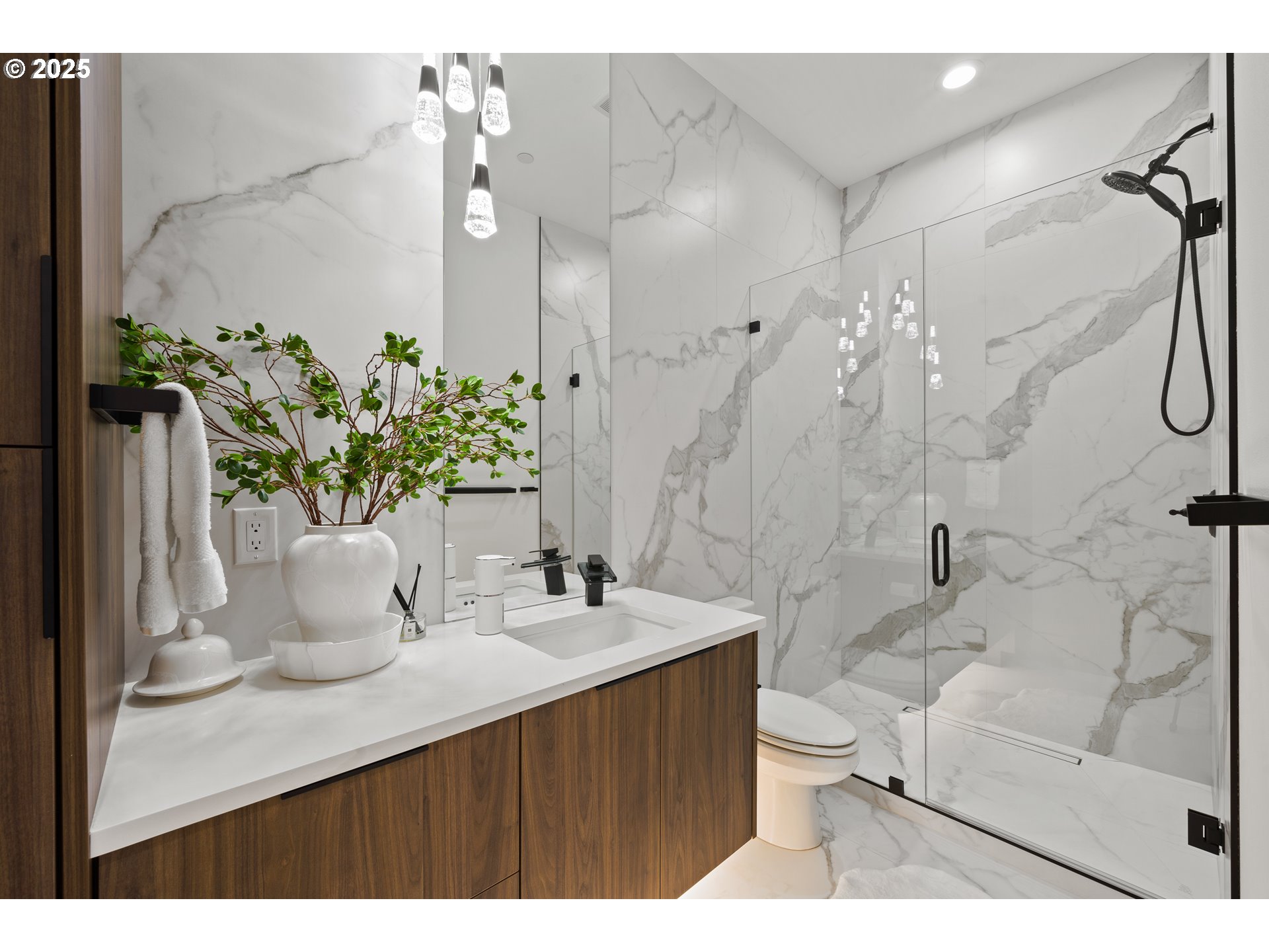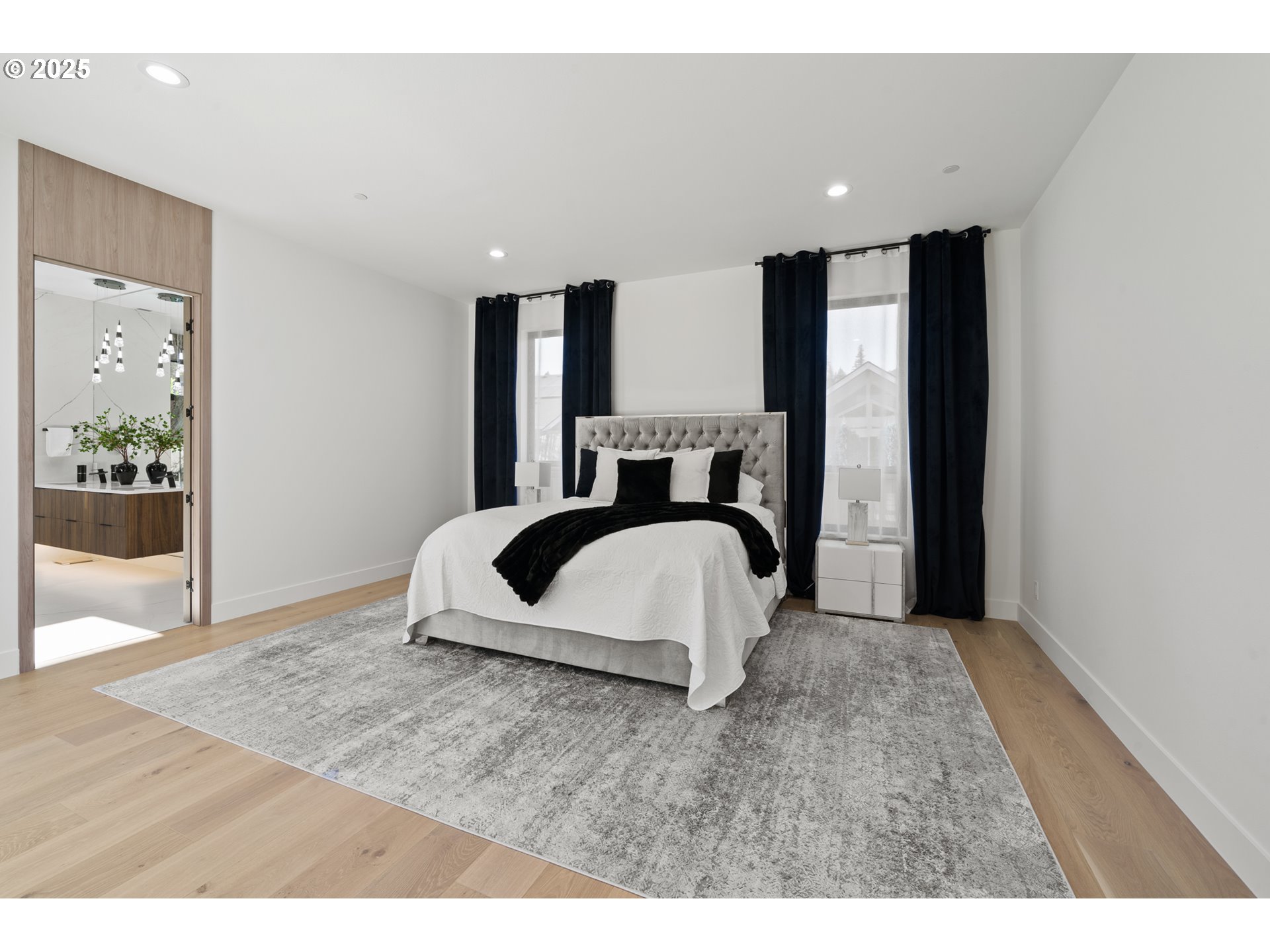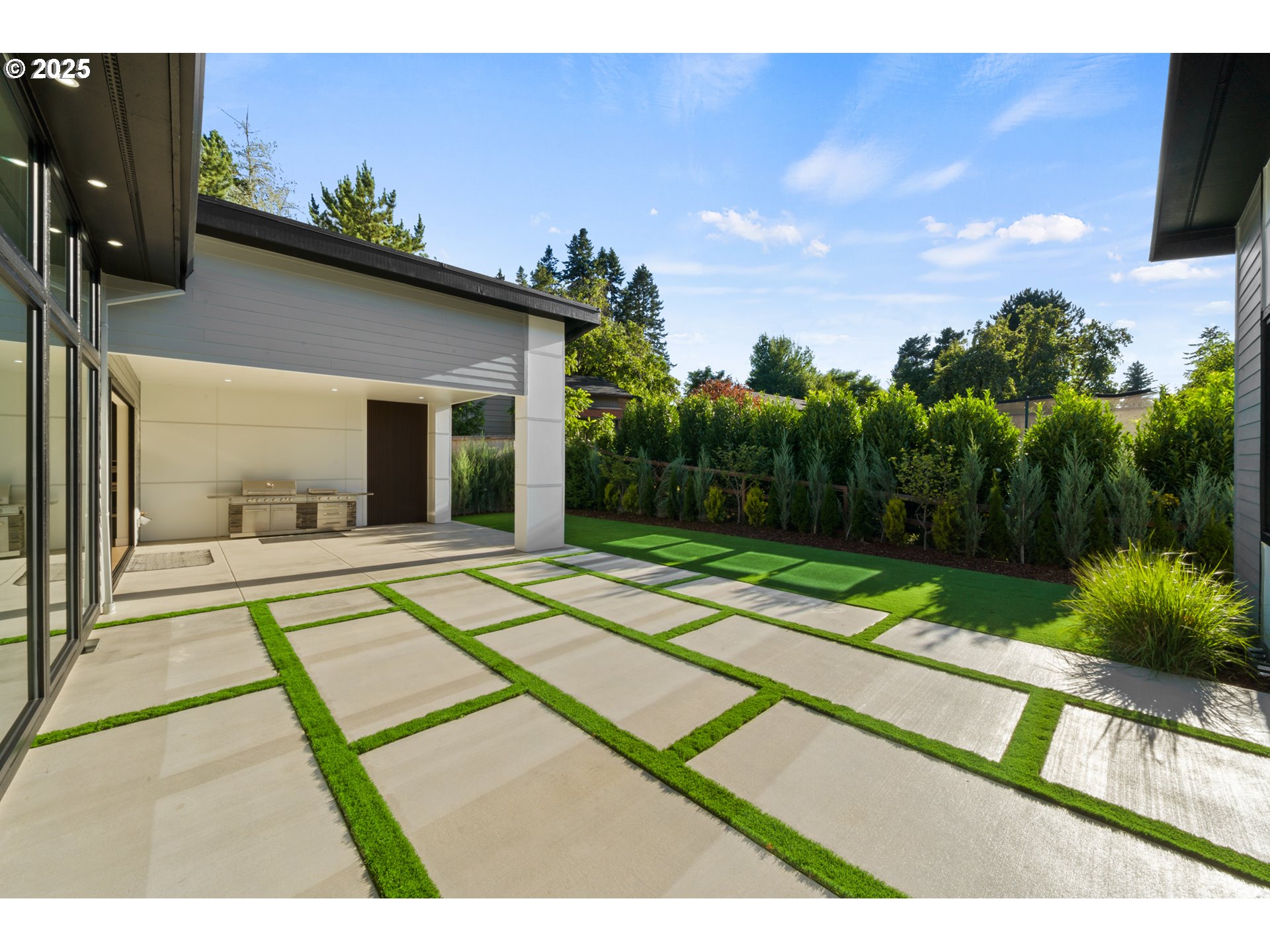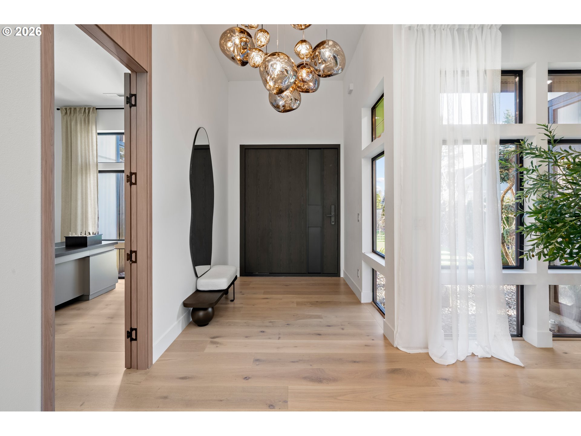 A one-of-a-kind contemporary masterpiece where every detail is intentional and every day feels like a luxury retreat. Designed with innovative architecture and true custom craftsmanship, this single-level residence sits on an oversized 0.32-acre lot, blending striking design with effortless livability. Walls of windows flood the home with natural light, highlighting custom chandeliers, sleek LED accents, and rich engineered hardwood floors. At the heart of the home, a dramatic dark-toned kitchen stuns with a massive marble waterfall island, built-in Sub-Zero refrigerator, induction range, and seamless cabinetry. The open-concept living space flows to a statement-making water vapor fireplace finished in tile, while two folding panel doors open to a private covered patio with a built-in grill and a lushly landscaped courtyard with low-maintenance turf for year-round entertaining. The secluded primary suite offers a spa-inspired bath with heated floors, soaking tub, walk-in shower, boutique-style custom closet, and refined built-ins. Two additional bedrooms include one with its own en suite, plus an office/den for added flexibility. Additional highlights include RV parking on the side of the home with a dedicated RV outlet, providing convenient space for travel storage or guests. Fresh air systems ensure continuous indoor air quality and comfort, while the low-maintenance yard allows you to enjoy the beauty of your surroundings without the hassle. With the Washougal River just minutes away and the Portland Airport a short drive, you’ll love the balance of peaceful living and easy access to amenities.