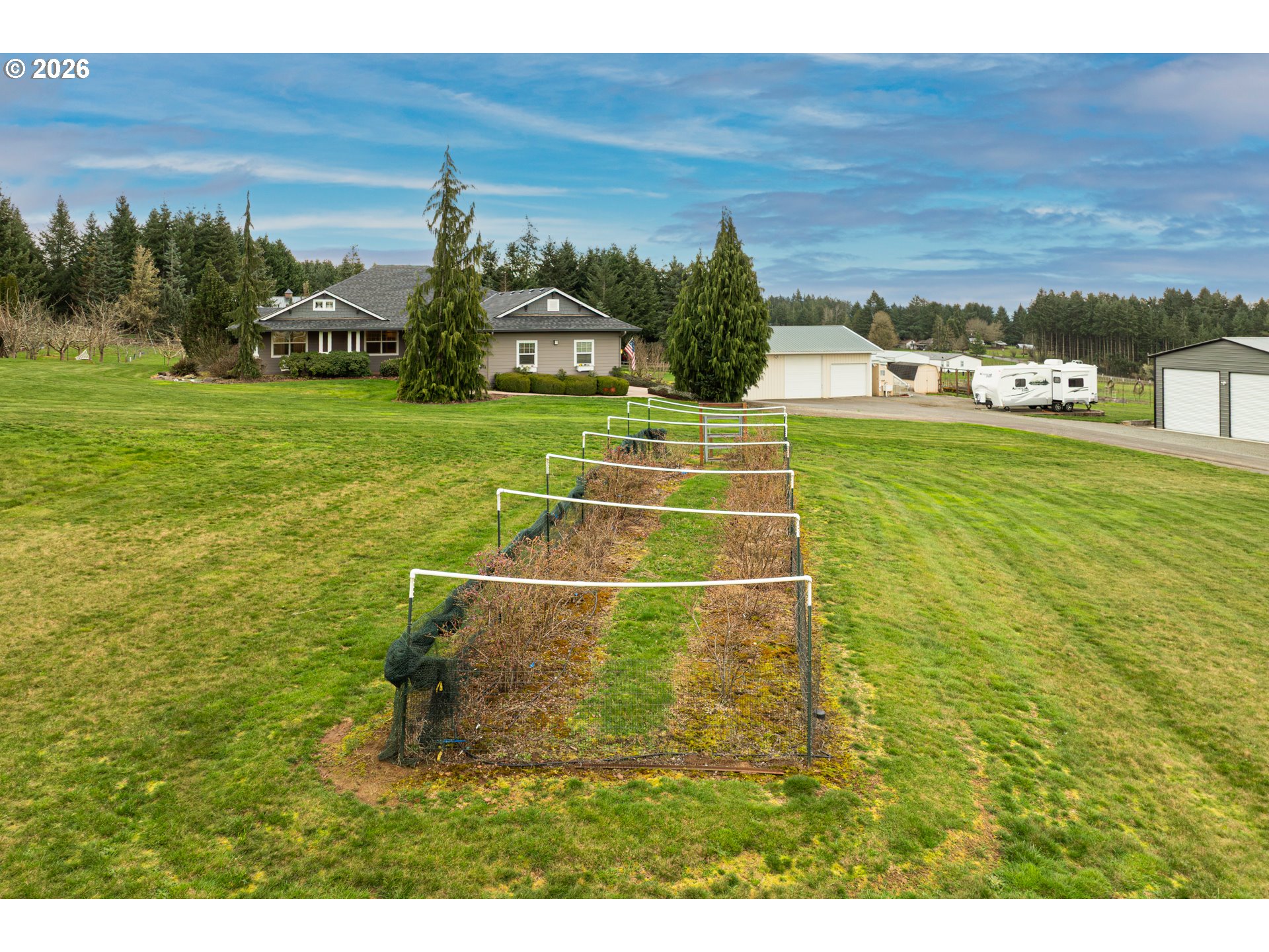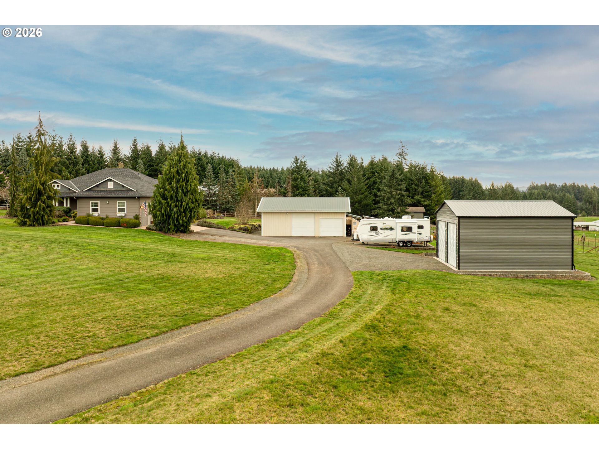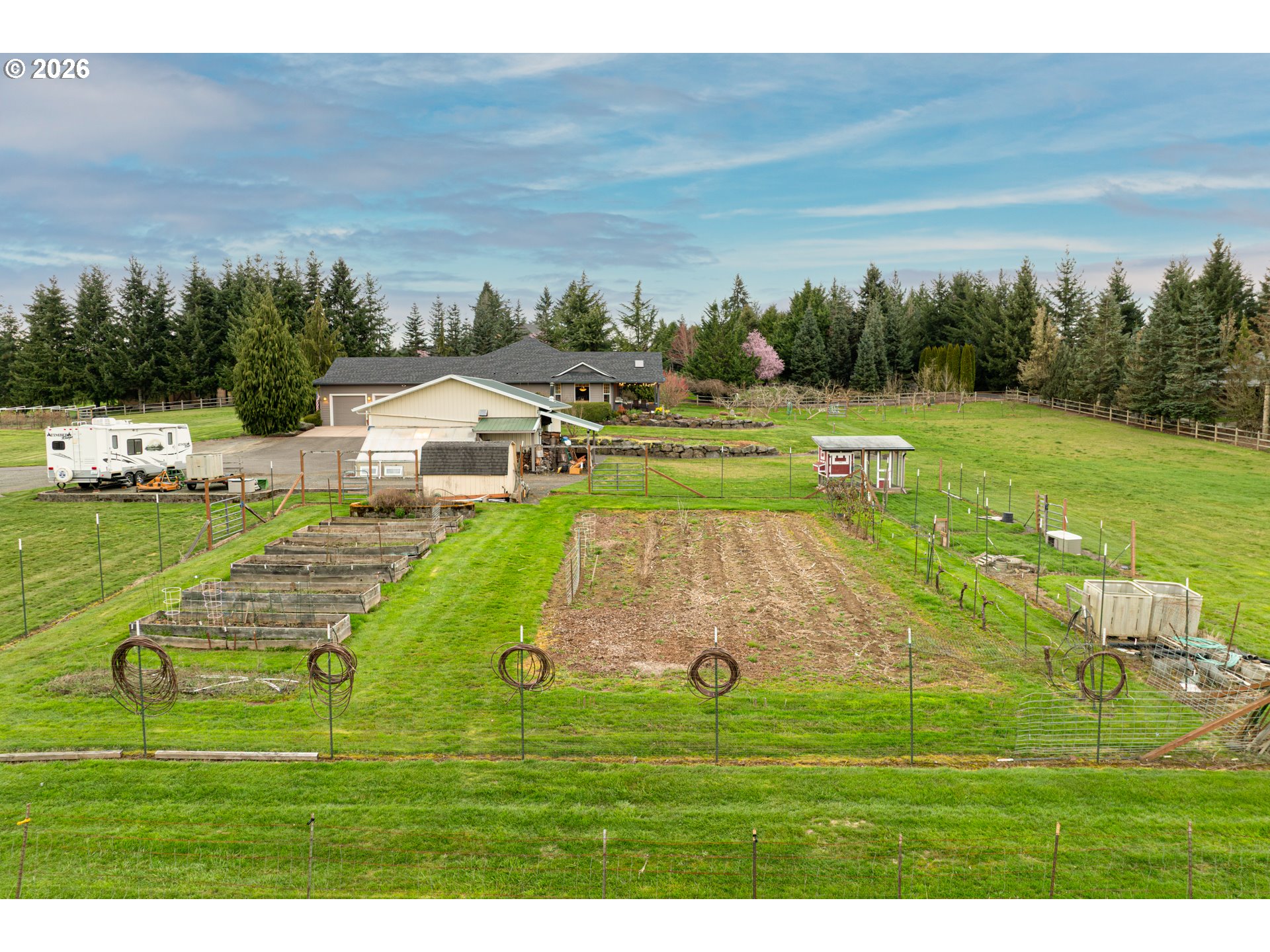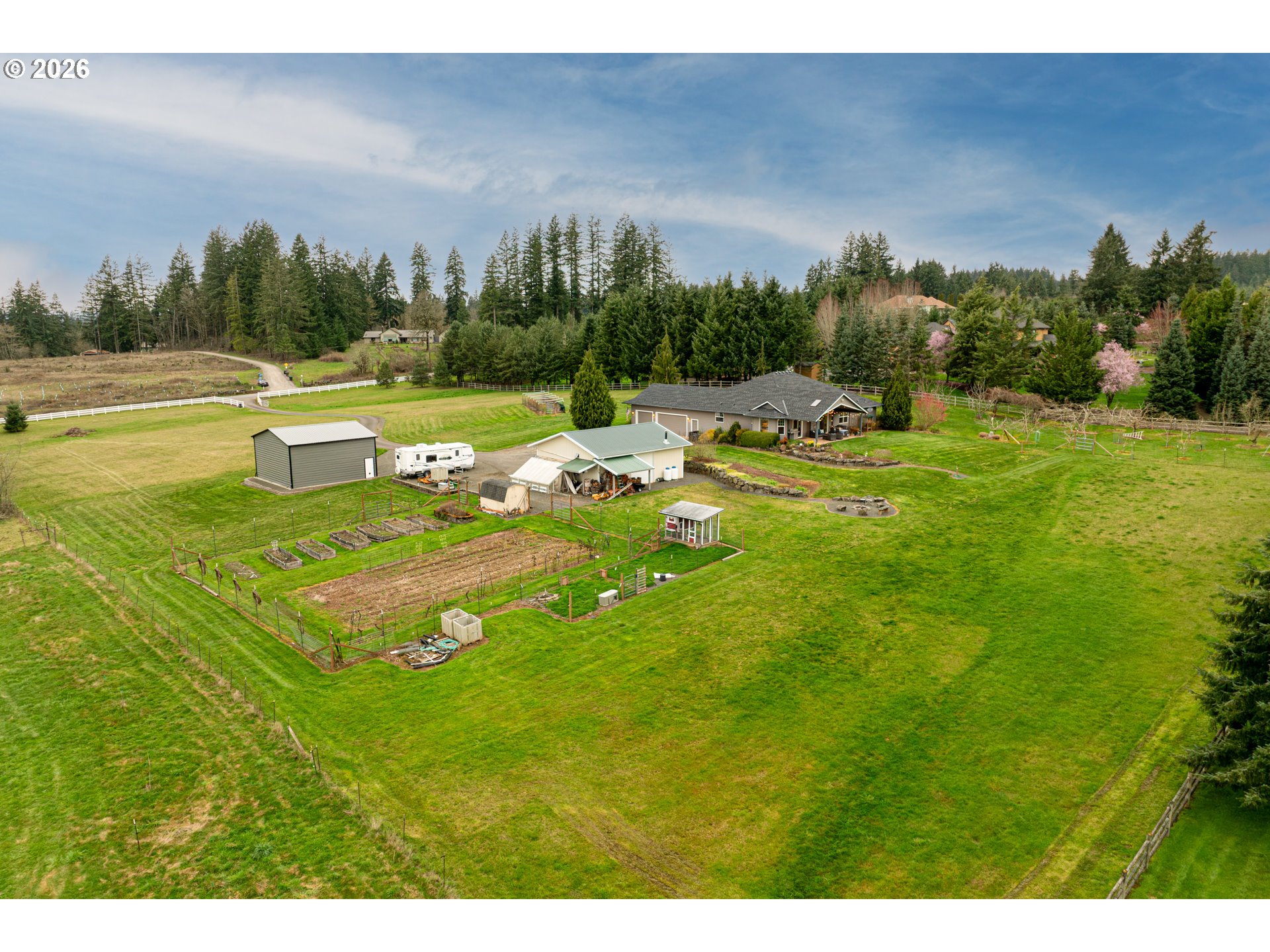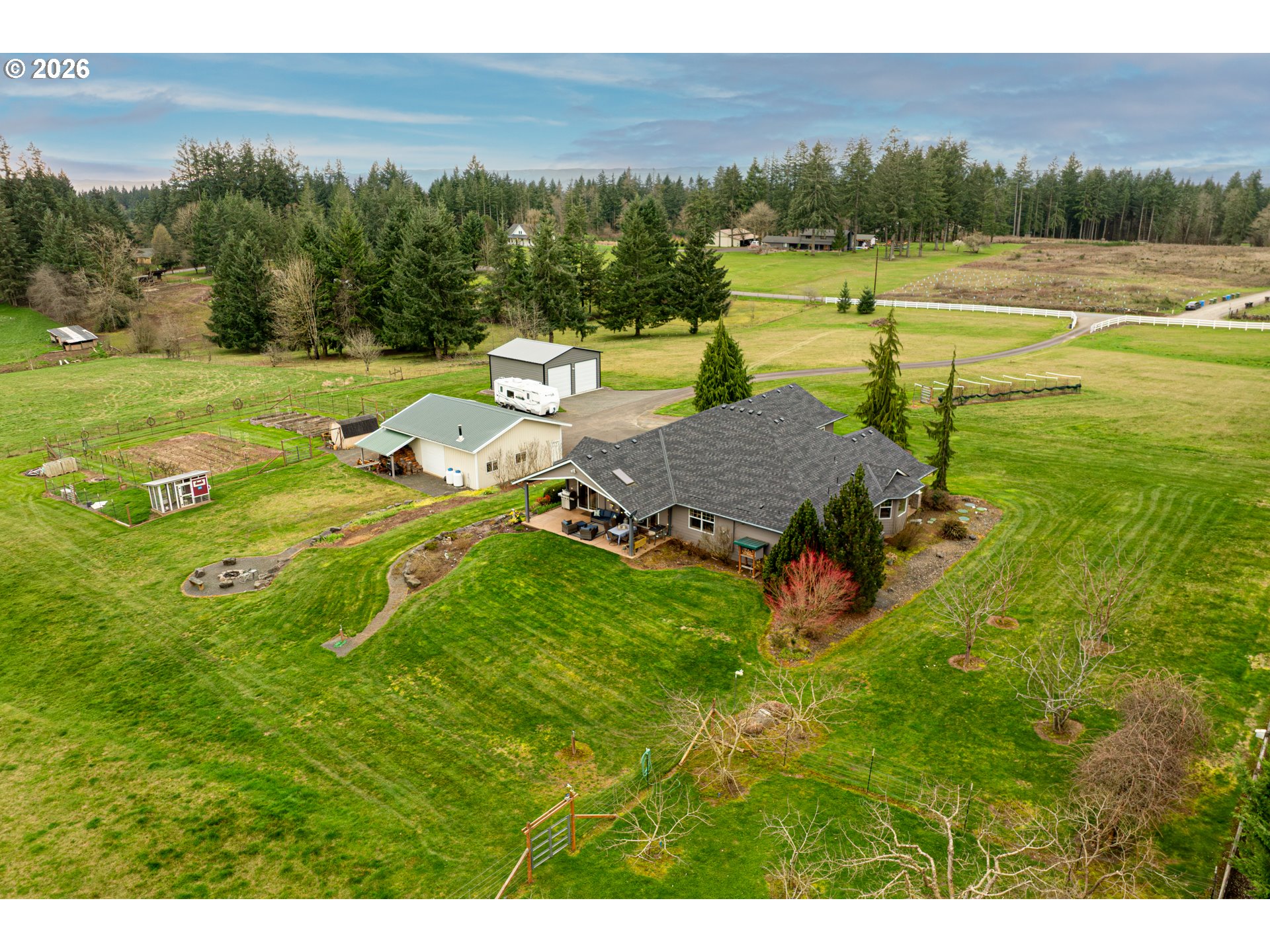 (503) 893-8874Hobby farmer’s dream with HUGE shops on 5 level acres. The 34x38 shop includes pull through access, hot water, and workshop space, plus an additional 32x32 shop. Beautifully updated great room floorplan featuring quartz counters, a spacious island, walk-in pantry with garage passthrough, and hardwood floors throughout. Two sliders open to the oversized covered patio for easy indoor-outdoor living, and an amazing firepit area for stargazing. The primary suite offers a spa like bath with soaking tub, roll in tile shower, heated tile floors, and walk-in closet. The property is set up for country living with a deer fenced garden, raised beds, drainage, drip irrigation, solar heated greenhouse, orchard, Mason bee colonies, chicken coop, duck habitat, and blueberries. Energy efficient features include ICF construction, heat pump, emergency generator, new roof, and Hardi-plank siding. Attached three car garage with EV readiness, mechanical room, and extensive paved parking. Fully fenced with gated entry. This one won't last!