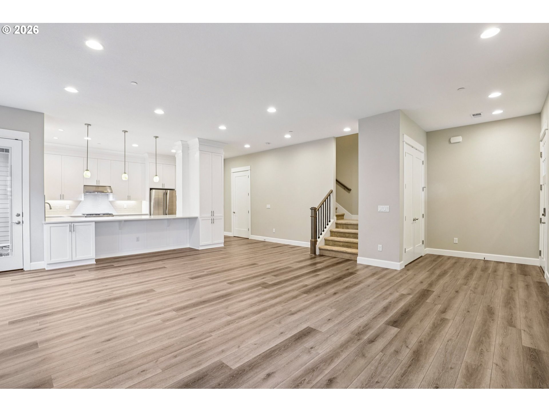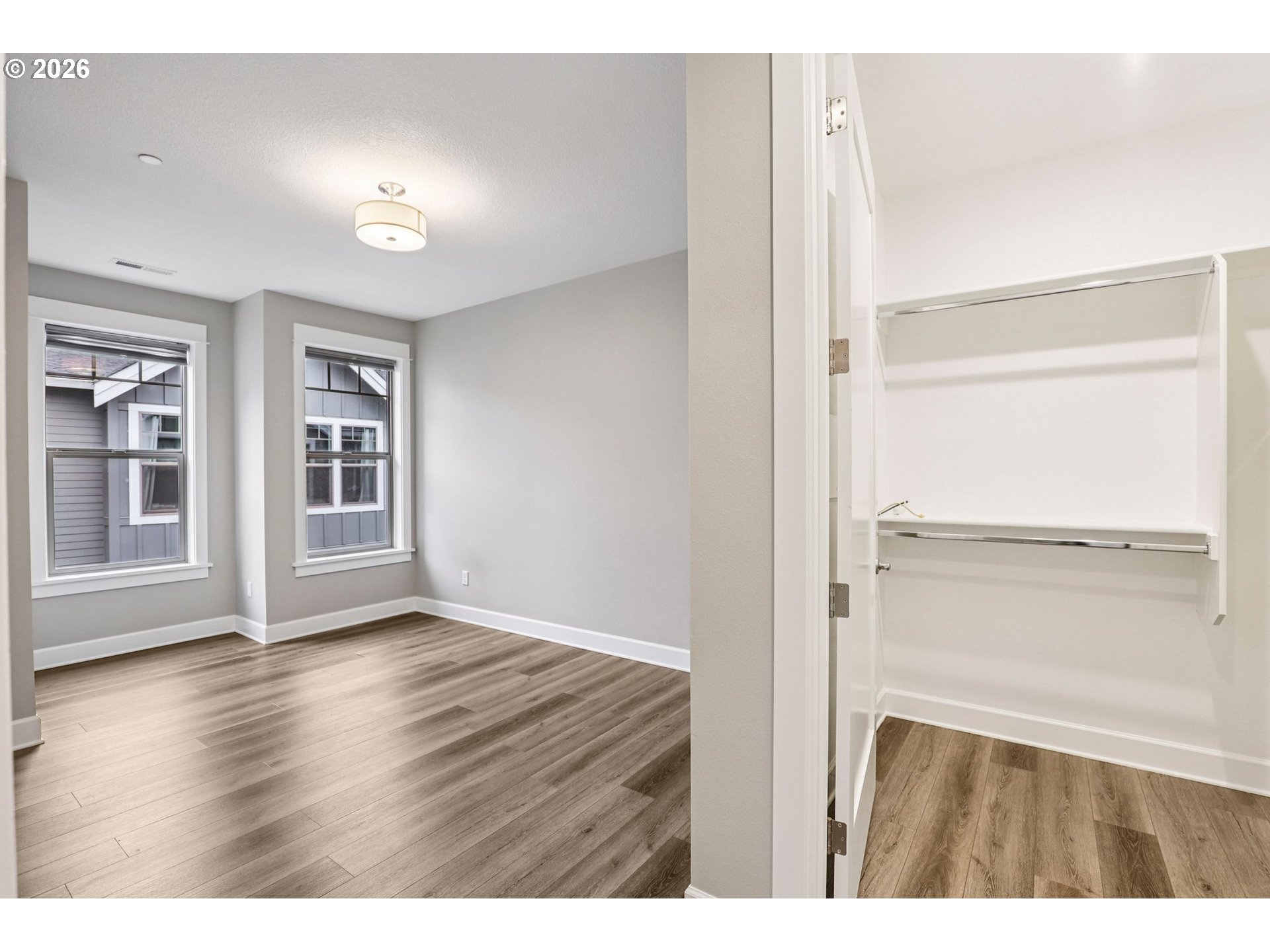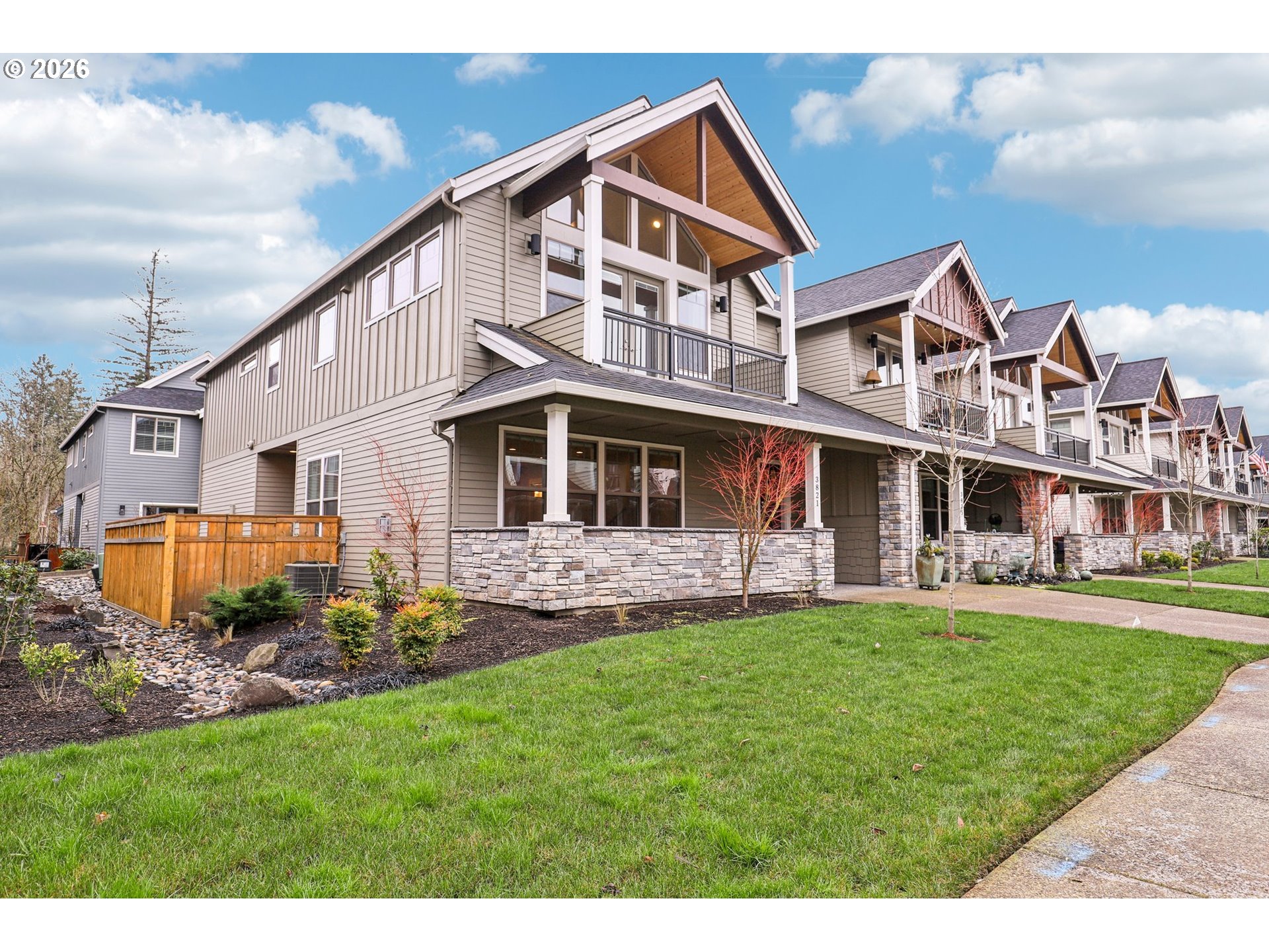 Refined living in the gated community of Two Creeks at Camas Meadows. Thoughtfully designed with expansive living spaces, 10-foot ceilings, and 8-foot doors throughout. A welcoming covered front porch and private two-car alley-access garage enhance both charm and convenience. Wood flooring spans the main level, with carpeted stairs for comfort. The side yard, largest in the community, offers a covered patio and mature landscaping—ideal for quiet mornings or curated garden touches. Upstairs, the primary suite impresses with vaulted ceilings, dramatic floor-to-ceiling windows, a generous walk-in closet, and a well-appointed ensuite. Two additional bedrooms, each with walk-in closets, accompany a functional laundry room complete with storage and utility sink. Residents enjoy premier amenities including pickleball courts, a fitness center, outdoor pool, saunas, hot tub, and meeting space. Direct access to the Lacamas Heritage Trail and effortless proximity to Camas Meadows Golf Course.