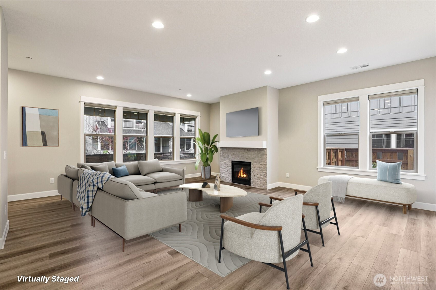 Refined living in the gated community of Two Creeks at Camas Meadows. Thoughtfully designed with expansive living spaces, 10-foot ceilings, and 8-foot doors throughout. A welcoming covered front porch and private two-car alley-access garage enhance both charm and convenience. Wood flooring spans the main level, with carpeted stairs for comfort. The side yard, largest in the community, offers a covered patio and mature landscaping—ideal for quiet mornings or curated garden touches. Upstairs, the primary suite impresses with vaulted ceilings, dramatic floor-to-ceiling windows, a generous walk-in closet, and a well-appointed ensuite. Two additional bedrooms, each with walk-in closets, accompany a functional laundry room complete with storage and utility sink. Residents enjoy premier amenities including pickleball courts, a fitness center, outdoor pool, saunas, hot tub, and meeting space. Direct access to the Lacamas Heritage Trail and effortless proximity to Camas Meadows Golf Course.