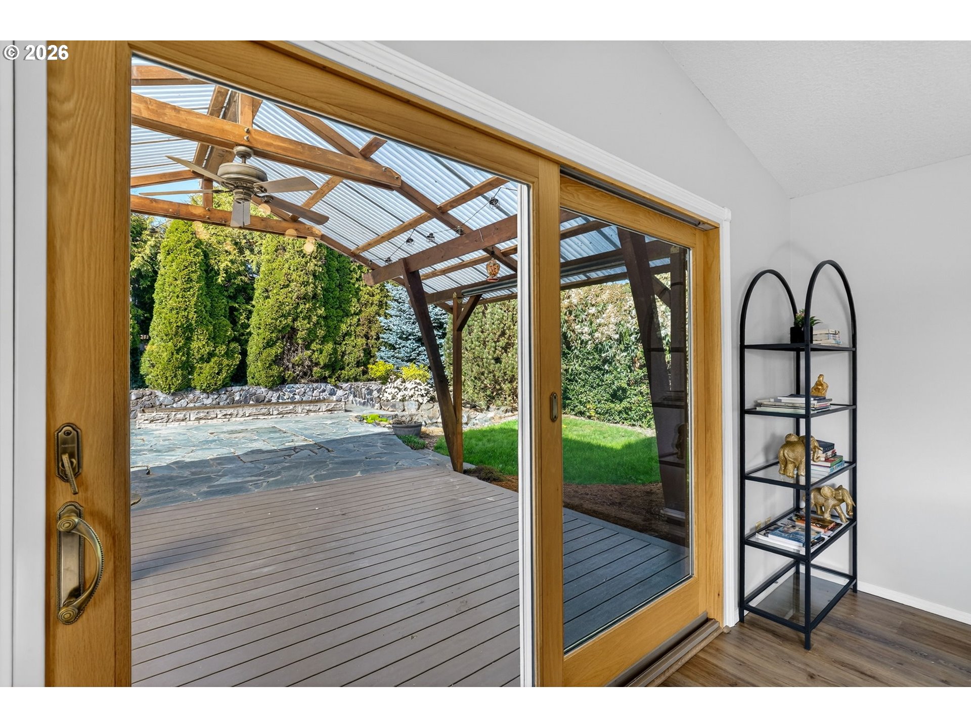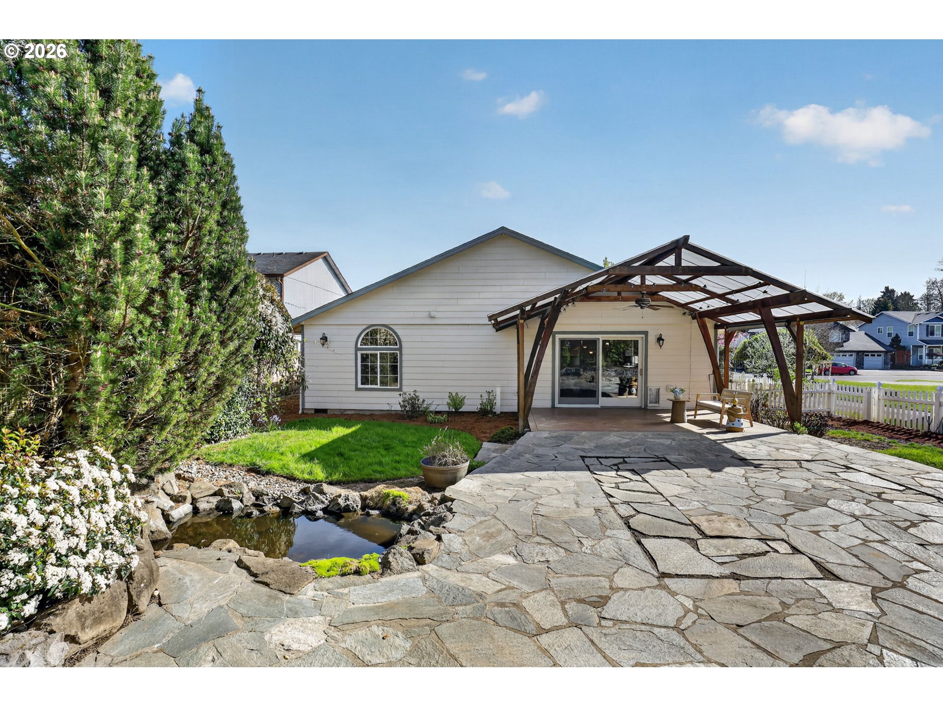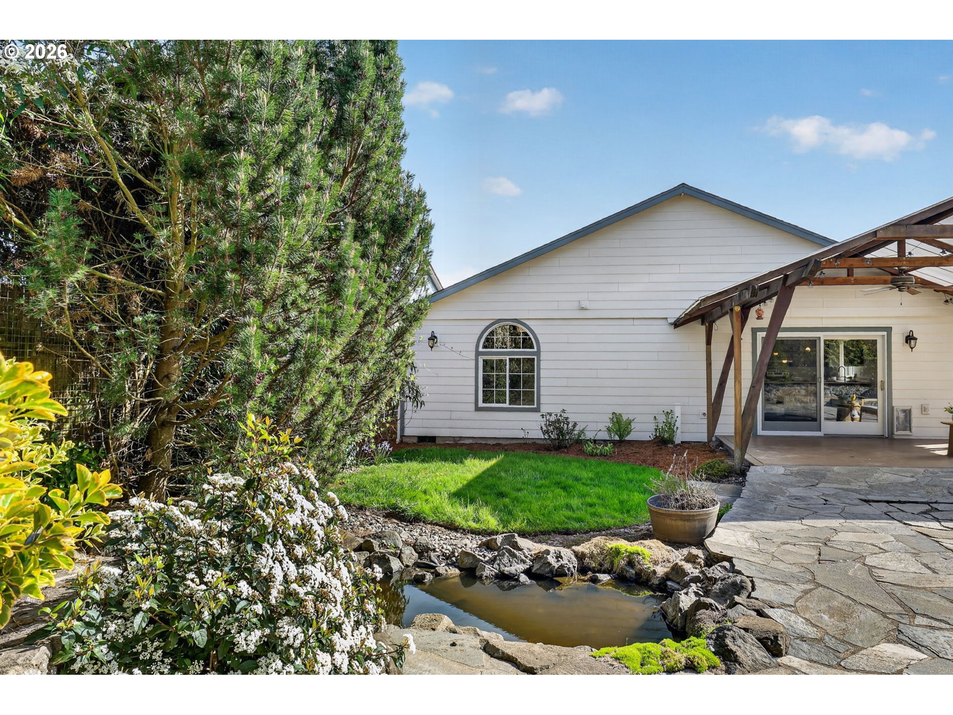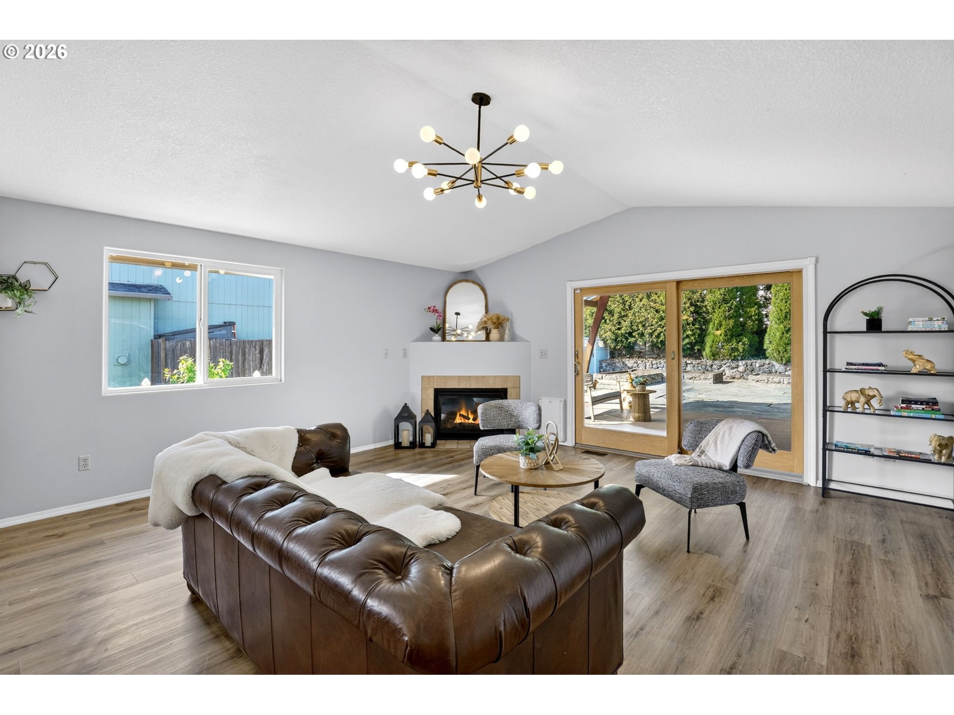 Step into a welcoming entry hallway that opens into a light-filled, thoughtfully designed one-level home.You are welcomed by a spacious great room featuring a wall of windows that fills the space with natural light—an incredibly ideal for a home office, bonus room, or additional family living space. The spacious living room features vaulted ceilings, a cozy gas fireplace, and large sliding doors that seamlessly connect indoor and outdoor living—creating an inviting space perfect for both relaxing and entertaining. The updated kitchen sits at the heart of the home, showcasing quartz countertops, a large eat-in bar, and stainless appliances, all designed for modern living and everyday convenience. Adjacent to the kitchen, a flexible living and dining area offers additional space for gatherings, quiet evenings, or a home office setup. The home flows effortlessly into three well-proportioned bedrooms, including a spacious primary suite that provides a comfortable and private retreat. Each room is filled with natural light, enhancing the home’s warm and cozy atmosphere. Step outside to a beautifully maintained, flat backyard—ideal for outdoor enjoyment. The yard features fresh mulch, defined flower beds, raised garden boxes for gardening enthusiasts, and a covered patio overlooking a custom waterfall pond that creates a peaceful, Zen-like setting. The expanded driveway provides extra parking for convenience. Located in a quiet, peaceful neighborhood close to local shops, dining, entertainment, highly regarded schools and NO HOA. This home offers the perfect blend of comfort, functionality, and modern living.Additional highlights include fresh interior paint, luxury vinyl flooring, updated fixtures, a recently serviced HVAC system, and cleaned gutters.