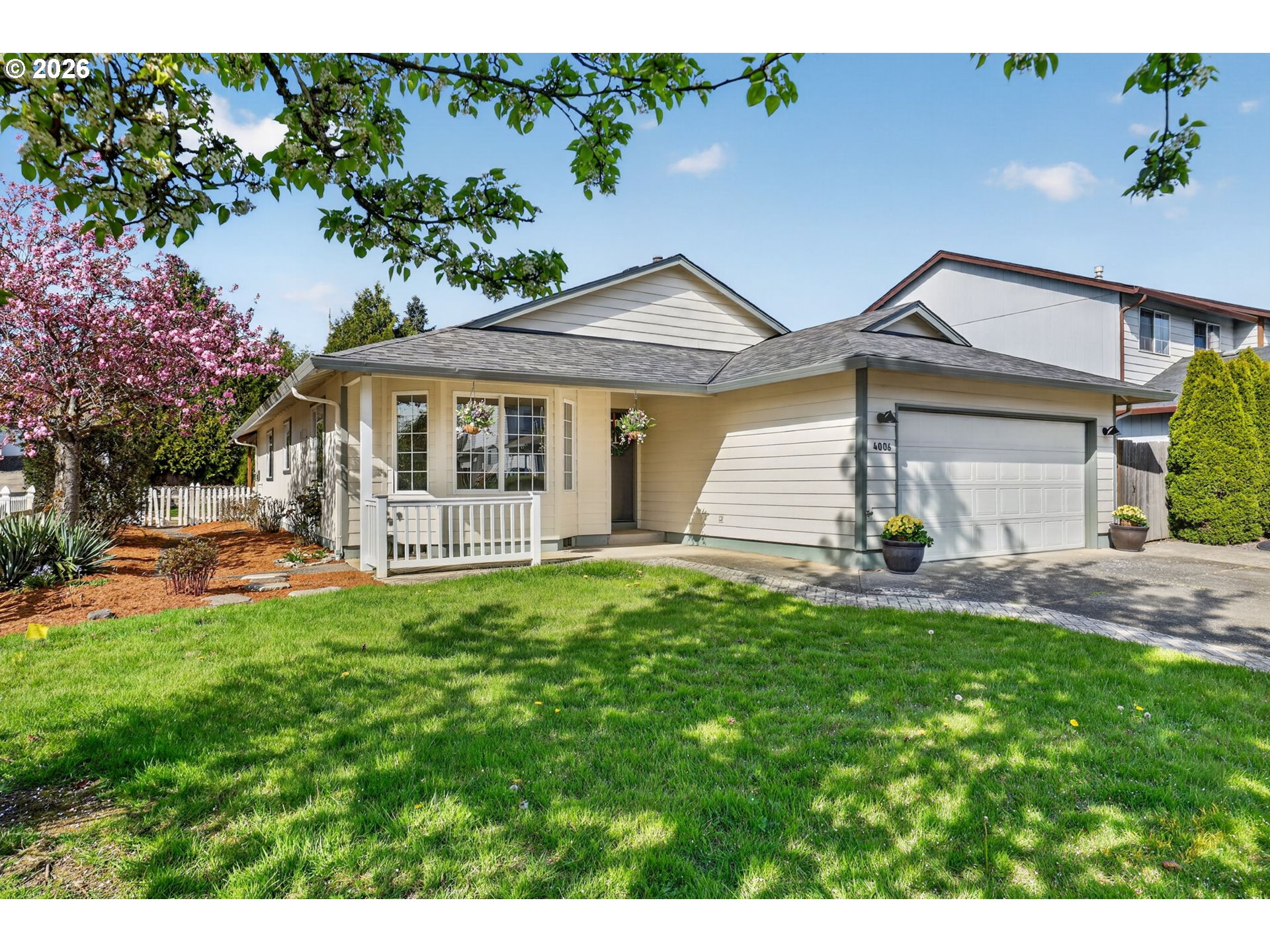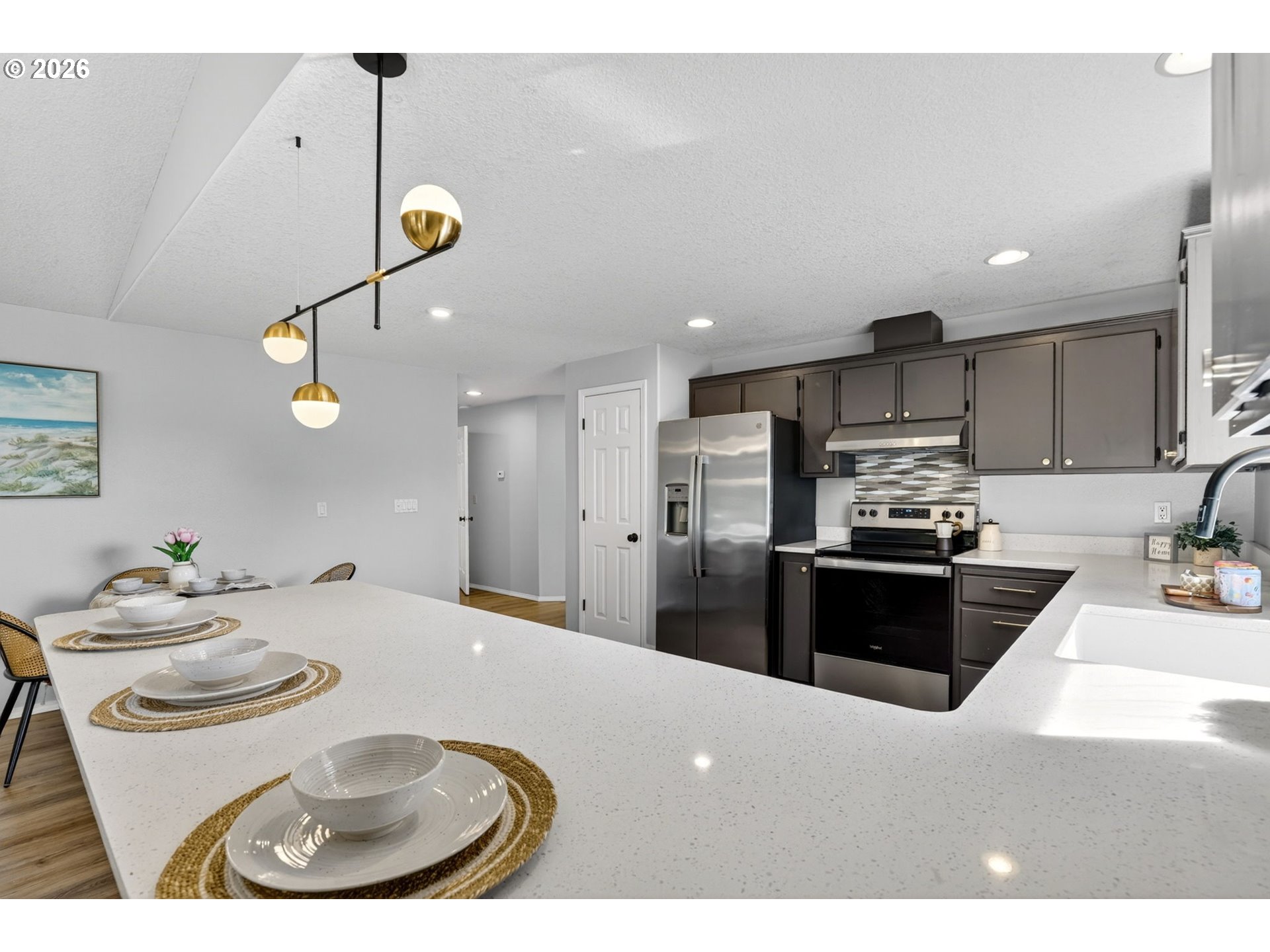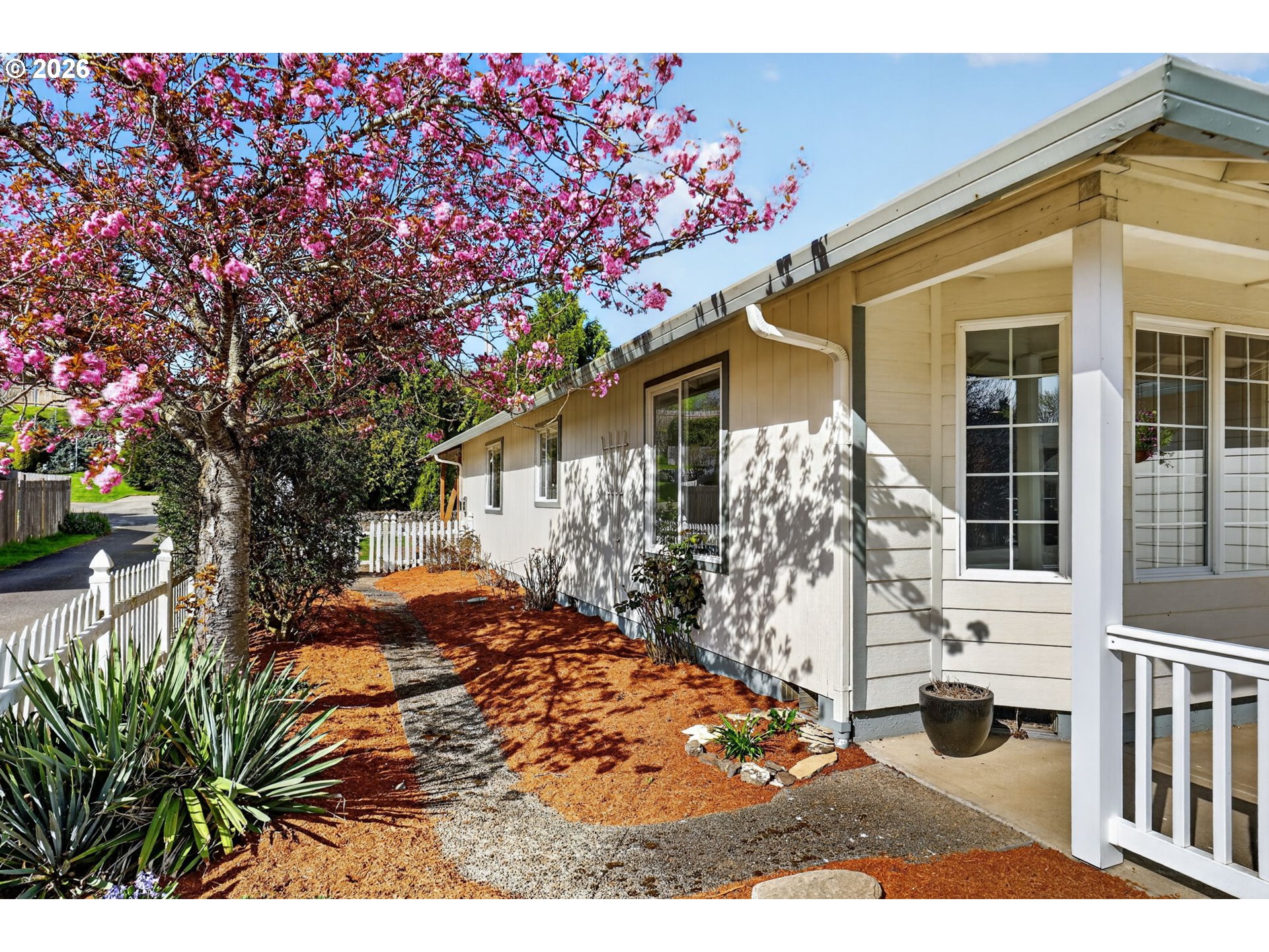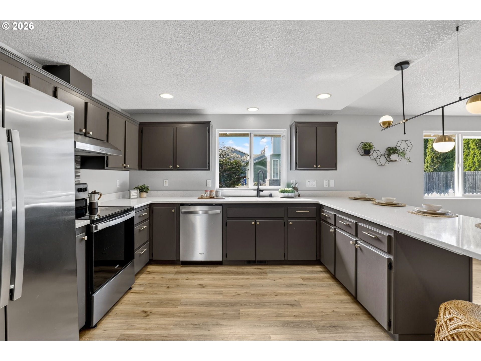 Step into a welcoming entry hallway that opens into a light-filled, thoughtfully designed one-level home.You are welcomed by a spacious great room featuring a wall of windows that fills the space with natural light—an incredibly ideal for a home office, bonus room, or additional family living space. The spacious living room features vaulted ceilings, a cozy gas fireplace, and large sliding doors that seamlessly connect indoor and outdoor living—creating an inviting space perfect for both relaxing and entertaining. The updated kitchen sits at the heart of the home, showcasing quartz countertops, a large eat-in bar, and stainless appliances, all designed for modern living and everyday convenience. Adjacent to the kitchen, a flexible living and dining area offers additional space for gatherings, quiet evenings, or a home office setup. The home flows effortlessly into three well-proportioned bedrooms, including a spacious primary suite that provides a comfortable and private retreat. Each room is filled with natural light, enhancing the home’s warm and cozy atmosphere. Step outside to a beautifully maintained, flat backyard—ideal for outdoor enjoyment. The yard features fresh mulch, defined flower beds, raised garden boxes for gardening enthusiasts, and a covered patio overlooking a custom waterfall pond that creates a peaceful, Zen-like setting. The expanded driveway provides extra parking for convenience. Located in a quiet, peaceful neighborhood close to local shops, dining, entertainment, highly regarded schools and NO HOA. This home offers the perfect blend of comfort, functionality, and modern living.Additional highlights include fresh interior paint, luxury vinyl flooring, updated fixtures, a recently serviced HVAC system, and cleaned gutters.