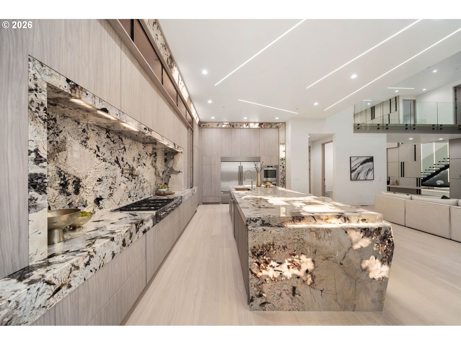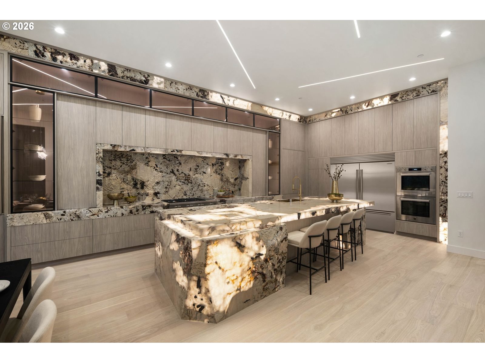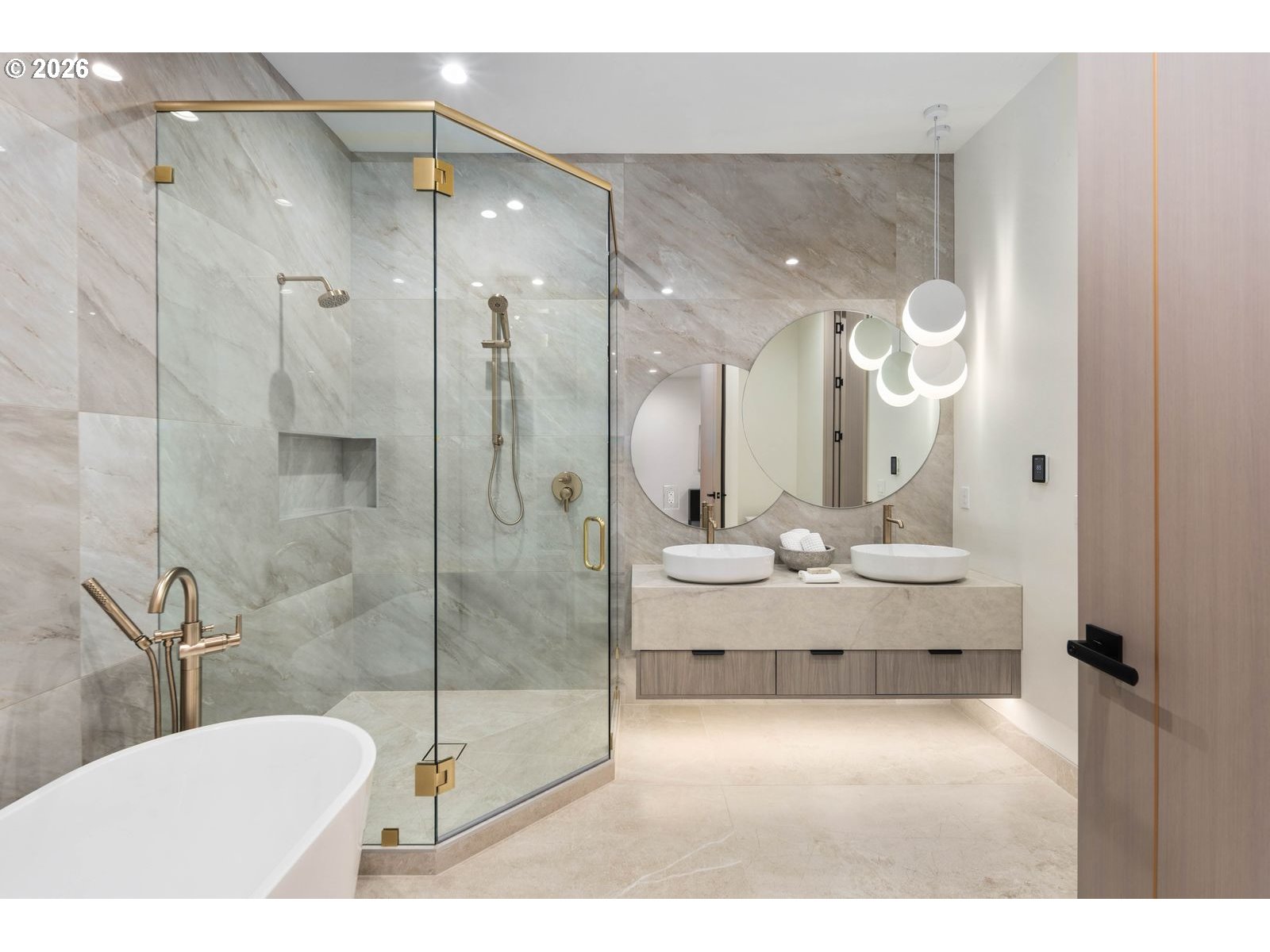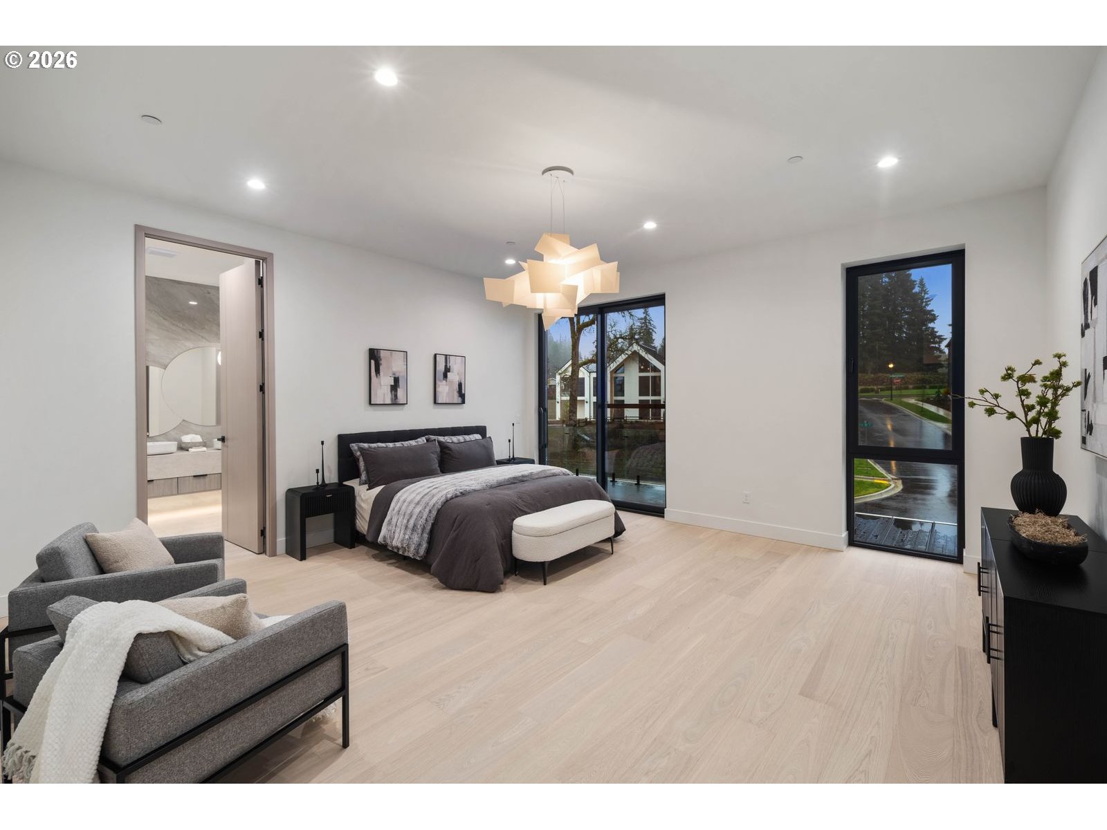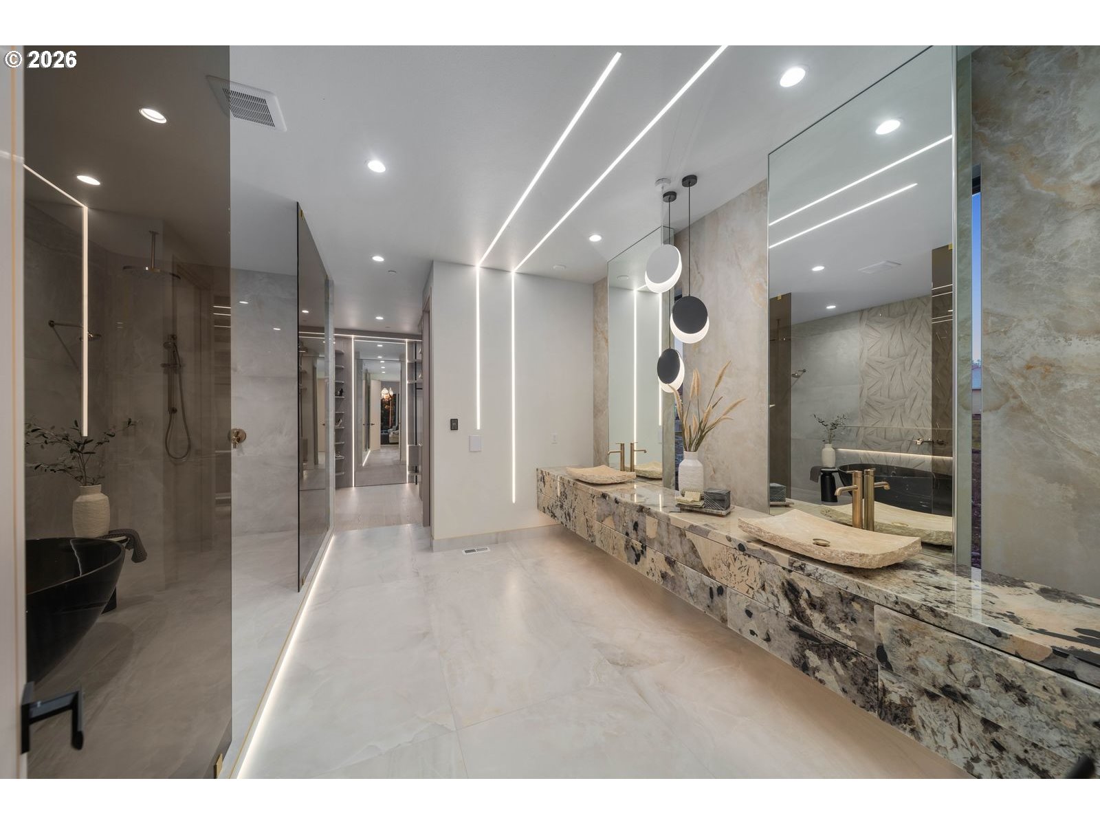 Custom residence in The Nines at Camas Meadows offering a lifestyle shaped by light, space, & direct access to Camas Meadows Golf Course from your backyard. Modern architecture meets warm textures as 21.5 ft ceilings, floating stairs, & triple pane windows create an elevated atmosphere. The Quartzite Patagonia kitchen w/ Bertazzoni suite anchors the main level, while the primary suite lives like a private retreat w/ floating tub, heated floors, & covered patio access. The lower level adds a wine wall, sauna, steam room, & 8 ft doors opening to the yard, plus a golf cart garage for instant course access. A rare blend of design, comfort, & resort-style living minutes from Vancouver & Portland. A home that defines elevated Camas living!