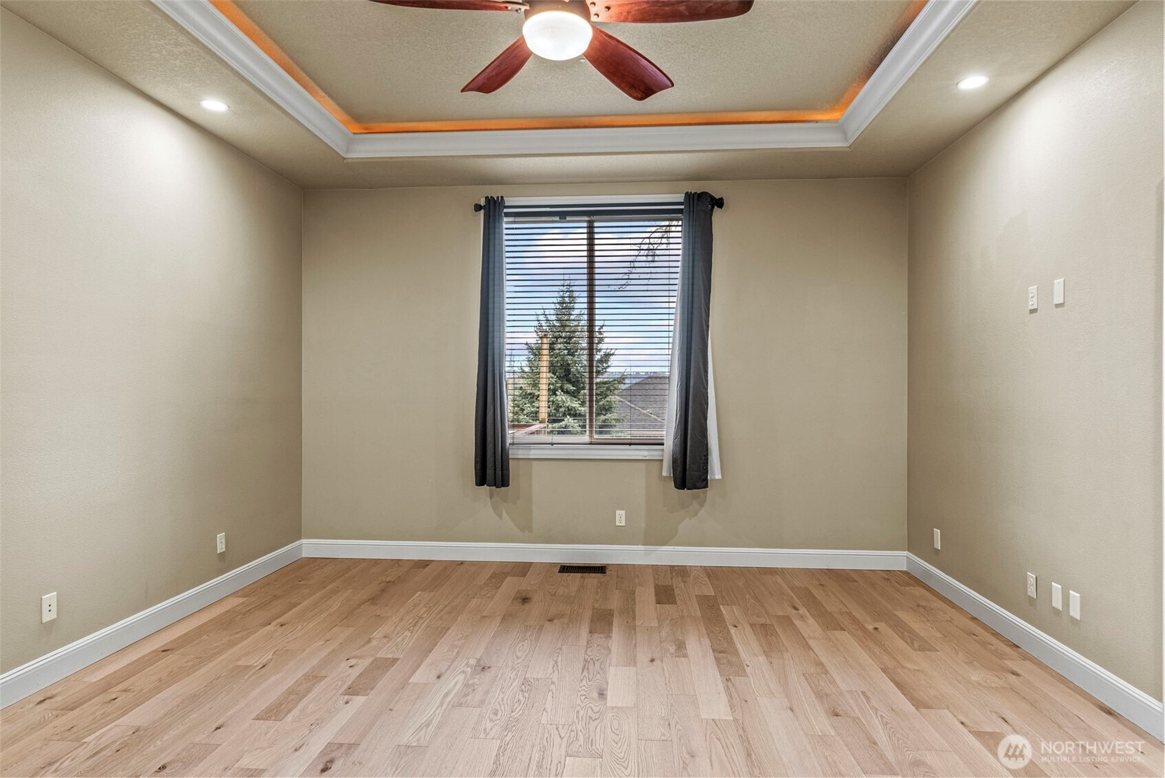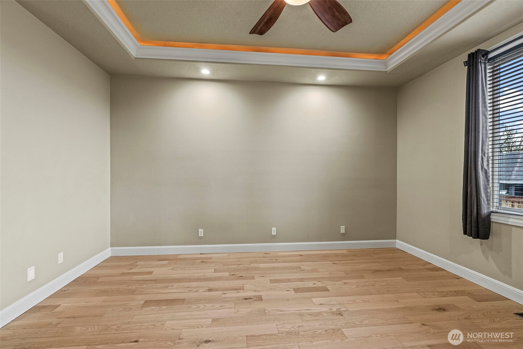 This 2,568 sq ft home offers a comfortable, open layout, beautiful inlayed wood floors, spacious kitchen with granite counters, large island, stainless appliances and an easy flow to the family room with gas fireplace. 3 bedrooms+ (fourth bedroom was converted into a walk-in closet for the primary suite and could easily be converted back). Primary bathroom features a jetted tub, tiled shower and heated bathroom floors. Some smart features throughout, wired for speakers inside and out, fenced backyard with deck, built in vac system, sprinkler system for easy maintenance. Quiet neighborhood, no HOA, and conveniently located near the golf course and pickleball courts. Warm, well-cared-for home that feels good the moment you walk in.