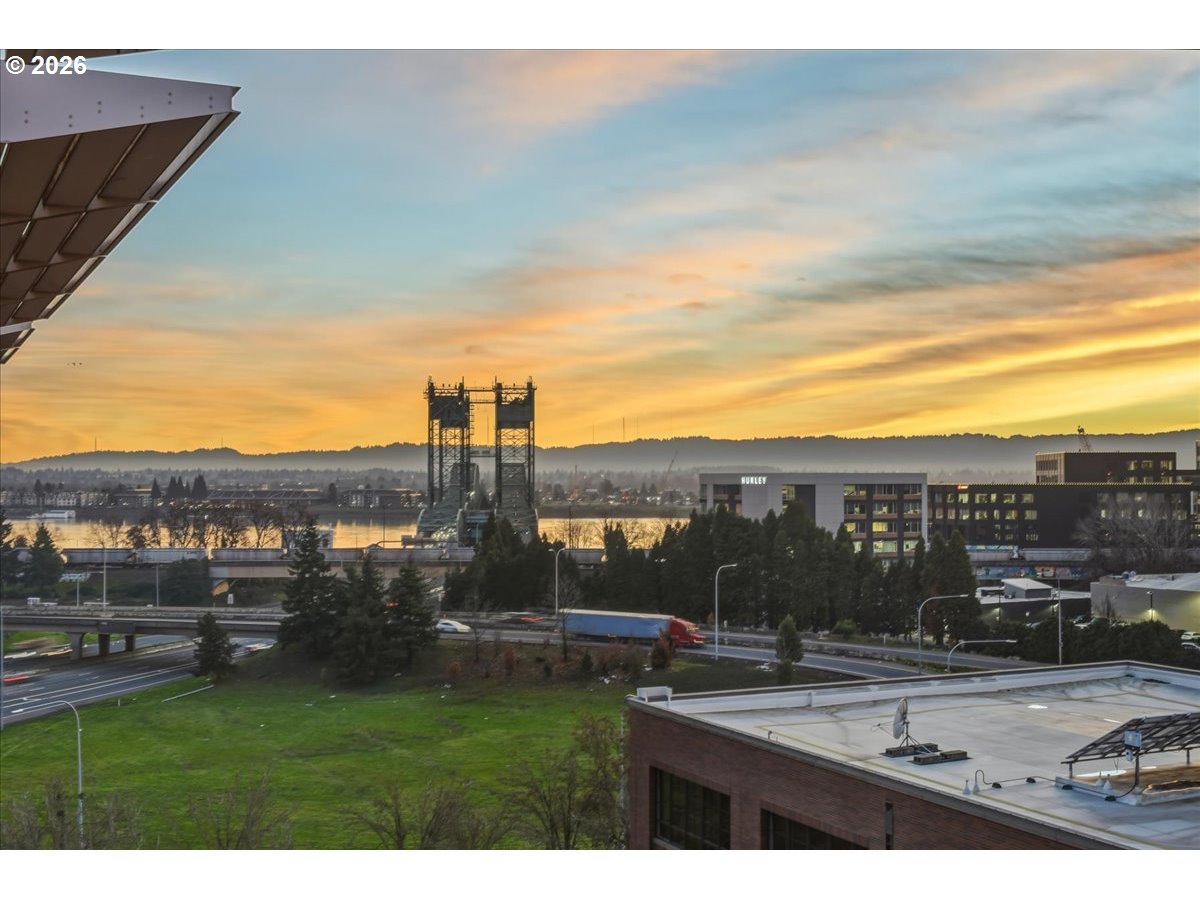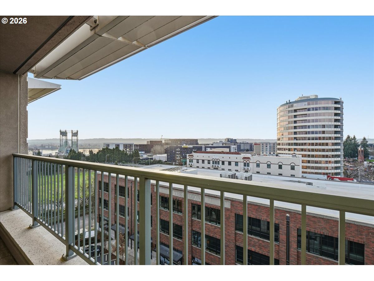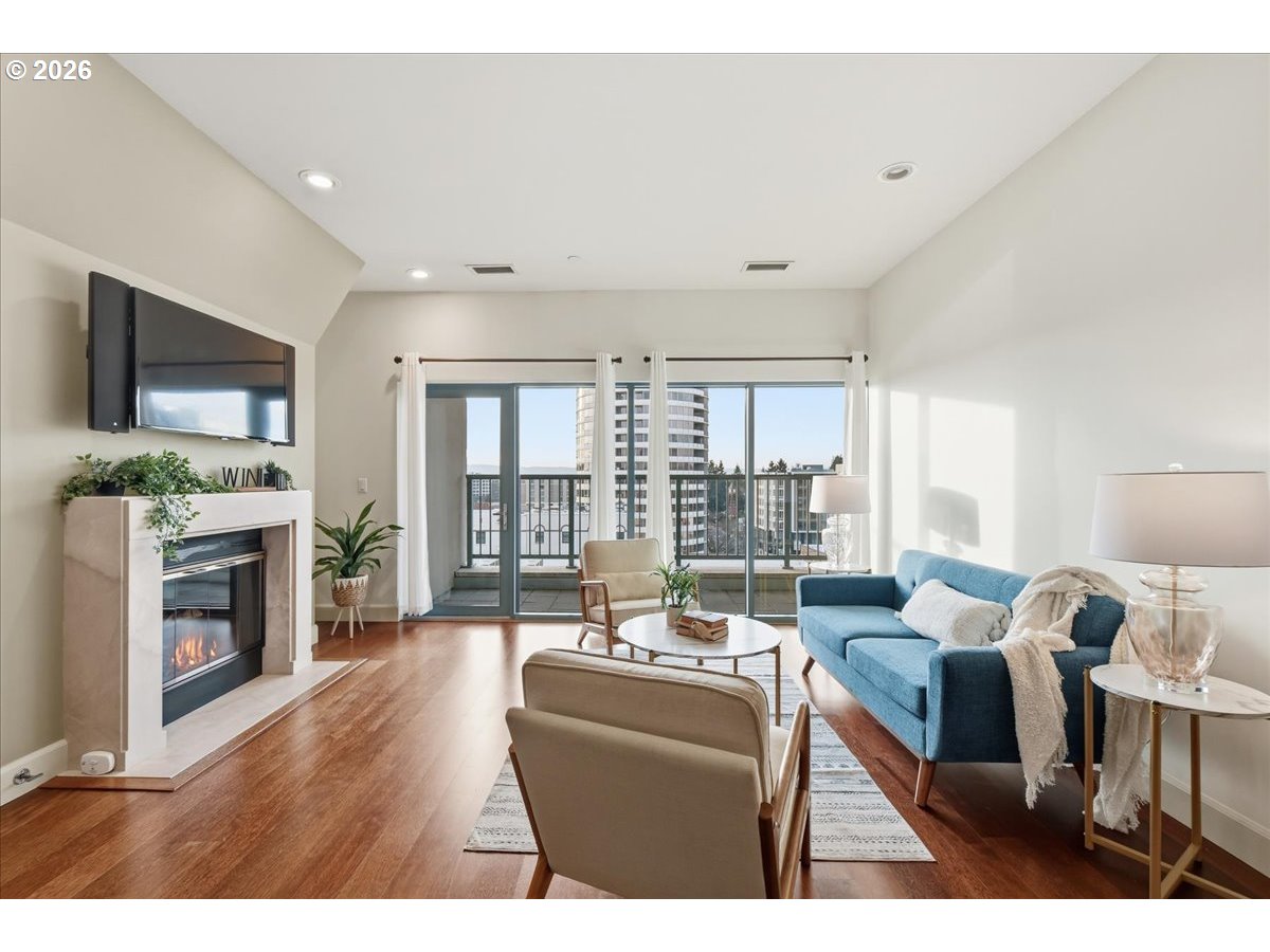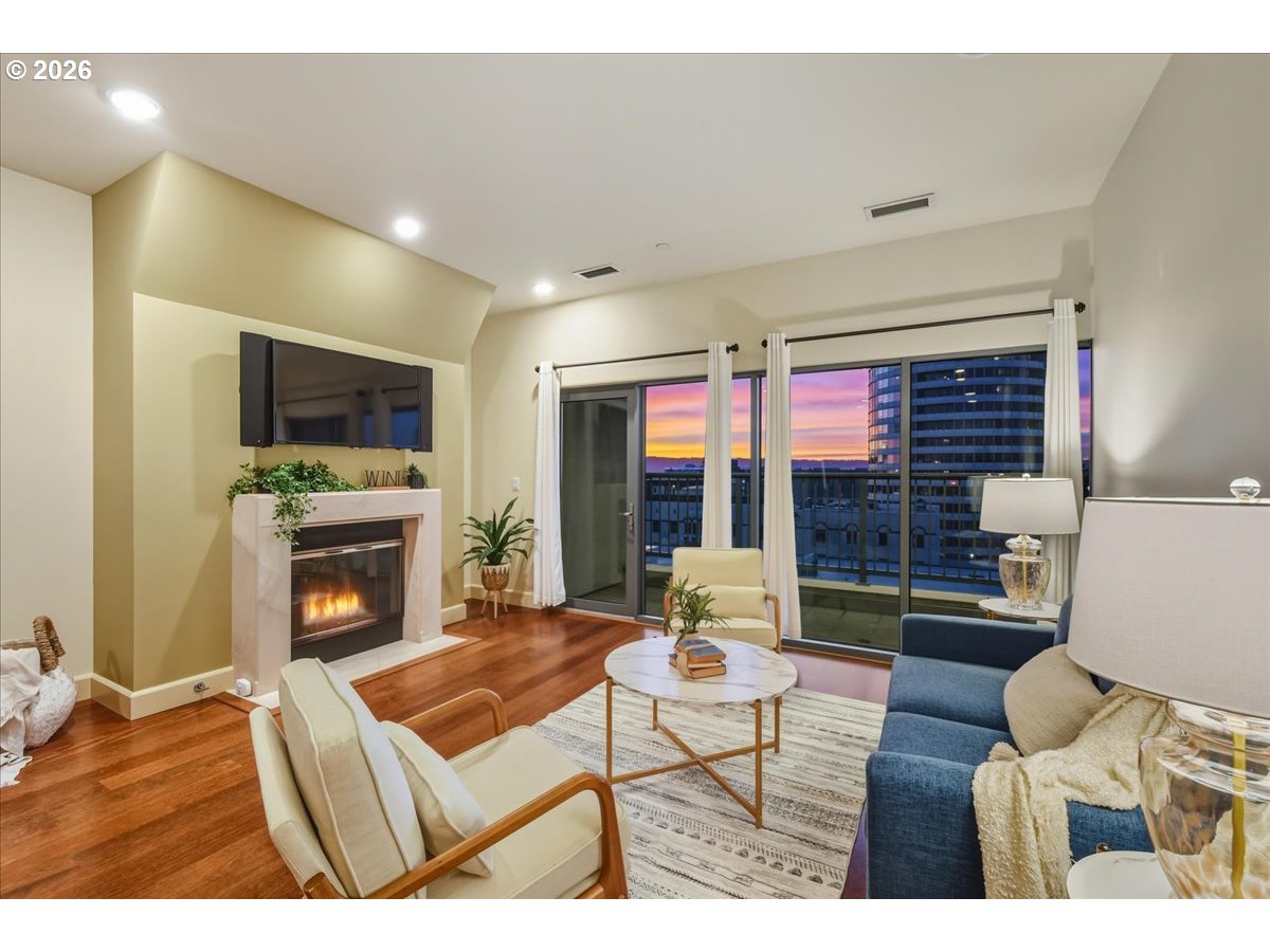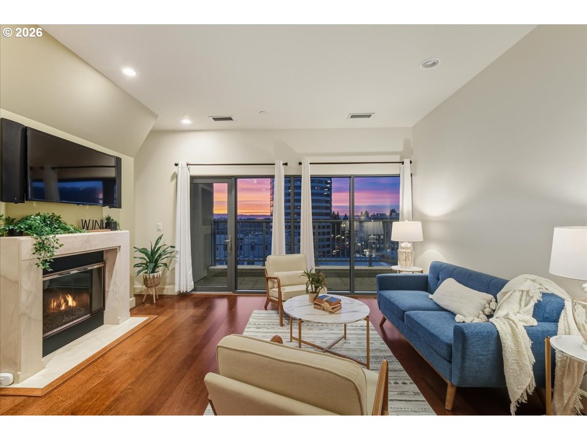 Life up top is a breeze in this spacious west-facing 1-bed/1-bath penthouse condo with a view! High ceilings and huge windows bathe this home in natural light and a dazzling cityscape. Brazilian cherry hardwood floors lend warmth and tasteful depth to the kitchen and open living area. In the kitchen, you'll find stainless appliances and tons of granite counter space. The gas stove will have you cooking with fire (and the HOA covers gas)! Kitchen cabinets were replaced in 2023. Kitchen countertop includes an eat bar. In the living room, a gas fireplace beckons you to get cozy, while a private balcony offers you a breath of fresh air high above burgeoning downtown Vancouver. Heavy-duty double pane windows help provide quiet & comfort in the heart of the city. The bedroom is bright and awash in natural light, with wall-to-wall carpet and a large closet. The tile bathroom has a long double vanity, extra storage, and walk-in tile shower with tile seat. French doors open to the den/office, where you'll also find the utility closet. All appliances stay. 1 block from Main St, 2 blocks from Esther Short park, and about 5 blocks to waterfront and upcoming Terminal 1 project. HOA dues cover gas, water/sewer, and trash--this kind of comprehensive utilities coverage is rare. Resident parking is covered, gated & secure; spots are deeded. Private storage units are in resident parking area. Residents also have a private elevator & mailroom, accessible only by key, code or fob. This condo offers both serenity and security in the city--who says you can't have your cake and eat it, too?!