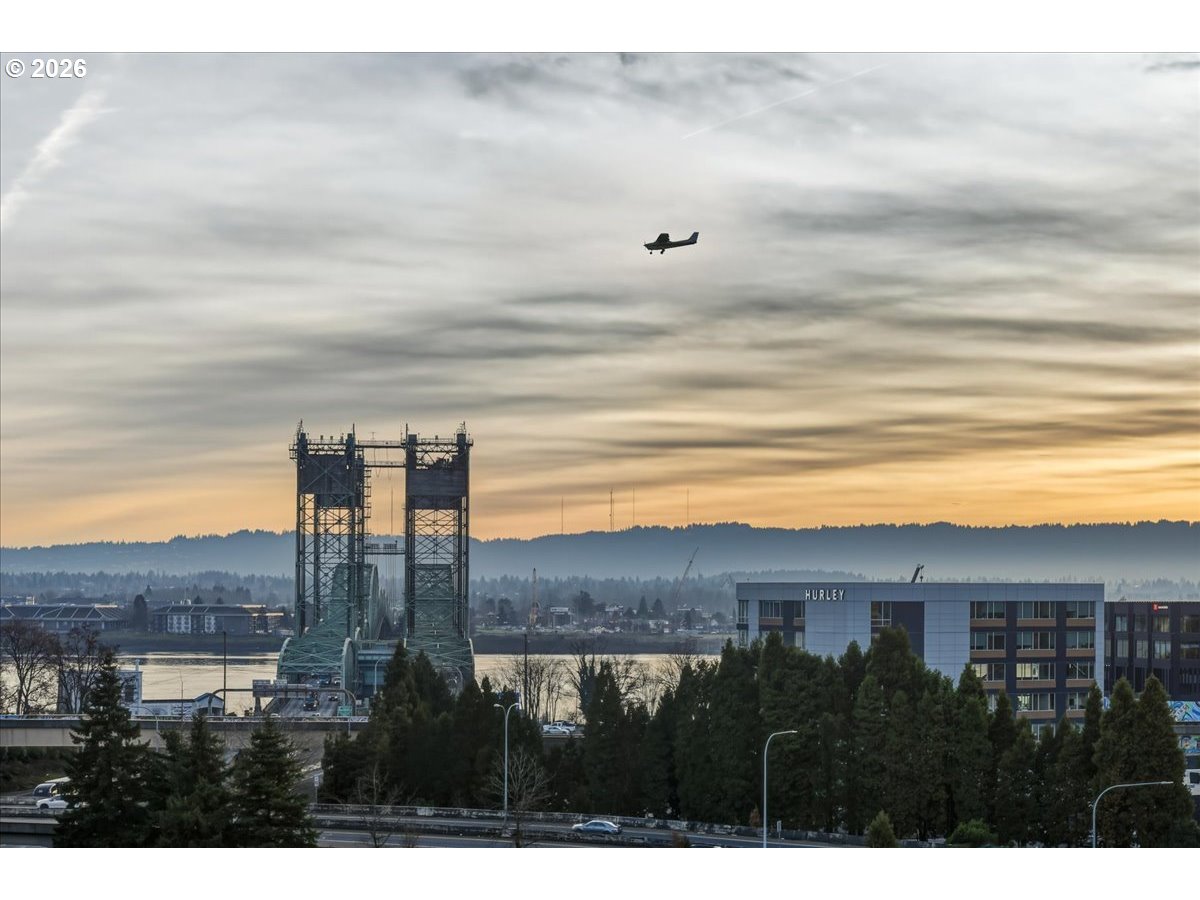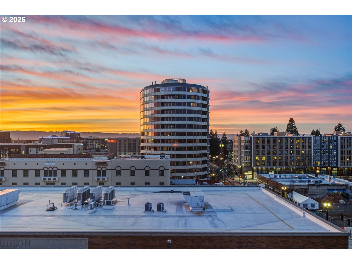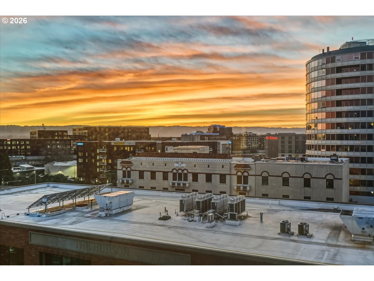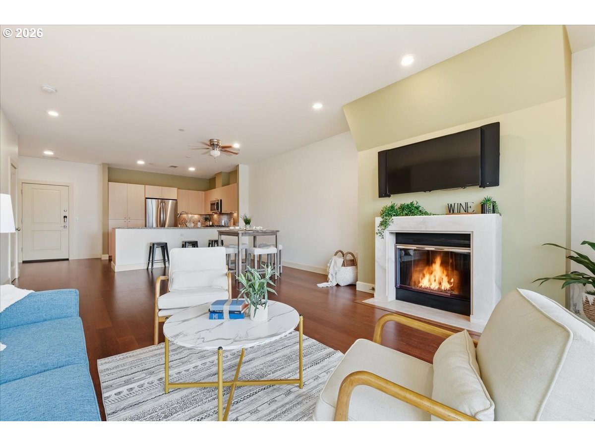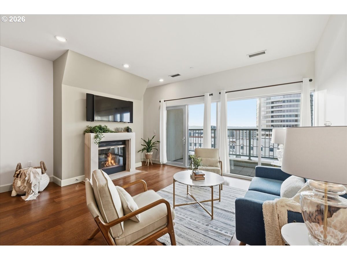 Life up top is a breeze in this spacious west-facing 1-bed/1-bath penthouse condo with a view! High ceilings and huge windows bathe this home in natural light and a dazzling cityscape. Brazilian cherry hardwood floors lend warmth and tasteful depth to the kitchen and open living area. In the kitchen, you'll find stainless appliances and tons of granite counter space. The gas stove will have you cooking with fire (and the HOA covers gas)! Kitchen cabinets were replaced in 2023. Kitchen countertop includes an eat bar. In the living room, a gas fireplace beckons you to get cozy, while a private balcony offers you a breath of fresh air high above burgeoning downtown Vancouver. Heavy-duty double pane windows help provide quiet & comfort in the heart of the city. The bedroom is bright and awash in natural light, with wall-to-wall carpet and a large closet. The tile bathroom has a long double vanity, extra storage, and walk-in tile shower with tile seat. French doors open to the den/office, where you'll also find the utility closet. All appliances stay. 1 block from Main St, 2 blocks from Esther Short park, and about 5 blocks to waterfront and upcoming Terminal 1 project. HOA dues cover gas, water/sewer, and trash--this kind of comprehensive utilities coverage is rare. Resident parking is covered, gated & secure; spots are deeded. Private storage units are in resident parking area. Residents also have a private elevator & mailroom, accessible only by key, code or fob. This condo offers both serenity and security in the city--who says you can't have your cake and eat it, too?!