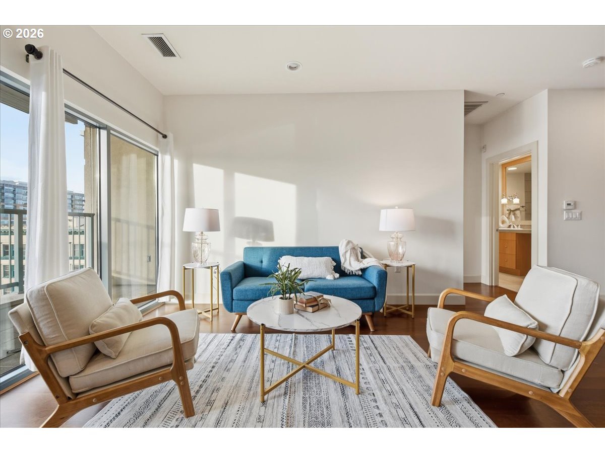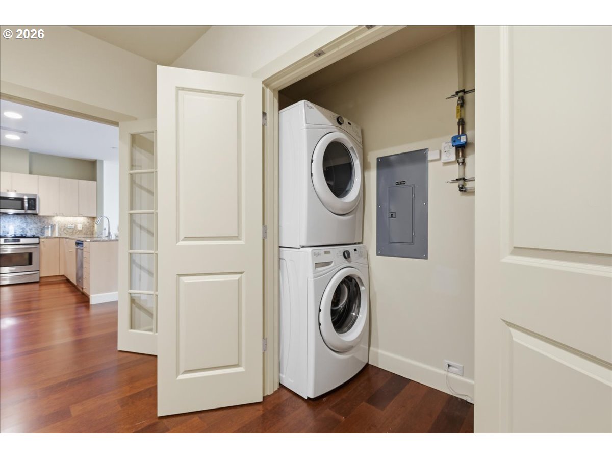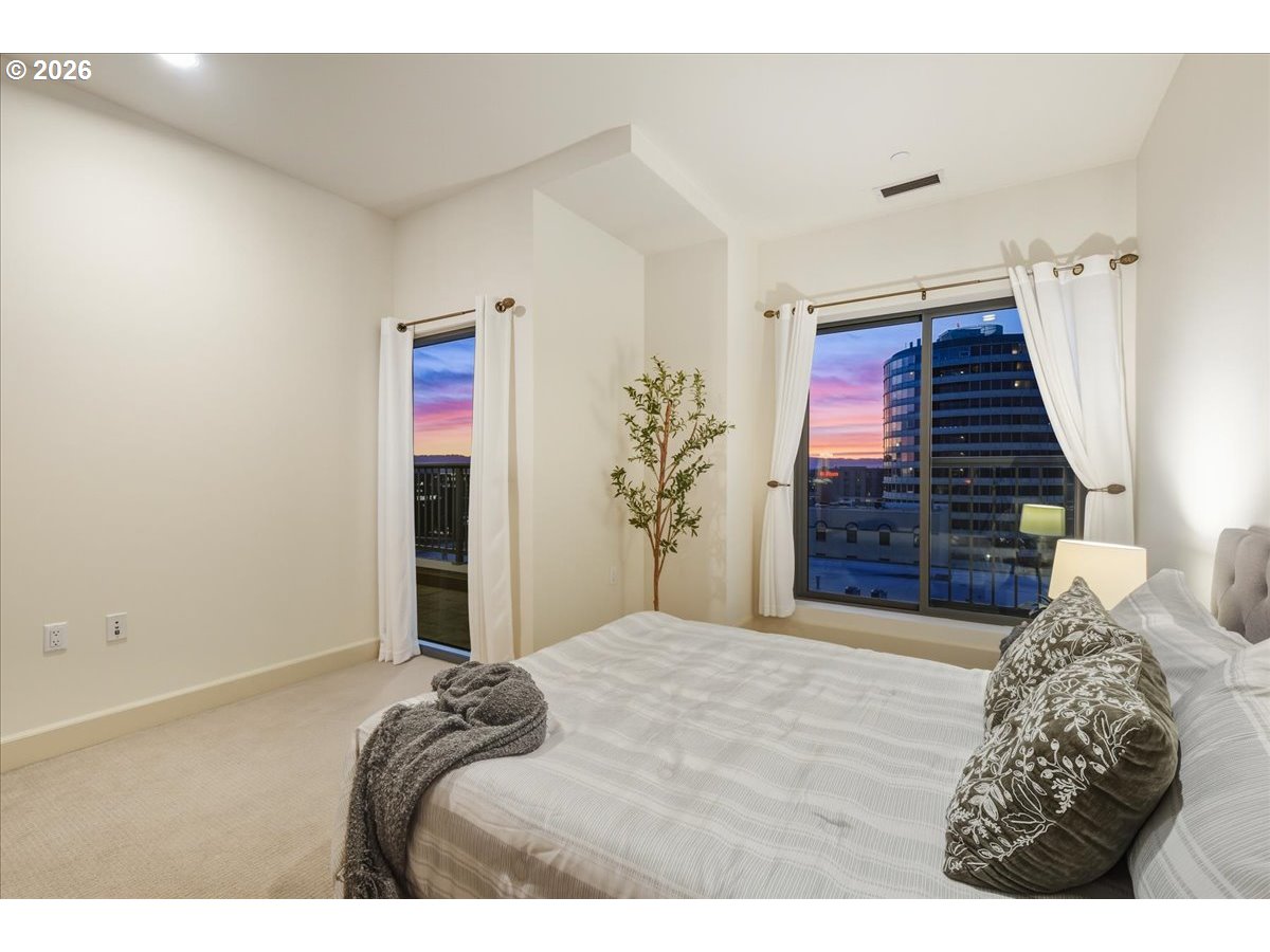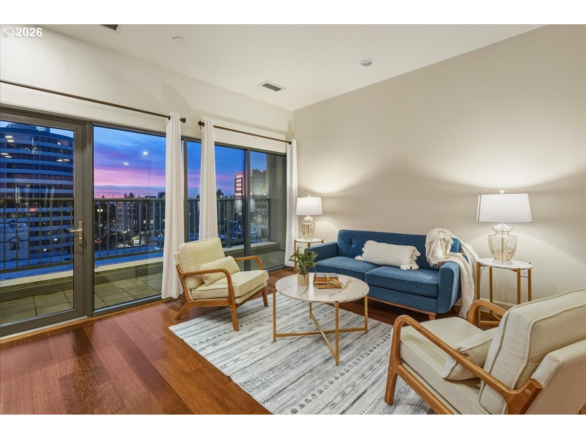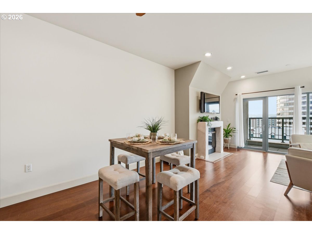 Life up top is a breeze in this spacious west-facing 1-bed/1-bath penthouse condo with a view! High ceilings and huge windows bathe this home in natural light and a dazzling cityscape. Brazilian cherry hardwood floors lend warmth and tasteful depth to the kitchen and open living area. In the kitchen, you'll find stainless appliances and tons of granite counter space. The gas stove will have you cooking with fire (and the HOA covers gas)! Kitchen cabinets were replaced in 2023. Kitchen countertop includes an eat bar. In the living room, a gas fireplace beckons you to get cozy, while a private balcony offers you a breath of fresh air high above burgeoning downtown Vancouver. Heavy-duty double pane windows help provide quiet & comfort in the heart of the city. The bedroom is bright and awash in natural light, with wall-to-wall carpet and a large closet. The tile bathroom has a long double vanity, extra storage, and walk-in tile shower with tile seat. French doors open to the den/office, where you'll also find the utility closet. All appliances stay. 1 block from Main St, 2 blocks from Esther Short park, and about 5 blocks to waterfront and upcoming Terminal 1 project. HOA dues cover gas, water/sewer, and trash--this kind of comprehensive utilities coverage is rare. Resident parking is covered, gated & secure; spots are deeded. Private storage units are in resident parking area. Residents also have a private elevator & mailroom, accessible only by key, code or fob. This condo offers both serenity and security in the city--who says you can't have your cake and eat it, too?!