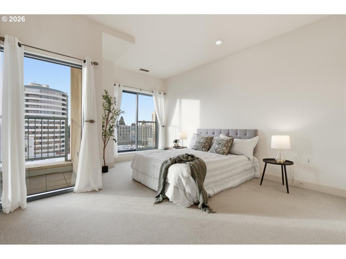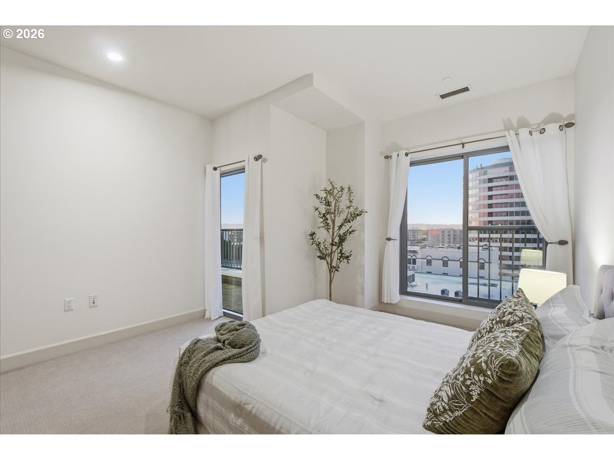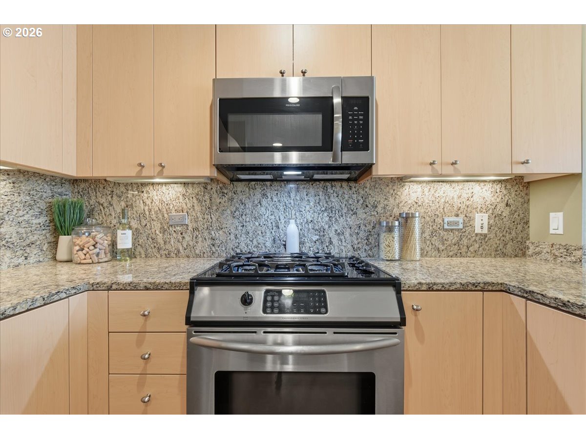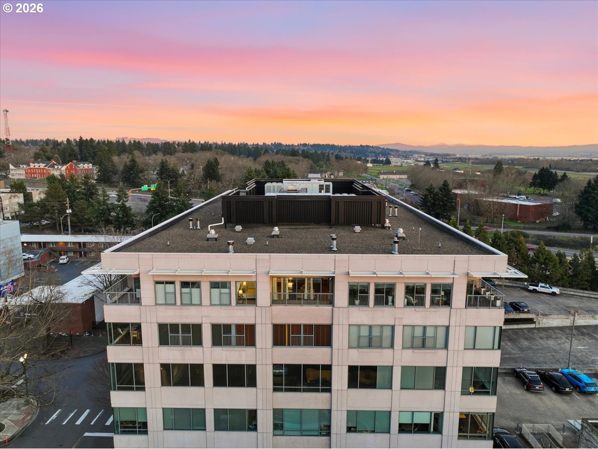 Life up top is a breeze in this spacious west-facing 1-bed/1-bath penthouse condo with a view! High ceilings and huge windows bathe this home in natural light and a dazzling cityscape. Brazilian cherry hardwood floors lend warmth and tasteful depth to the kitchen and open living area. In the kitchen, you'll find stainless appliances and tons of granite counter space. The gas stove will have you cooking with fire (and the HOA covers gas)! Kitchen cabinets were replaced in 2023. Kitchen countertop includes an eat bar. In the living room, a gas fireplace beckons you to get cozy, while a private balcony offers you a breath of fresh air high above burgeoning downtown Vancouver. Heavy-duty double pane windows help provide quiet & comfort in the heart of the city. The bedroom is bright and awash in natural light, with wall-to-wall carpet and a large closet. The tile bathroom has a long double vanity, extra storage, and walk-in tile shower with tile seat. French doors open to the den/office, where you'll also find the utility closet. All appliances stay. 1 block from Main St, 2 blocks from Esther Short park, and about 5 blocks to waterfront and upcoming Terminal 1 project. HOA dues cover gas, water/sewer, and trash--this kind of comprehensive utilities coverage is rare. Resident parking is covered, gated & secure; spots are deeded. Private storage units are in resident parking area. Residents also have a private elevator & mailroom, accessible only by key, code or fob. This condo offers both serenity and security in the city--who says you can't have your cake and eat it, too?!
