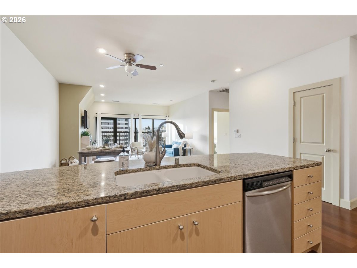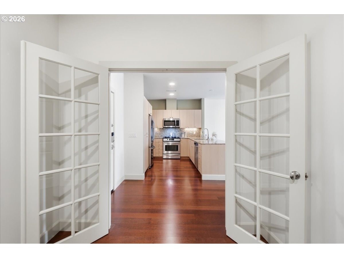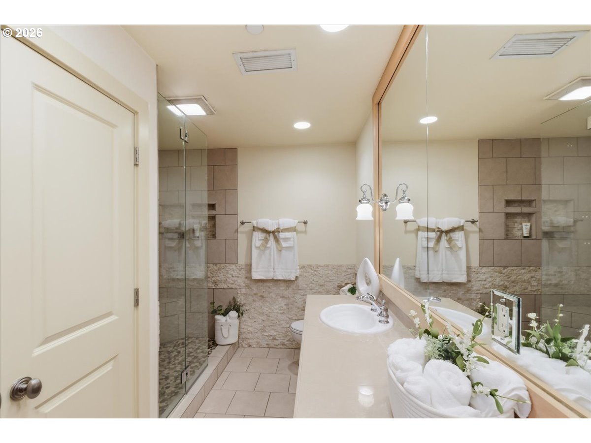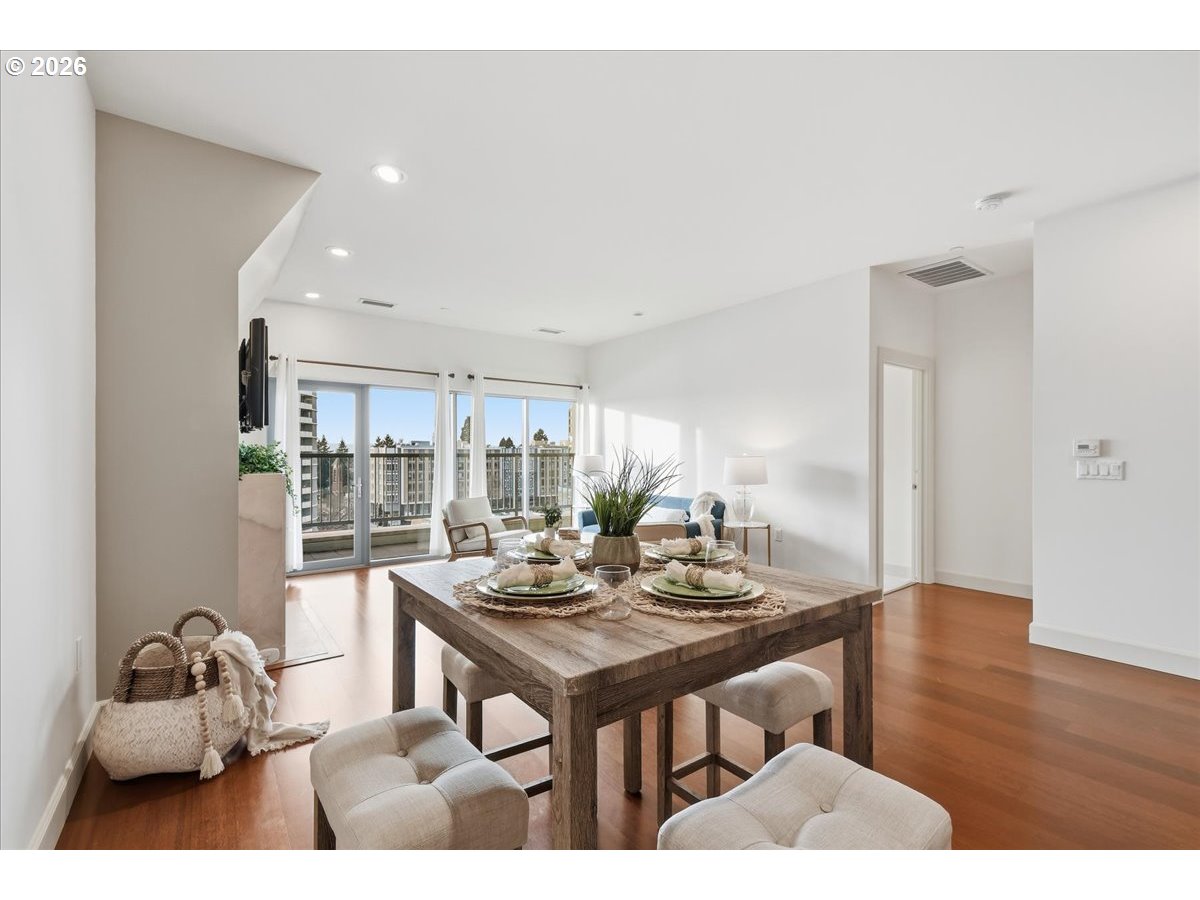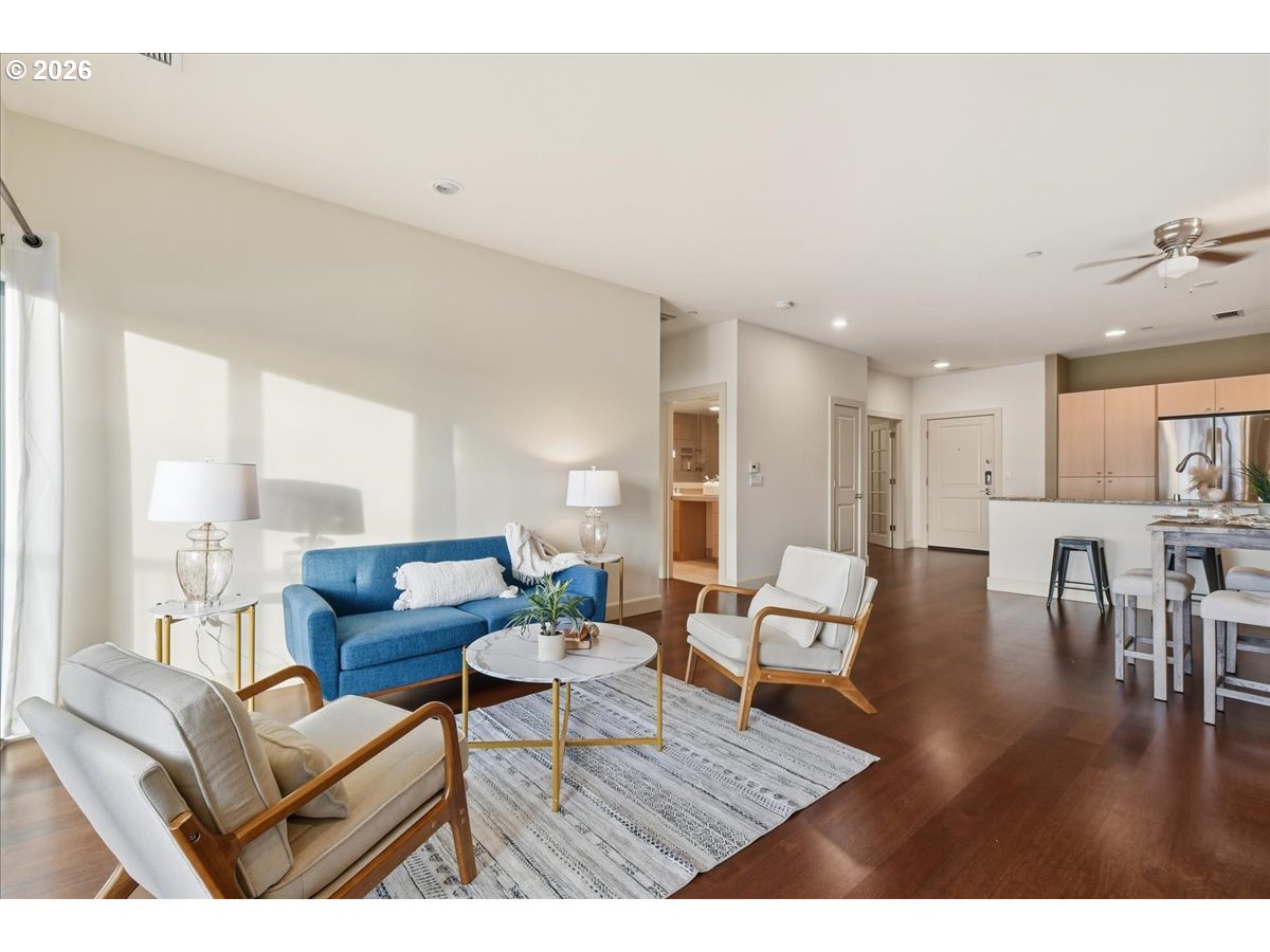 Life up top is a breeze in this spacious west-facing 1-bed/1-bath penthouse condo with a view! High ceilings and huge windows bathe this home in natural light and a dazzling cityscape. Brazilian cherry hardwood floors lend warmth and tasteful depth to the kitchen and open living area. In the kitchen, you'll find stainless appliances and tons of granite counter space. The gas stove will have you cooking with fire (and the HOA covers gas)! Kitchen cabinets were replaced in 2023. Kitchen countertop includes an eat bar. In the living room, a gas fireplace beckons you to get cozy, while a private balcony offers you a breath of fresh air high above burgeoning downtown Vancouver. Heavy-duty double pane windows help provide quiet & comfort in the heart of the city. The bedroom is bright and awash in natural light, with wall-to-wall carpet and a large closet. The tile bathroom has a long double vanity, extra storage, and walk-in tile shower with tile seat. French doors open to the den/office, where you'll also find the utility closet. All appliances stay. 1 block from Main St, 2 blocks from Esther Short park, and about 5 blocks to waterfront and upcoming Terminal 1 project. HOA dues cover gas, water/sewer, and trash--this kind of comprehensive utilities coverage is rare. Resident parking is covered, gated & secure; spots are deeded. Private storage units are in resident parking area. Residents also have a private elevator & mailroom, accessible only by key, code or fob. This condo offers both serenity and security in the city--who says you can't have your cake and eat it, too?!