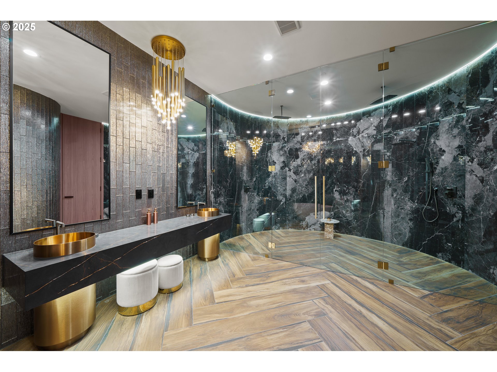 (503) 893-8874An architectural showpiece by Euro Design Homes NW, where artistry, innovation, and luxury converge. This striking modern estate makes an unforgettable first impression with its sculptural façade, bold lines, and touches of natural tile that add warmth to the contemporary design. Step through the grand entry and be greeted by a breathtaking spiral marble staircase illuminated by under-glow LED lighting and framed by a custom European chandelier, setting the tone for the elegance that unfolds throughout. The open-concept layout offers panoramic views and seamless flow between living spaces, anchored by a sleek linear water vapor fireplace surrounded by stone and tile. The gourmet kitchen is a true centerpiece, featuring a massive travertine waterfall island, minimalist cabinetry, and a fully equipped prep kitchen with built-in refrigerator, range, cooktop, and dishwasher. The primary suite is a private retreat in every sense, beginning with a walk-in closet that feels like a luxury boutique and continuing into a serene bedroom that opens to a private balcony overlooking lush greenery. The spa-inspired ensuite bathroom showcases a one-of-a-kind mix of textures and designer tile, a floating soaking tub, and a massive circular walk-in shower. Every bathroom throughout the home has its own distinctive, curated design. The lower level offers a dedicated space perfect for a home spa or gym, complete with a sauna that captures the view and an additional full bathroom. Step outside to a sprawling deck and covered patio ideal for year-round entertaining, with a firepit that invites you to relax and connect with nature. With five bedrooms, all featuring ensuite bathrooms, and a versatile den, this residence embodies refined sophistication and functional design at its highest level. Located near top-rated Camas schools, local parks, and scenic trails, this home represents the pinnacle of modern Northwest luxury living.