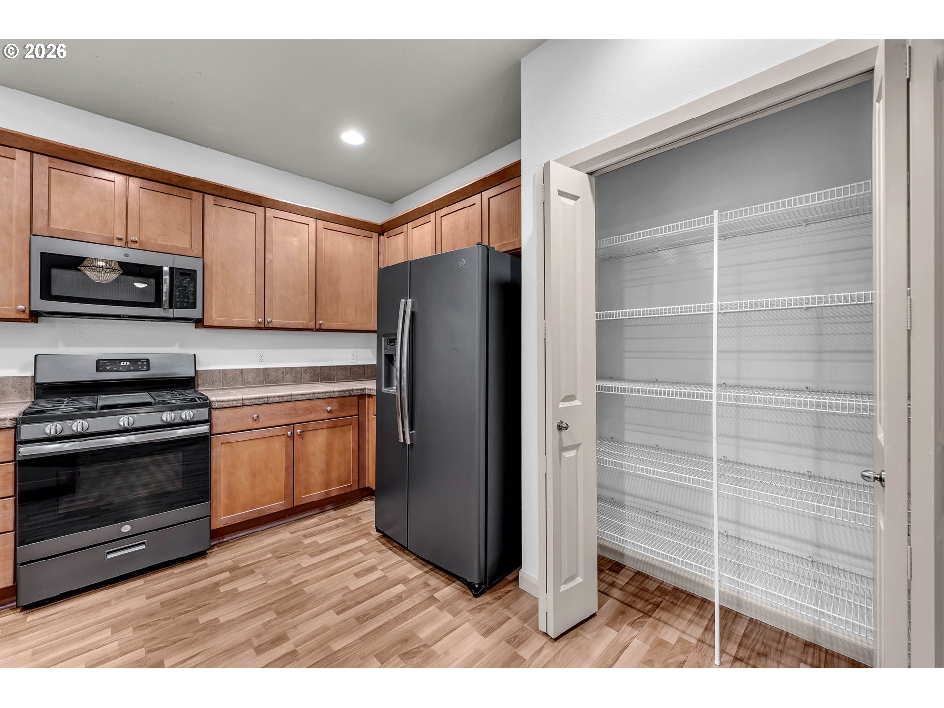 Dishwasher, FreeStandingGasRange, Island, Microwave, Pantry, StainlessSteelAppliance, Tile