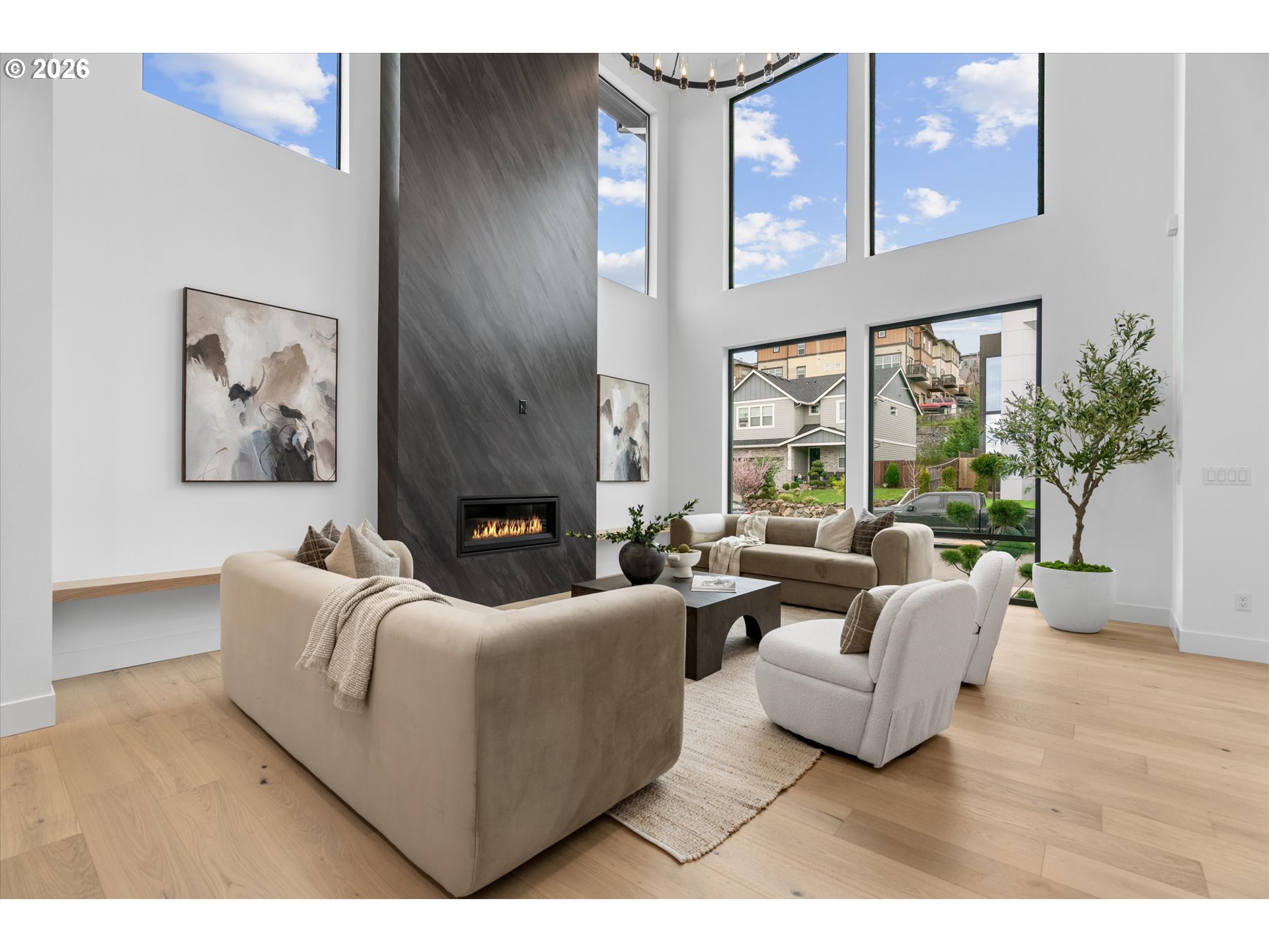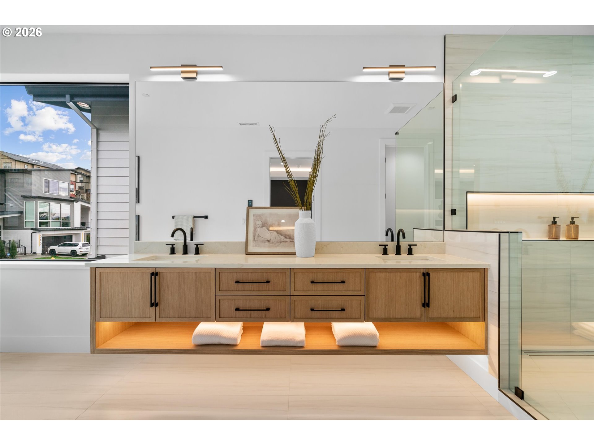 Custom modern luxury meets rare natural surroundings on one of the last remaining greenbelt lots in Spyglass Hill, located in the Camas School District. This stunning new construction offers 5 bedrooms and 5 bathrooms, including a versatile main-floor primary suite or office.The open-concept main level is designed for effortless living and entertaining, featuring a spacious living area, a beautifully appointed kitchen with a hidden pantry, and an open dining space that flows seamlessly to the deck overlooking peaceful outdoor green space. Downstairs, you’ll find a second spacious living area, bonus room, and private sauna. Upstairs offers 3 bedrooms, including a primary suite and guest suite, both with attached baths.Nearly every bedroom includes its own en suite, with expansive closet space in each of the homes closets.Enjoy seamless indoor-outdoor living with two decks, a large private yard, and a serene creek setting with seasonal peekaboo views of the Columbia River.A truly rare opportunity.