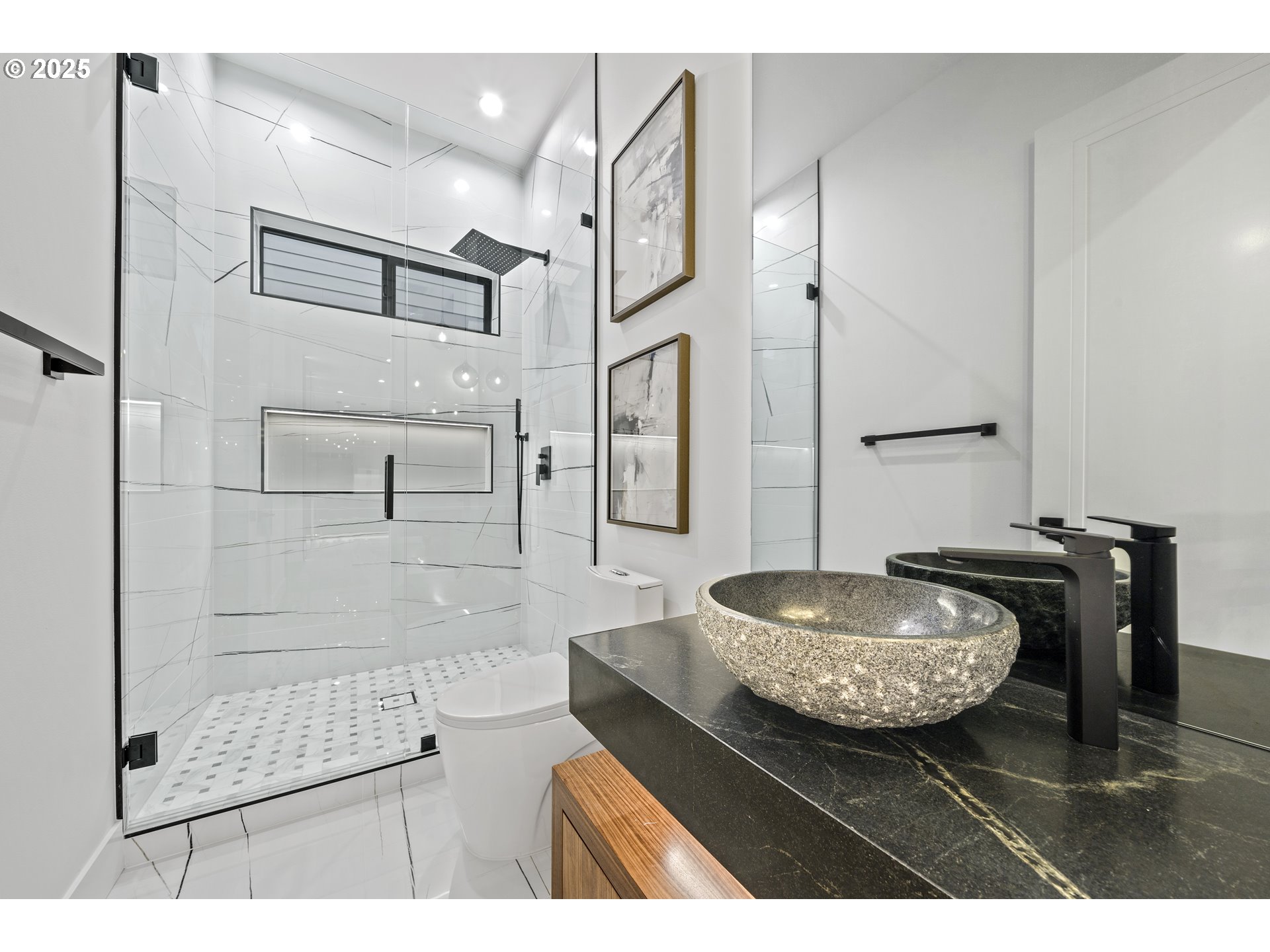 Breathtaking modern design, by reputable local custom home builder. This is one of their most sought after and popular floor plans. As you walk in the grand entry way and make your way to the inviting great room, you will find Cathedral ceilings, and stunning large windows looking out to the lush greenbelt. Walk outside to the large covered patio and enjoy the sound of birds chirping. In addition, on the main floor you will find your luxurious kitchen with a large island, and a spacious butlers pantry. The main floor also offers an office, and a cozy study. Making your way to the lower level you will find a large theater room, and a bonus guest suite. The upper level showcases the lavish primary suite, along with 3 well thought out additional bedrooms. This is one of the last greenbelt lots in Spyglass Hill, boasting Camas Schools, and an incredible opportunity to own rare, hard to find luxury real estate in Clark Counties top area.