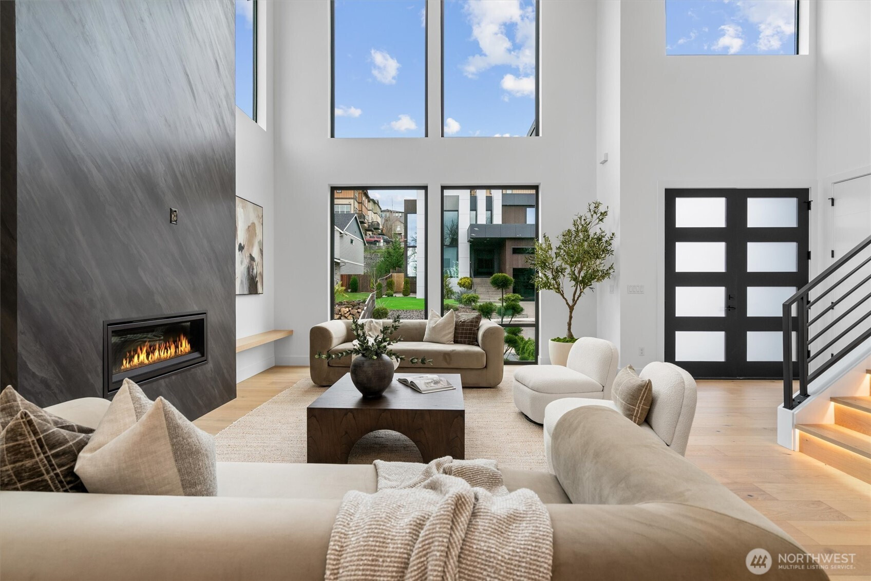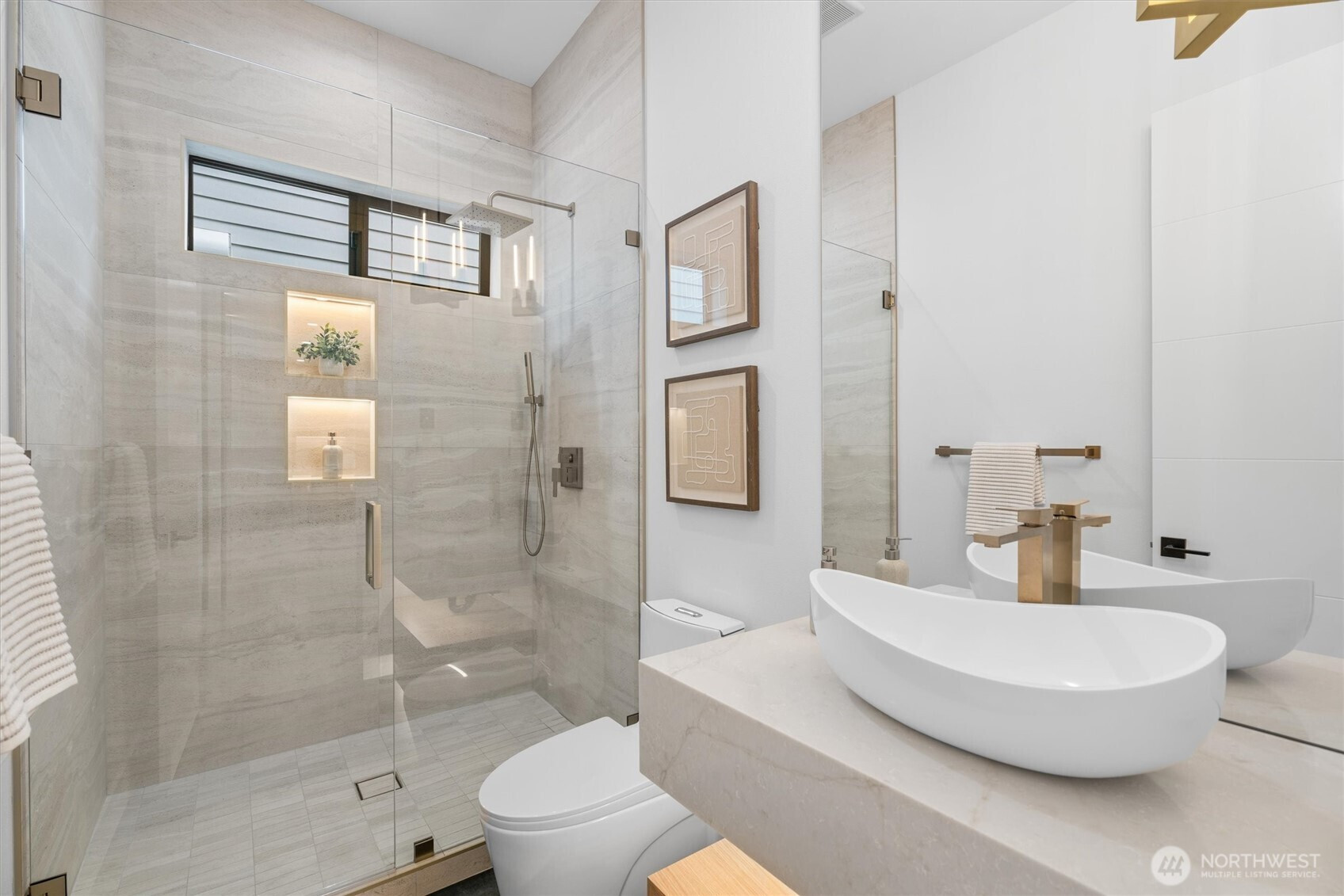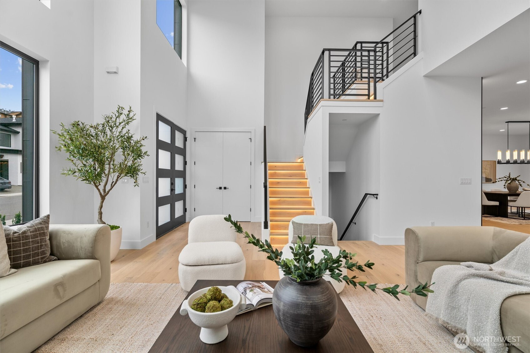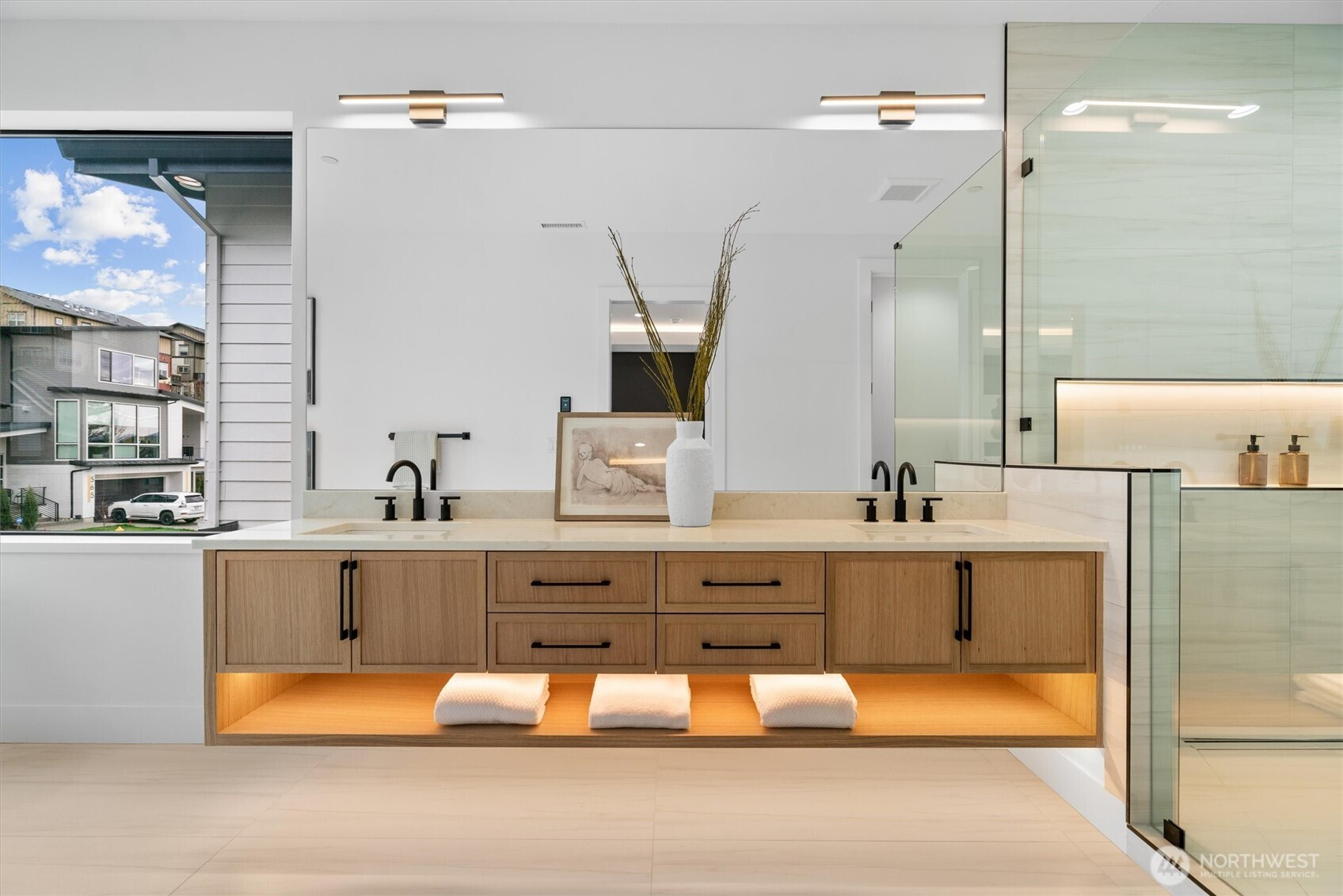 Custom modern luxury meets rare natural surroundings on one of the last remaining greenbelt lots in Spyglass Hill, located in the Camas School District. This stunning new construction offers 5 bedrooms and 5 bathrooms, including a versatile main-floor primary suite or office. The open-concept main level is designed for effortless living and entertaining, featuring a spacious living area, a beautifully appointed kitchen with a hidden pantry, and an open dining space that flows seamlessly to the deck overlooking peaceful outdoor green space. Downstairs, you’ll find a second spacious living area, bonus room, and private sauna. Upstairs offers 3 bedrooms, including a primary suite and guest suite, both with attached baths. Nearly every bedroom includes its own en suite, with expansive closet space in each of the homes closets. Enjoy seamless indoor-outdoor living with two decks, a large private yard, and a serene creek setting with seasonal peekaboo views of the Columbia River. A truly rare opportunity.