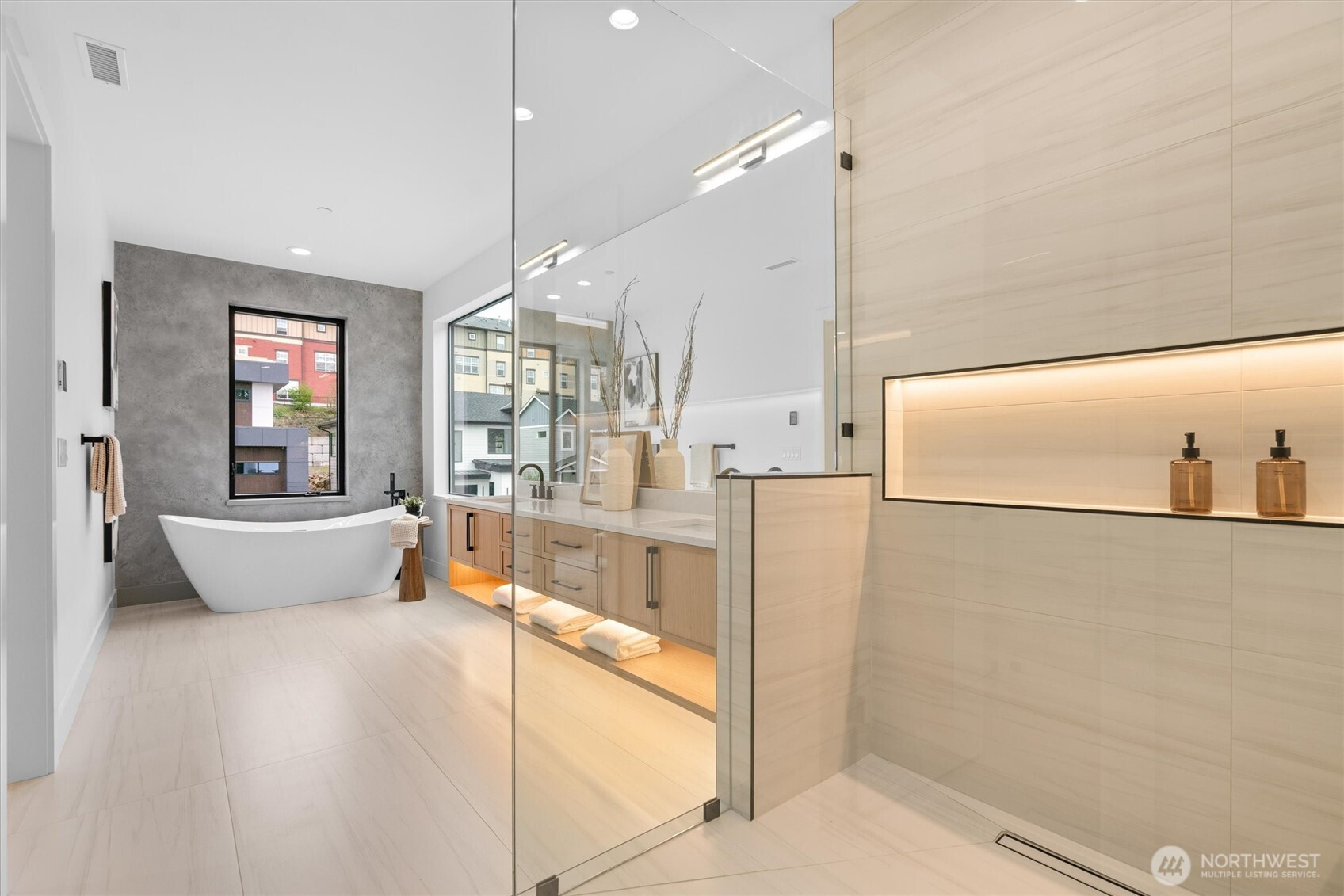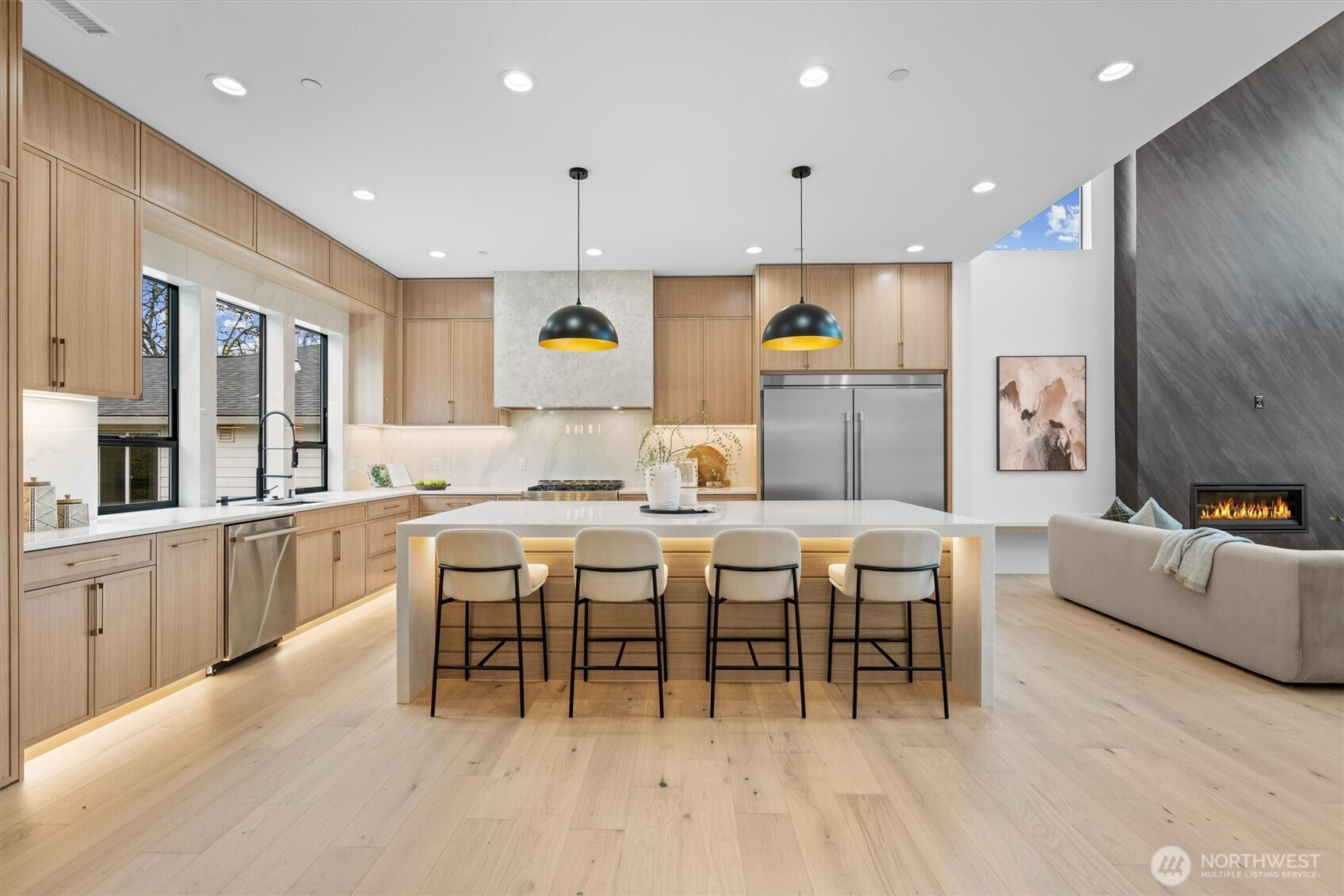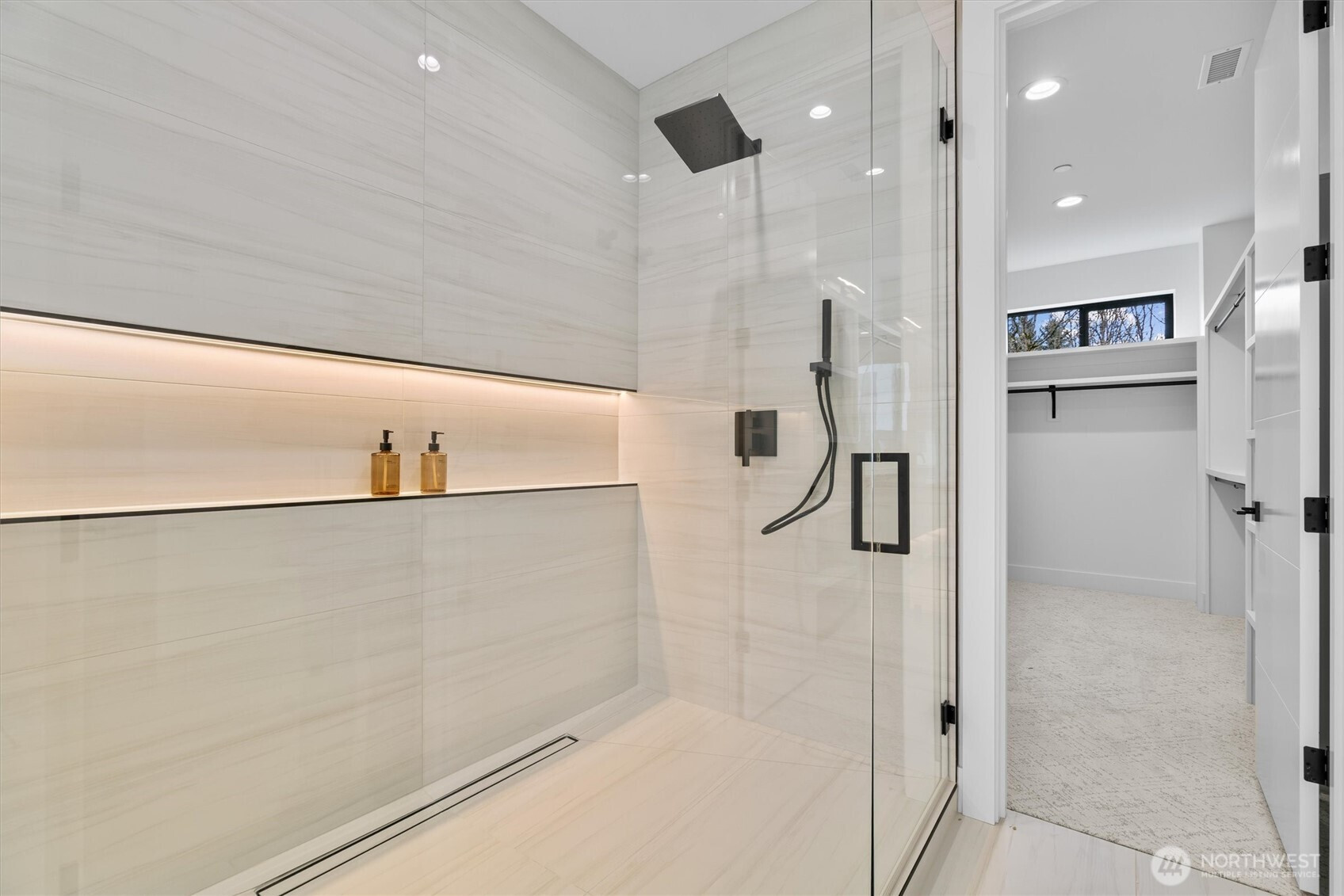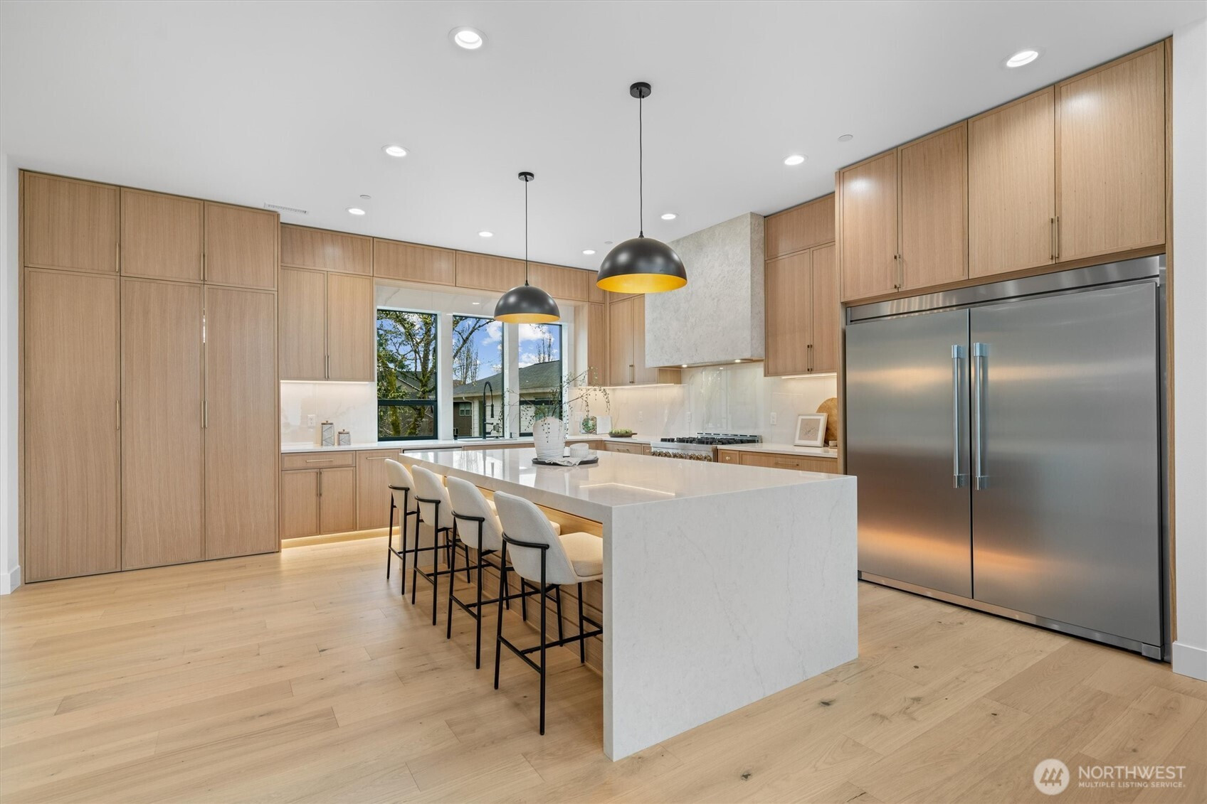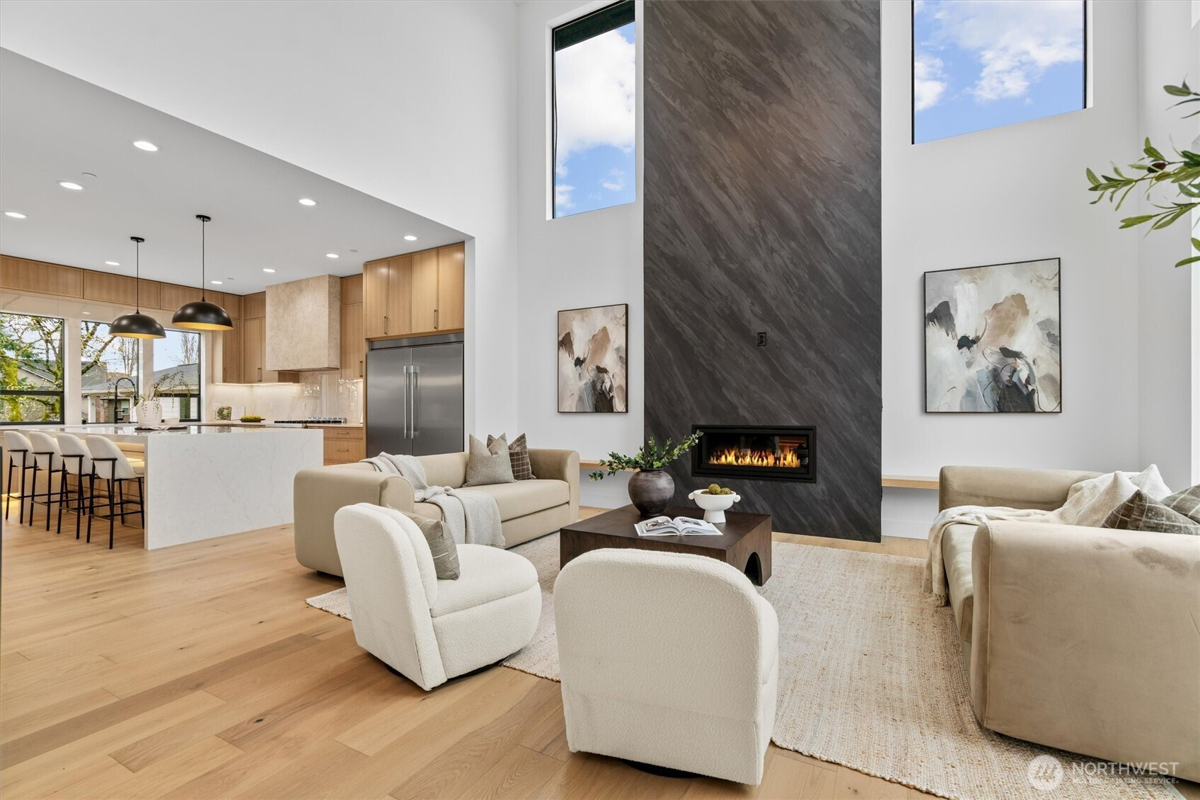 Custom modern luxury meets rare natural surroundings on one of the last remaining greenbelt lots in Spyglass Hill, located in the Camas School District. This stunning new construction offers 5 bedrooms and 5 bathrooms, including a versatile main-floor primary suite or office. The open-concept main level is designed for effortless living and entertaining, featuring a spacious living area, a beautifully appointed kitchen with a hidden pantry, and an open dining space that flows seamlessly to the deck overlooking peaceful outdoor green space. Downstairs, you’ll find a second spacious living area, bonus room, and private sauna. Upstairs offers 3 bedrooms, including a primary suite and guest suite, both with attached baths. Nearly every bedroom includes its own en suite, with expansive closet space in each of the homes closets. Enjoy seamless indoor-outdoor living with two decks, a large private yard, and a serene creek setting with seasonal peekaboo views of the Columbia River. A truly rare opportunity.