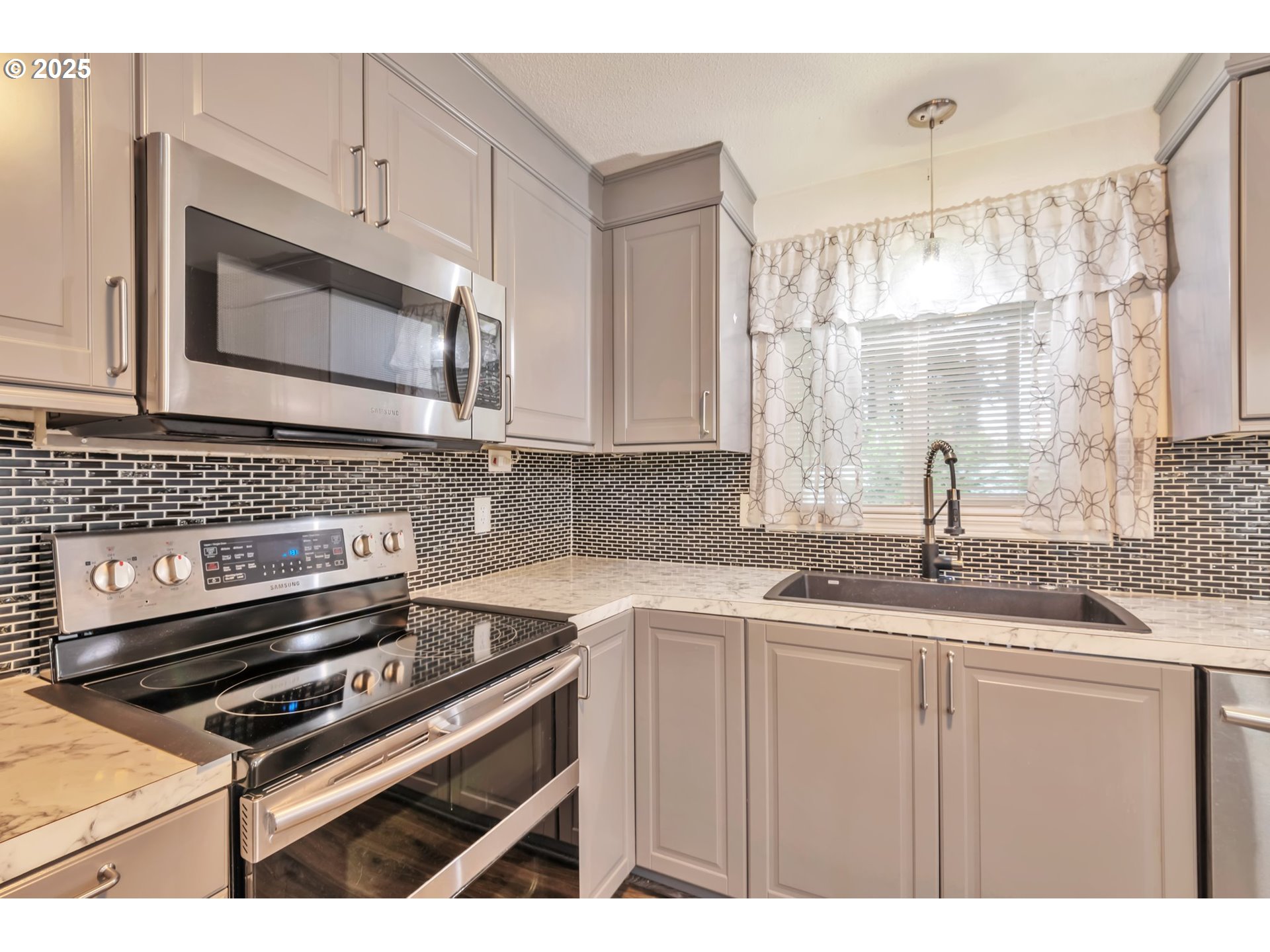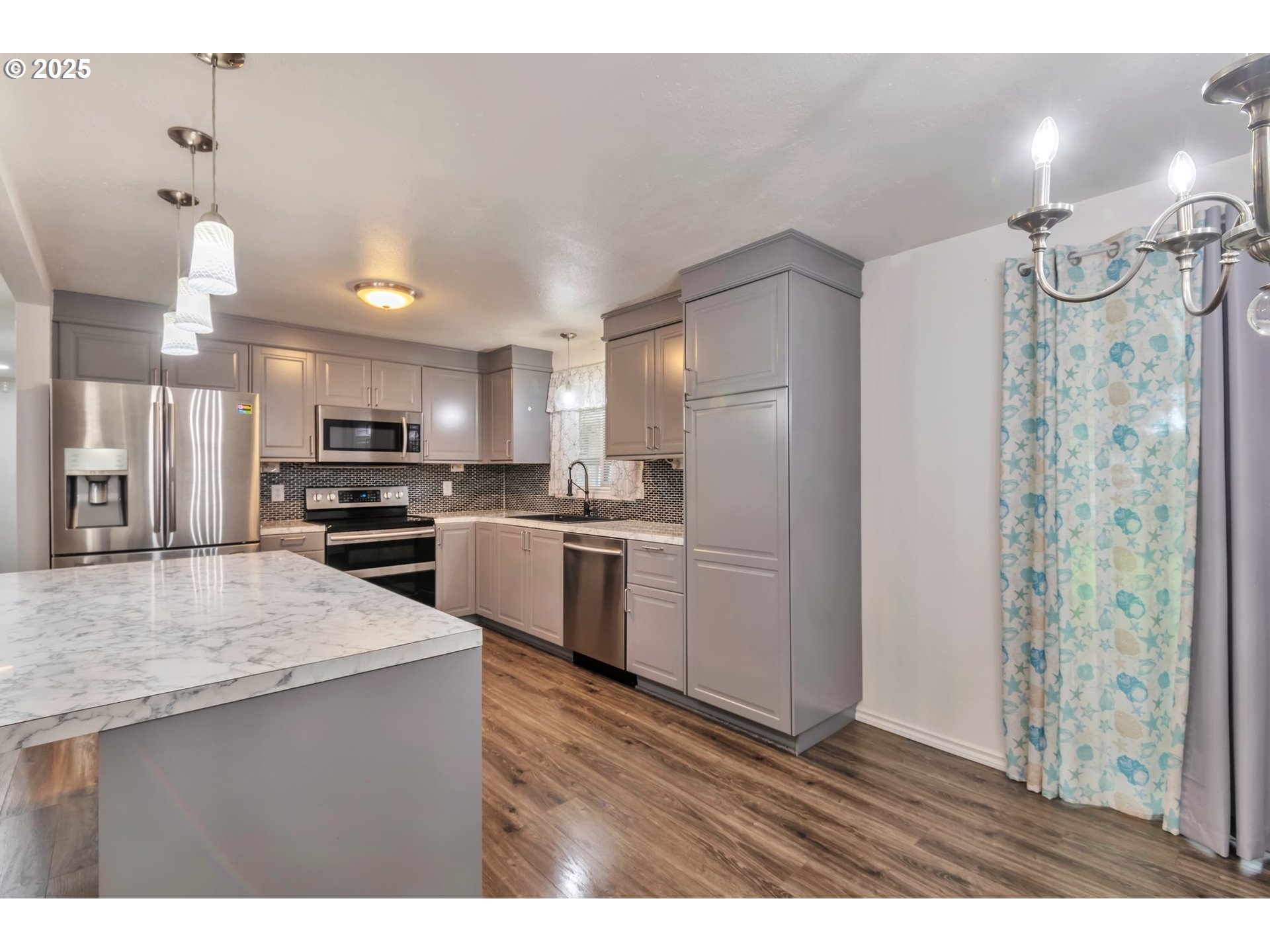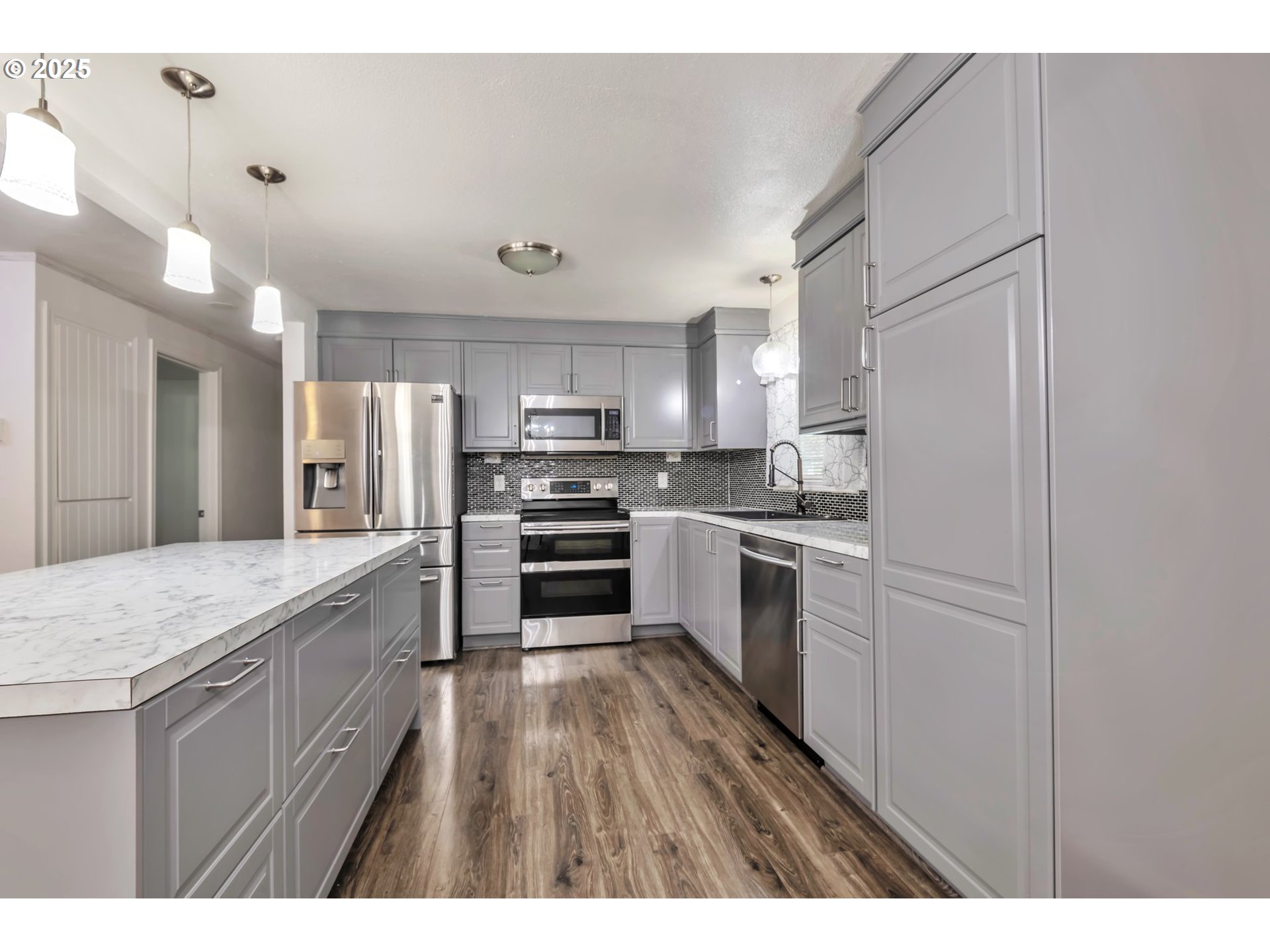 Dishwasher, FreeStandingRange, FreeStandingRefrigerator, Island, Microwave, StainlessSteelAppliance, Tile
