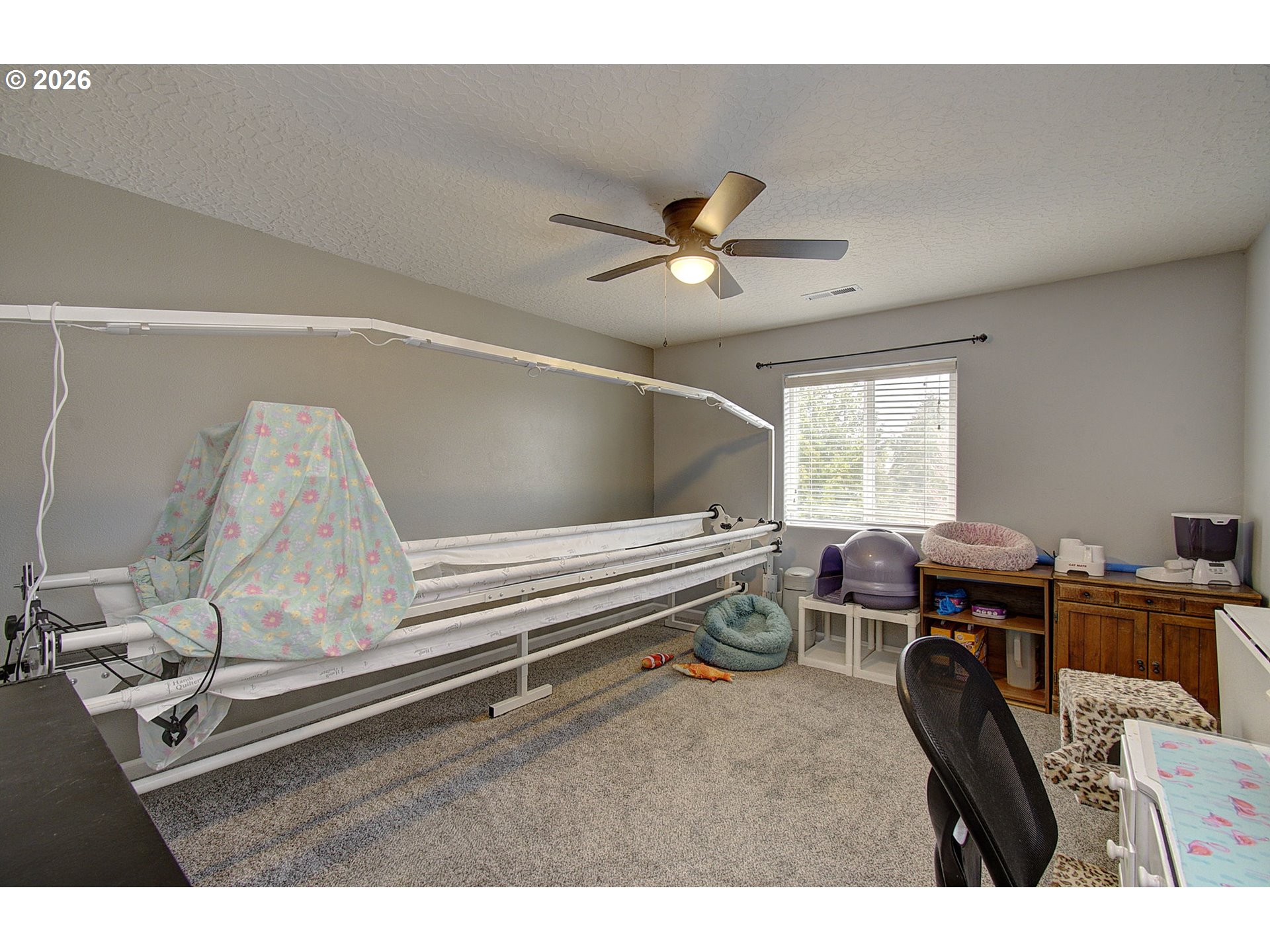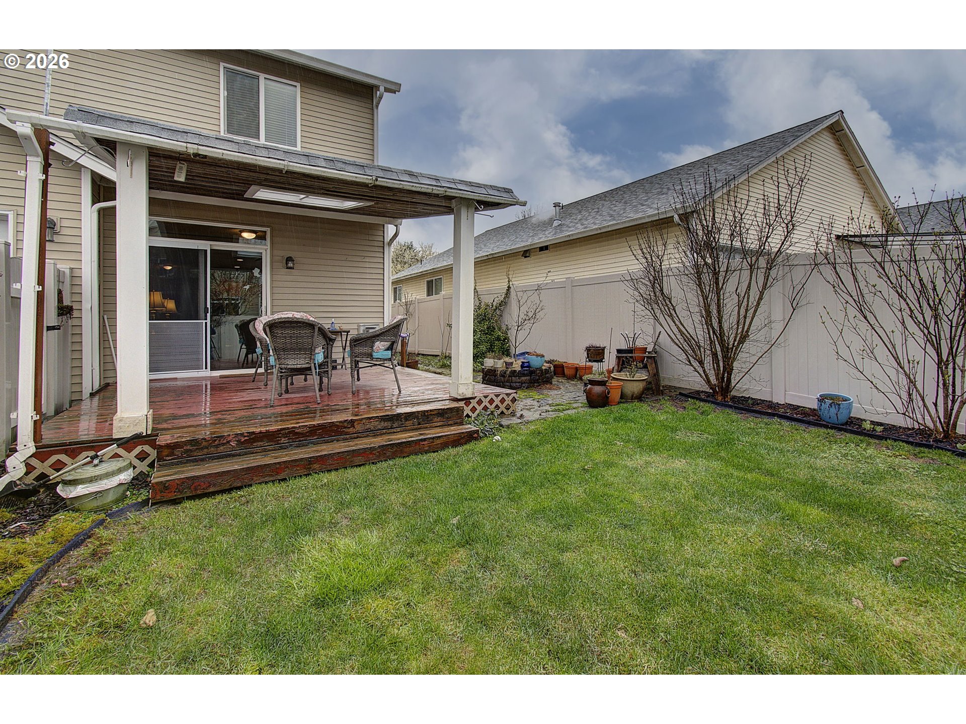 Well-maintained 4-bedroom, 3-bath, two-story home featuring laminate flooring throughout the main level. The formal dining room includes updated lighting, and the kitchen is equipped with stainless steel appliances, new countertops, and a tile backsplash. A main-level office with built-in cabinetry provides functional workspace. The living room offers a gas fireplace and overlooks the backyard. All bedrooms are located upstairs and are generously sized. The primary suite includes a deep soaking tub, walk-in shower, dual vanities, and a walk-in closet. Ample storage is available throughout the home. The exterior features a fully fenced backyard with a covered deck and designated entertaining area. Raised garden beds are located along the alley side of the property. RV parking is available in the driveway.