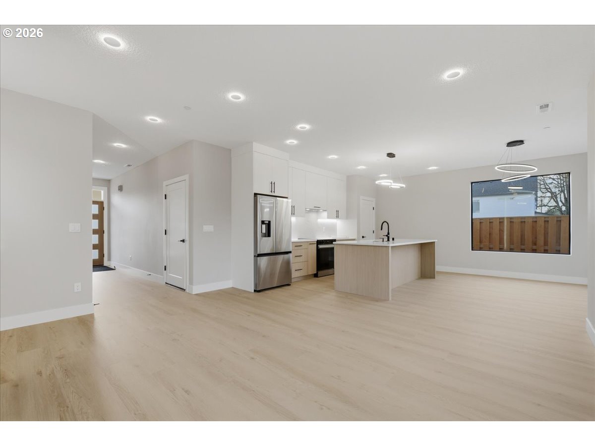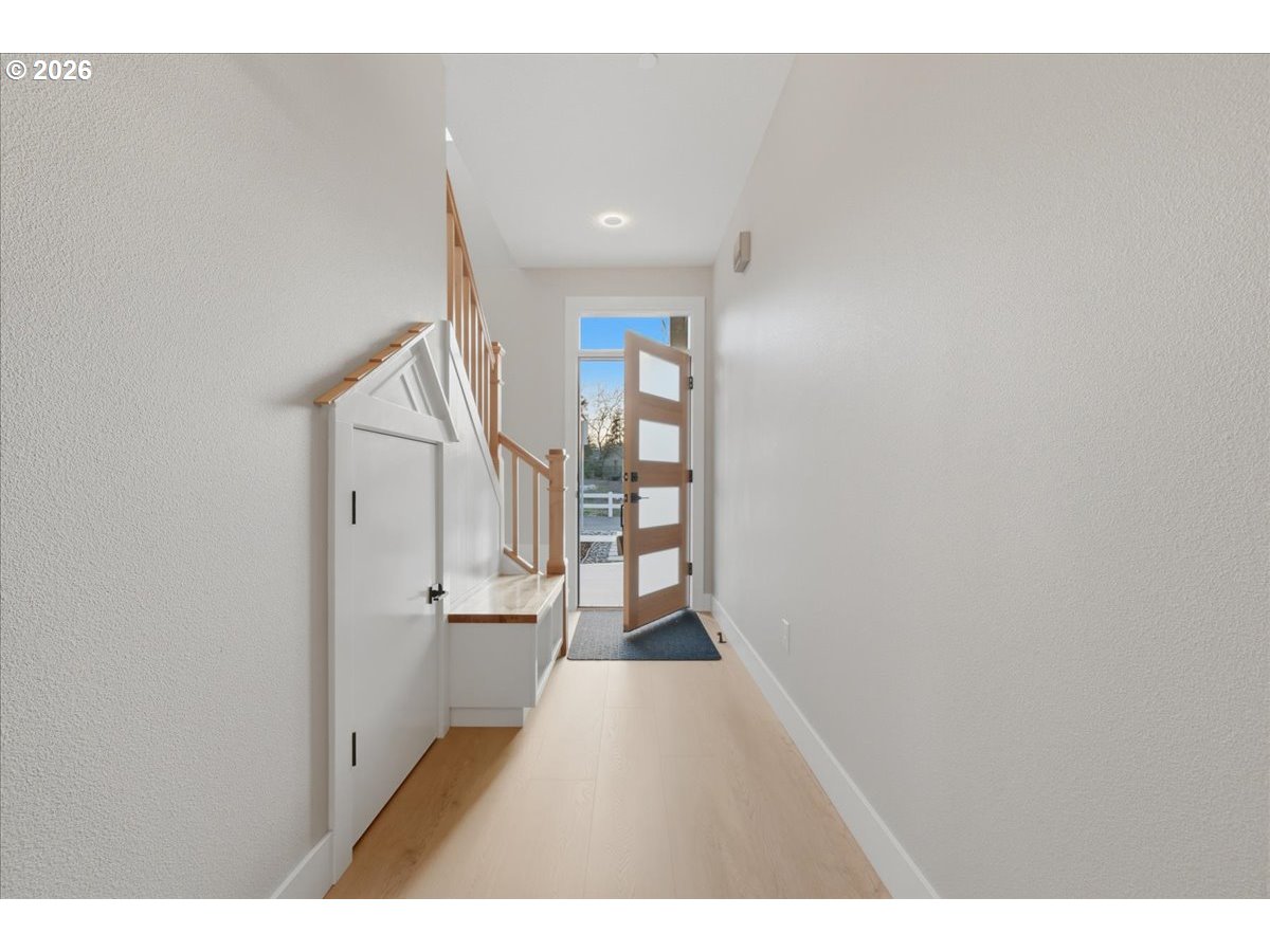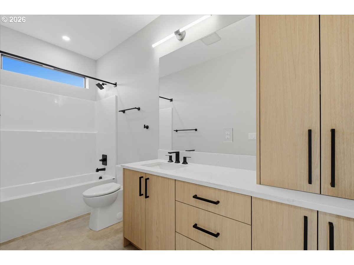 This beautifully crafted new construction home showcases contemporary custom design with 9-foot ceilings throughout and an abundance of natural light, all tucked away in a private setting. The main level features durable luxury vinyl plank flooring, unique designer lighting, and a spacious great room concept highlighted by expansive picture windows and a sleek contemporary fireplace with ambient backlighting. The kitchen impresses with custom soft-close cabinetry, gorgeous quartz countertops, a pantry, and stainless-steel appliances, while a sliding door opens to a covered patio and a fully fenced, low-maintenance backyard with turf—perfect for year-round enjoyment. Upstairs, the inviting and spacious primary en suite is vaulted and filled with natural light, offering tile floors, a mud-set shower, quartz counters, and double sinks. Two additional vaulted bedrooms feature built-in closet systems and generous sizing, complemented by a stylish hall bath with luxury vinyl floors, quartz counters, and a vanity tower. A well-appointed laundry room includes luxury vinyl flooring, a utility sink with quartz counters and custom shelving. The finished two car garage boasts stylish lighting and baseboard. This home offers a rare level of quality and craftsmanship at this price point, all conveniently located near parks, restaurants, shopping, and easy access to Vancouver’s premier waterfront. Call about our rate buy down incentive!
