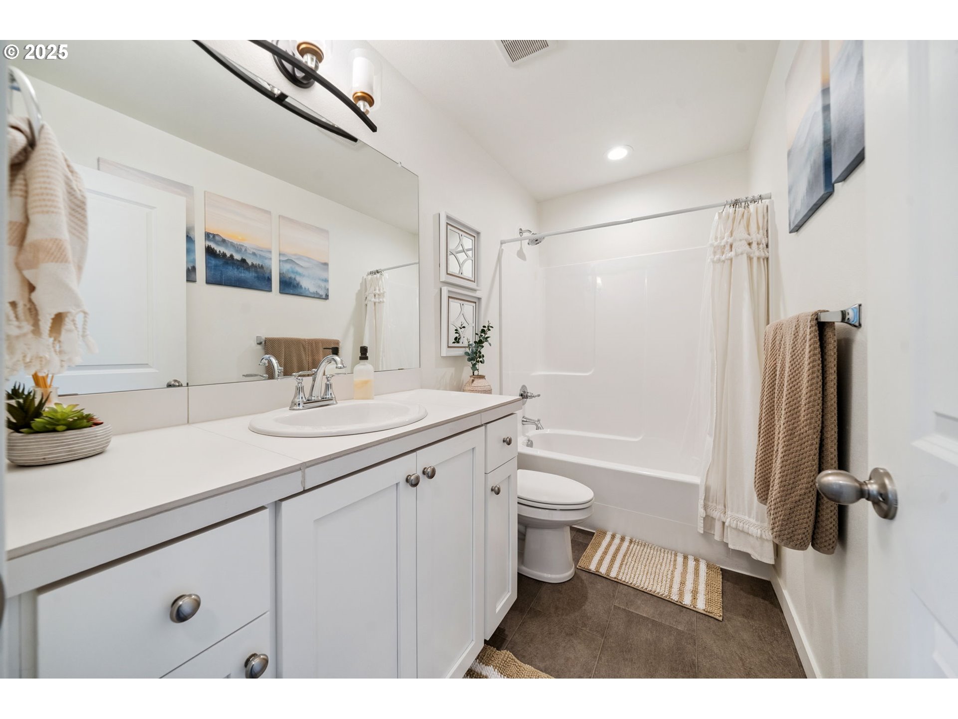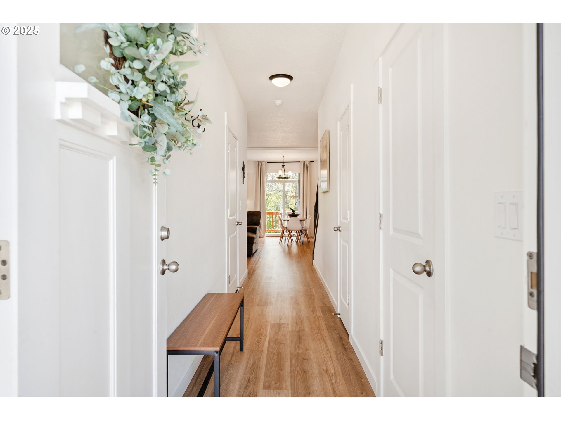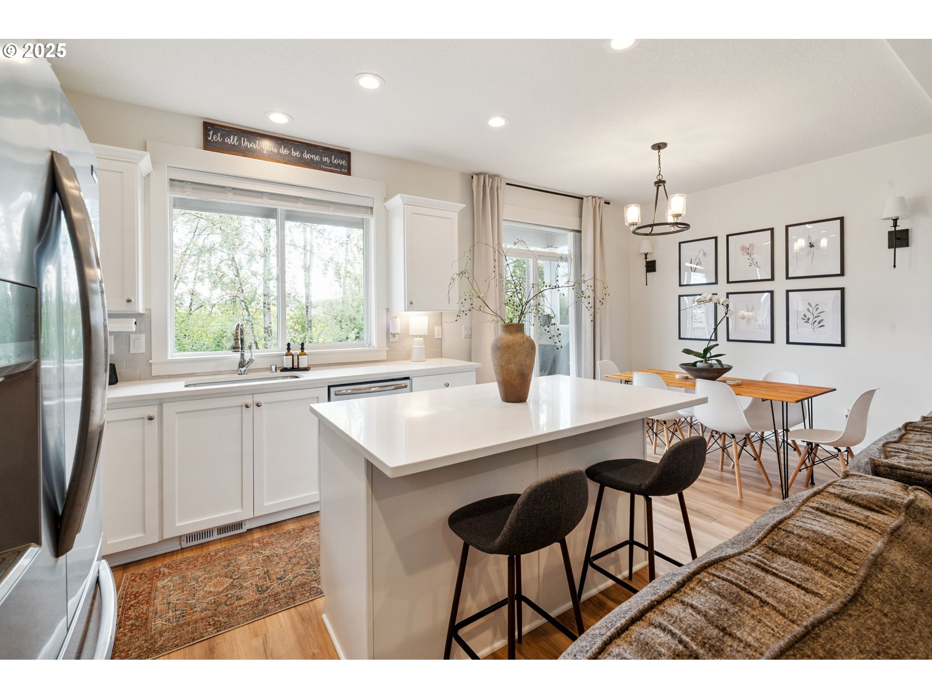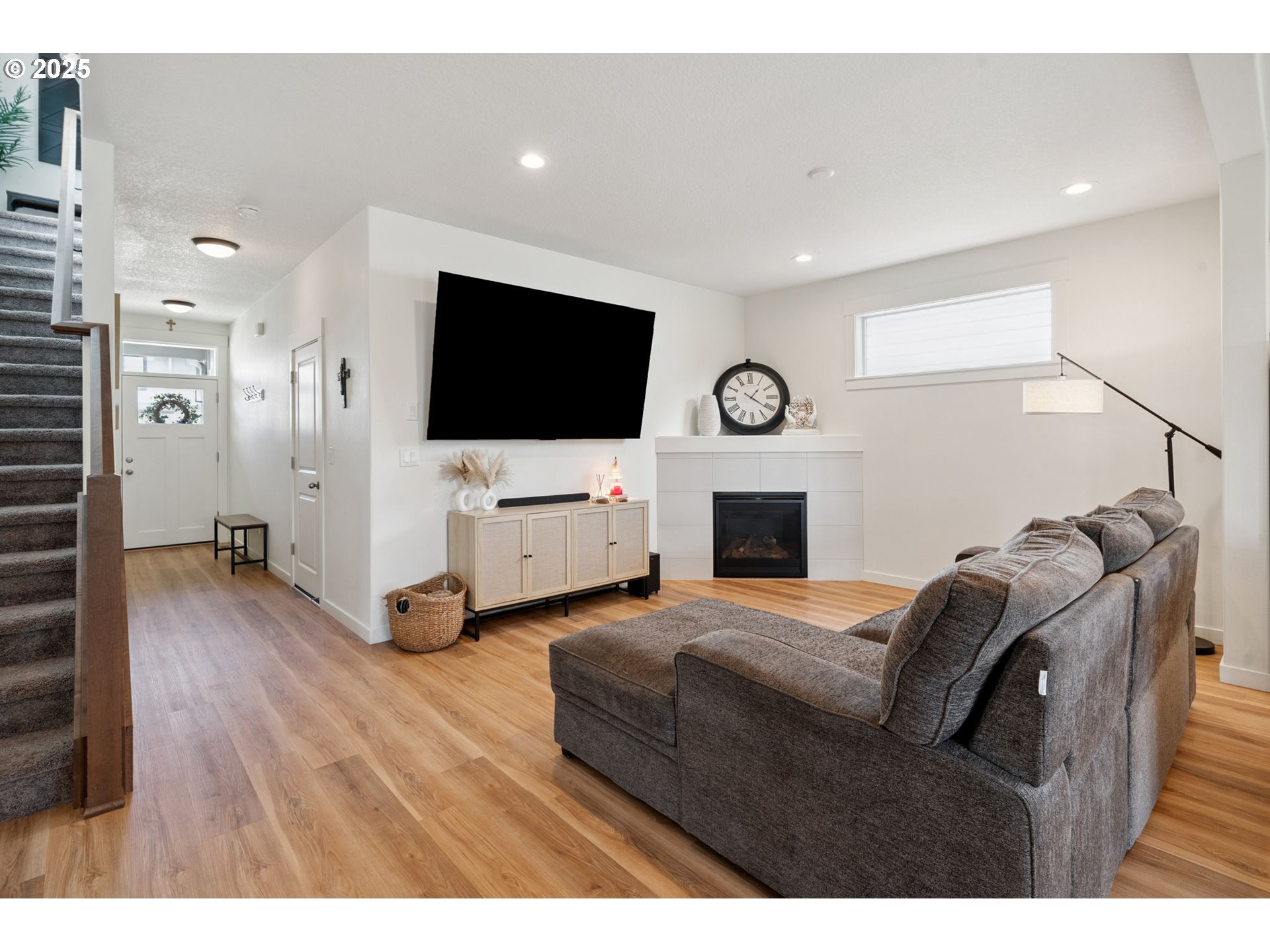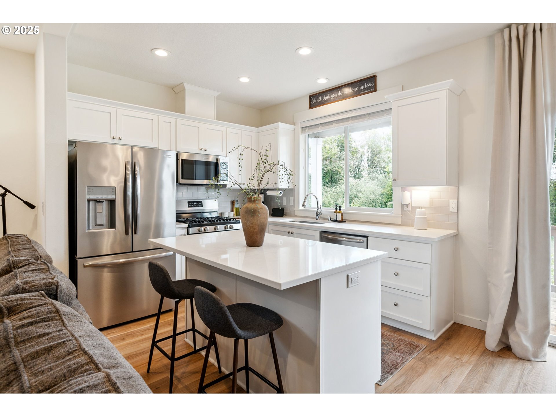 Welcome to this wonderful home community surrounded by open green space, a neighborhood park, and serene walking trails. Located near Costco, In-N-Out, coffee shops, and a variety of restaurants, this home offers both comfort and convenience. The home features a stylish kitchen with quartz countertops, painted cabinetry, and stainless steel gas appliances. Enjoy the spacious open-concept great room, complete with a gas fireplace and elegant tile surround. Durable and stylish luxury vinyl plank flooring extends throughout the main level. The generous primary suite includes a walk-in closet and a spa-inspired bathroom with dual sinks and a custom tiled shower. Additional highlights include fully wrapped interior windows, brushed nickel hardware, and upscale modern lighting throughout. Step out onto the covered back deck and take in the tranquil views of the adjacent habitat conservation area.