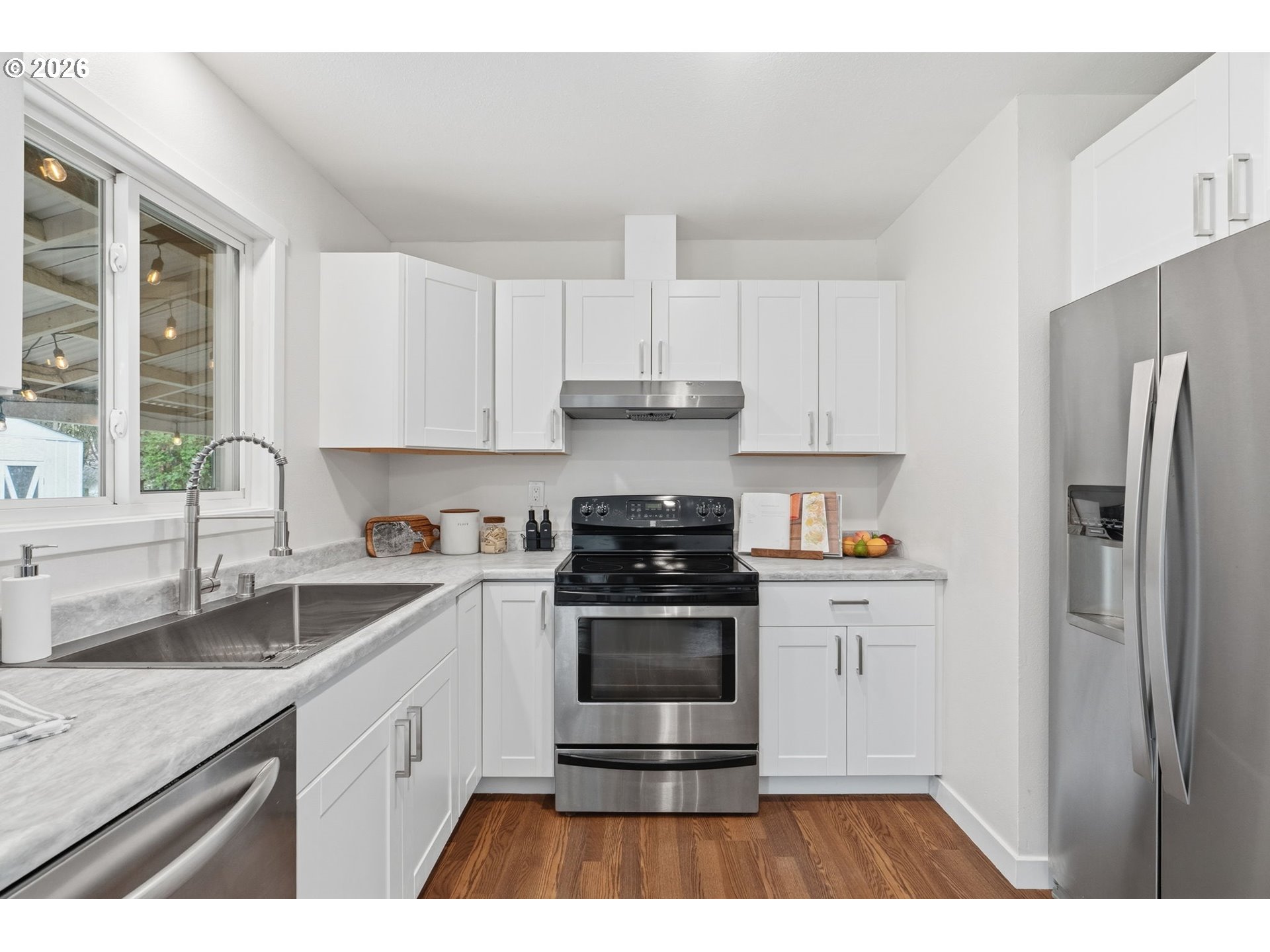 Beautifully remodeled ranch style home in the heart of Vancouver. Nearly everything in this home is new. The main living area features upgraded lighting, LVP flooring throughout new paint, and cabinetry hardware. In the kitchen you'll find new counter tops, sink, a high efficiency stove vent hood, and, a built in dishwasher. The bathroom which has been fully remodeled boasts a new shower/tub, sink, vanity, lighting and accenting. The primary bedroom has been given separate access to the bathroom allowing both privacy, as well as access for the rest of the home. New carpet, paint and lighting has also been installed in the bedrooms. The roof is new, and gutter system improved for both aesthetics, and efficiency. The back yard being fully fenced has a covered patio for those stormy PNW winters, as well as a separate tool shed. (See attached property feature sheet for ALL of the upgrades)