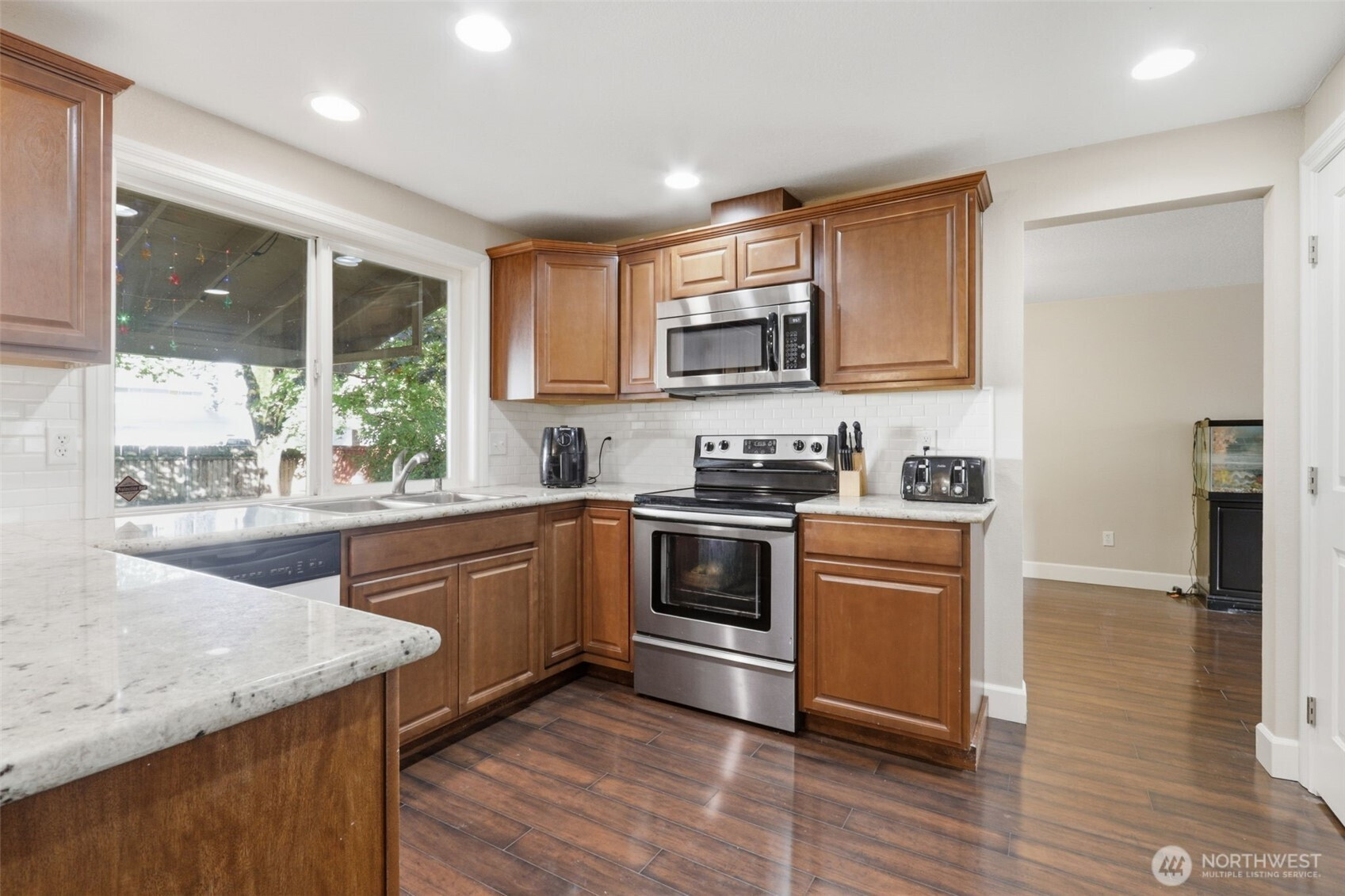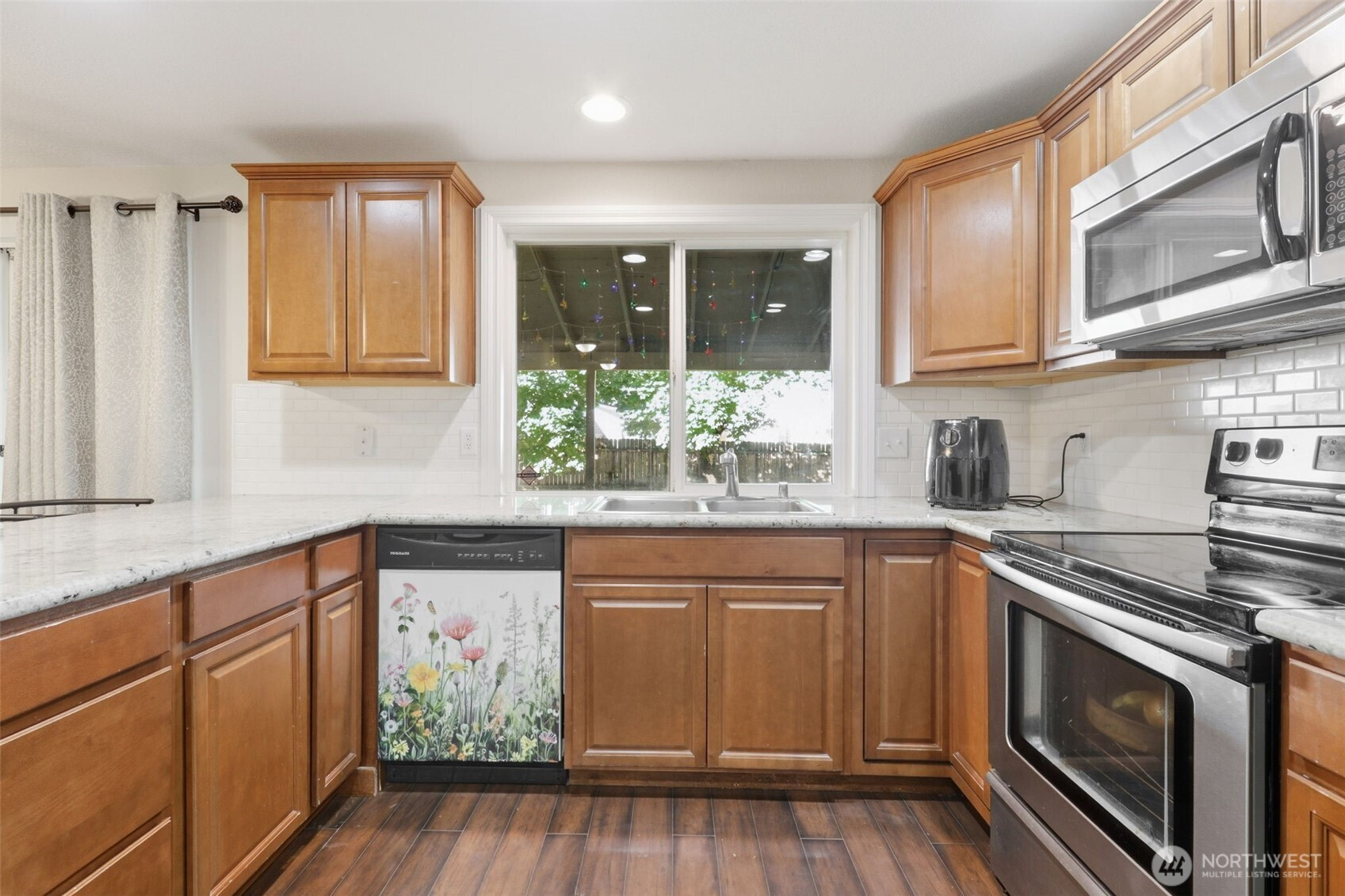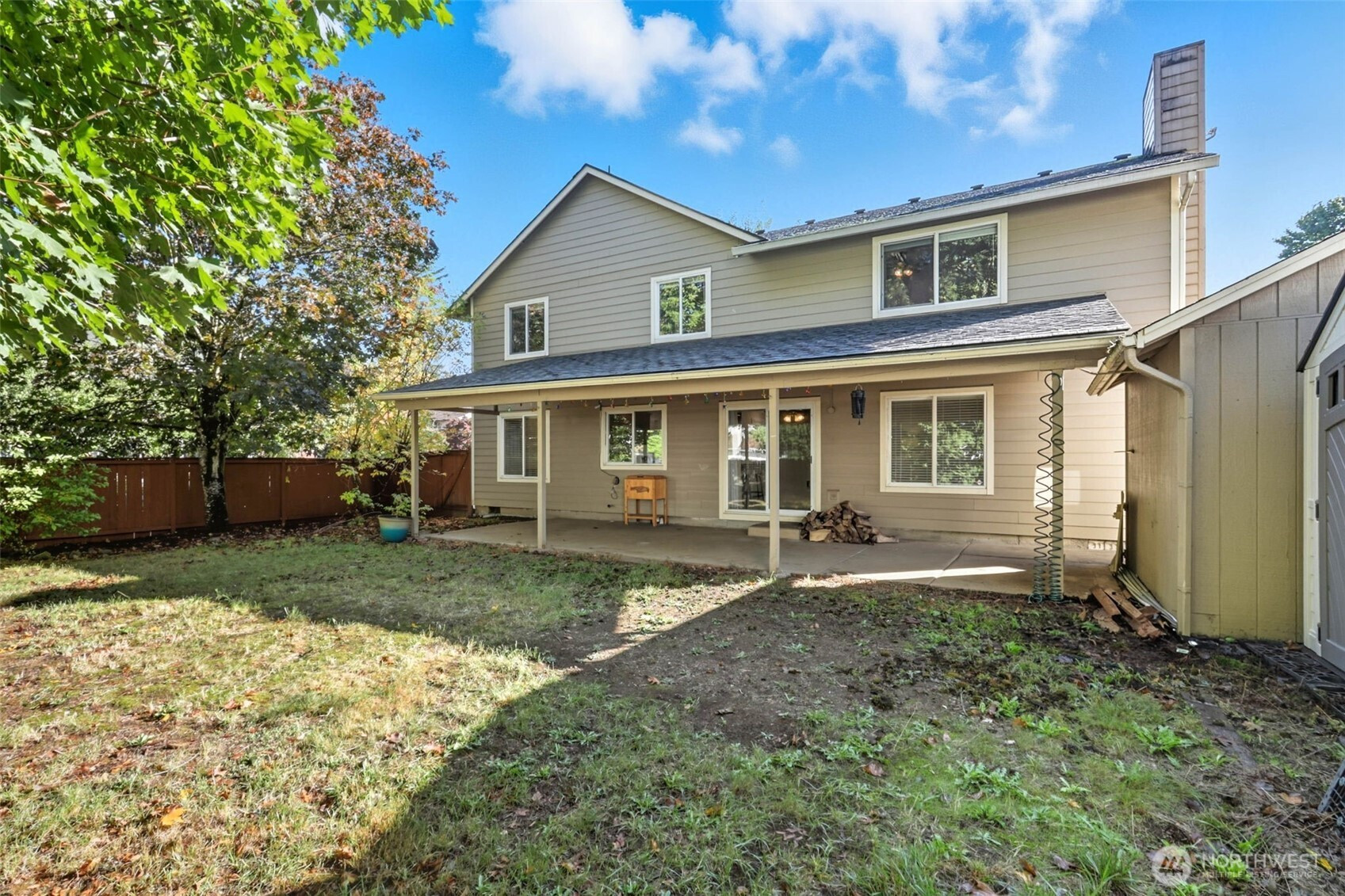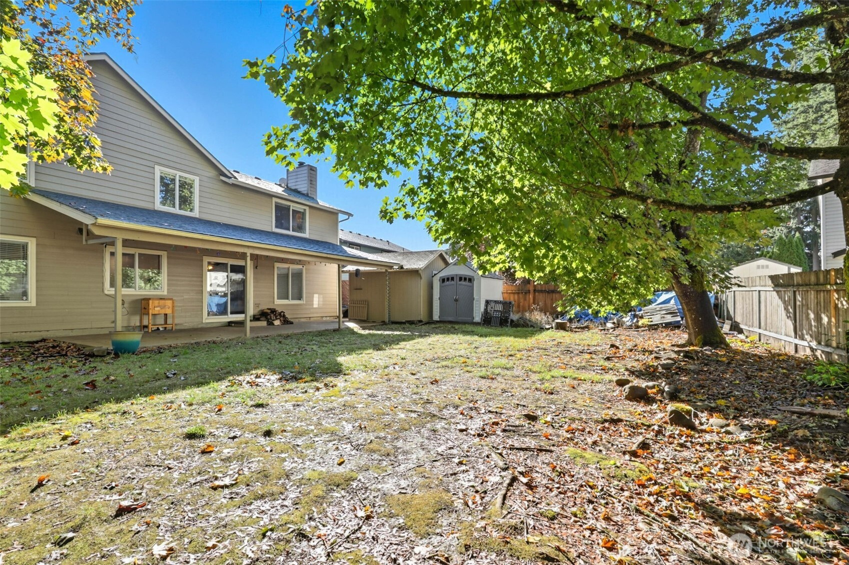 Wow, what a great deal! This spacious 5-bedroom home sits on a large corner lot, offering plenty of room for everyone. The main floor features laminate flooring throughout, both formal and casual living areas, a cozy wood-burning fireplace, and a bright kitchen with granite countertops and stainless steel appliances. Upstairs, the primary suite boasts a bay window and walk-in closet, while the fifth bedroom is large enough to serve as a bonus room, office, or play area. Step outside to a big covered patio and a private backyard with mature trees and a tool shed—perfect for gardening, BBQs, or relaxing outdoors. With so much space and a great location near parks, schools, and shopping, this home truly has it all!