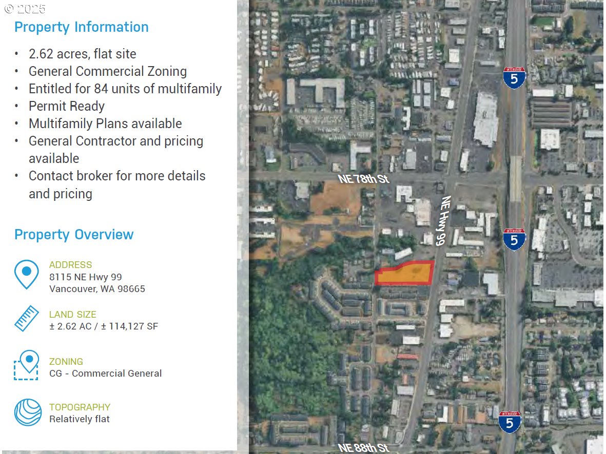 2.6 acres of high visibility land in the core of Hazel Dell in Vancouver. The property is fully entitled for 84 units of multifamily and permits can be in hand quickly. Call broker for pricing guidance and construction pricing.