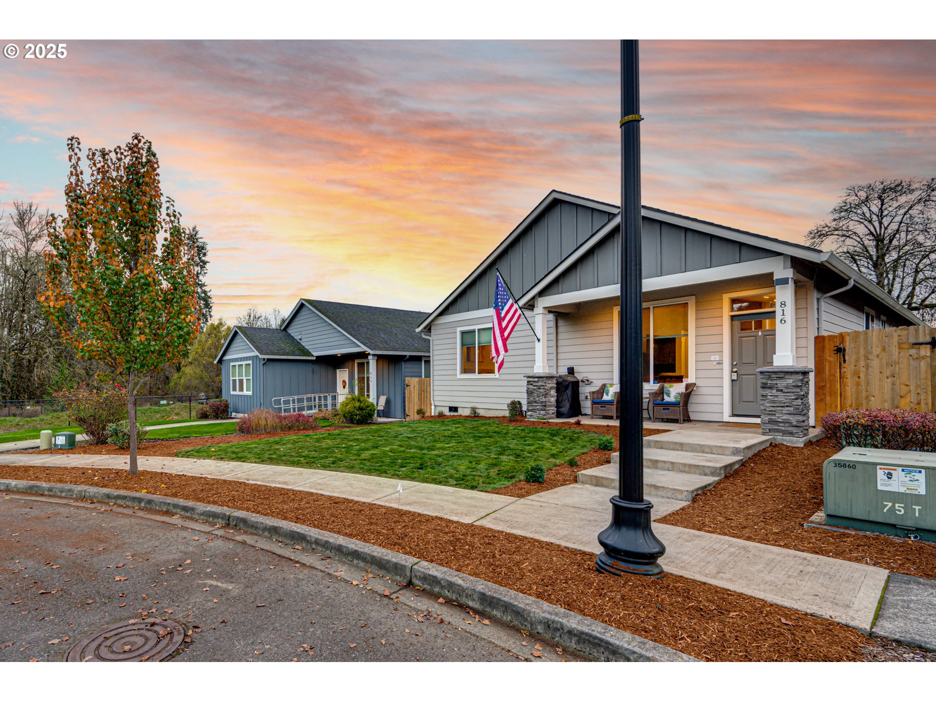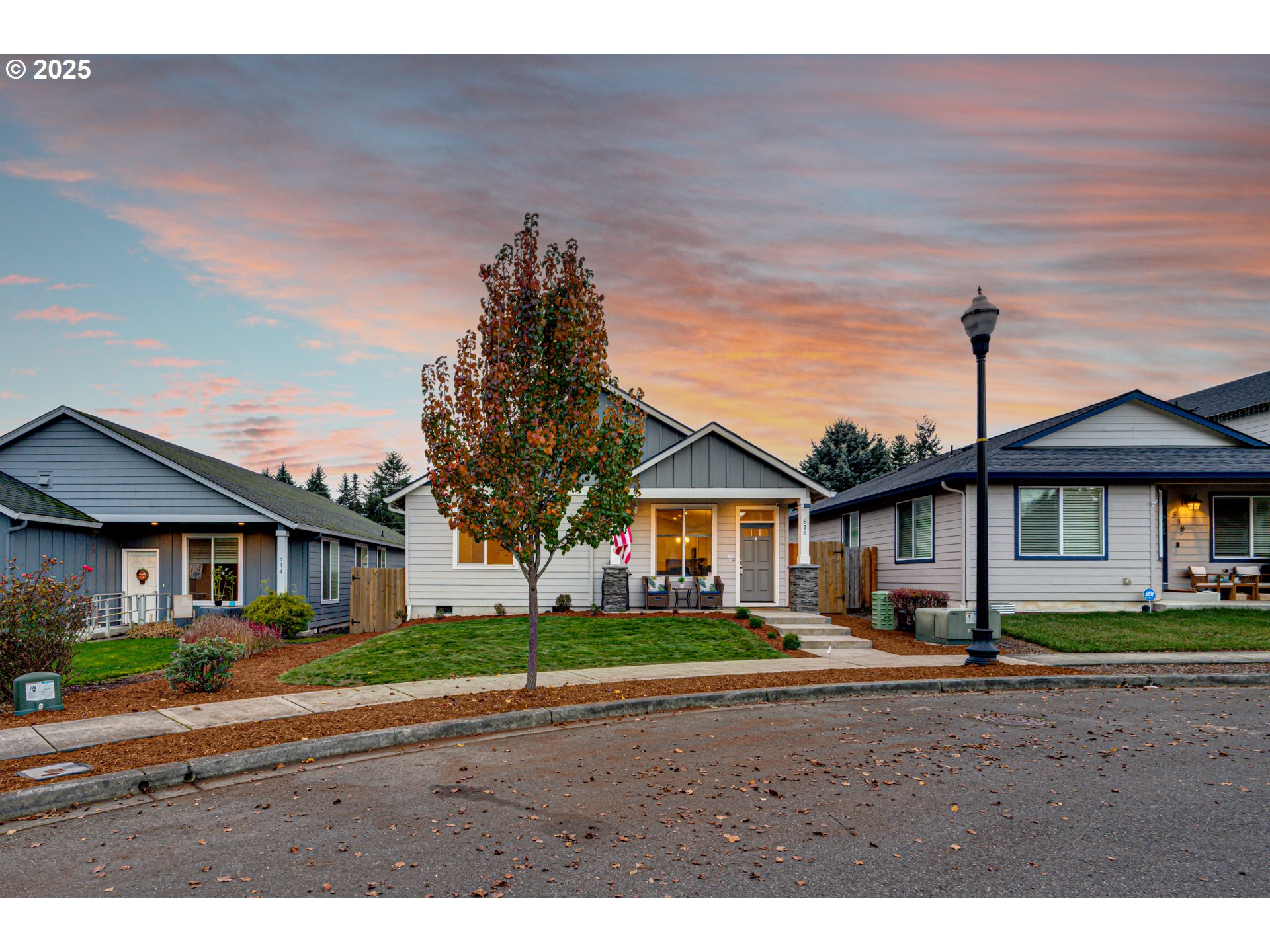 Built in 2019, this 3-bedroom, 2-bath home is well-designed with a vaulted, open great-room layout. The kitchen includes a gas range, stainless-steel appliances, and generous counter and cupboard space. LVP flooring extends through the main living areas, with carpet in the bedrooms for added comfort. A covered back patio and fenced yard with gated alley access offer practical outdoor use. Permanent, programmable roofline lighting sets the perfect atmosphere for holidays and celebrations year-round. Located on a low-maintenance lot in a quiet cul-de-sac just moments from town, within walking distance to downtown shops and restaurants. This home is a solid fit for a first-time buyer or anyone looking to downsize while keeping everyday convenience.