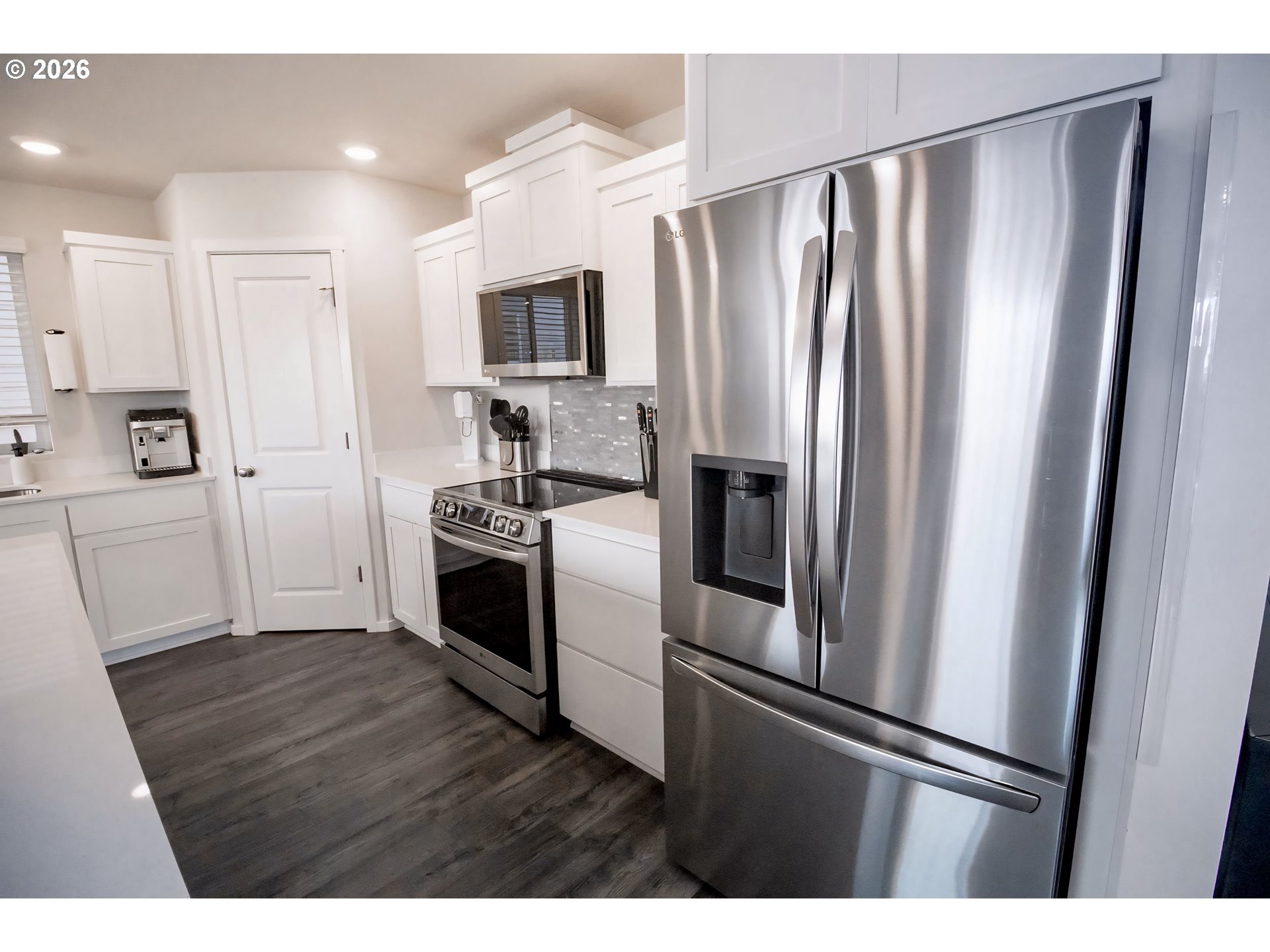 Discover this beautifully maintained 4-bedroom, 2.5-bath corner lot home with a 2-car garage offering 1,819 sq ft of comfortable and functional living space. The open-concept kitchen features quartz countertops, quartz backsplash, and stainless appliances, creating an inviting space for cooking and gathering. Thoughtful upgrades include an LG induction range with convection oven, LG French door refrigerator with water dispenser and ice maker, Bosch dishwasher, touchless kitchen faucet, and LG washer and dryer installed in August 2024. Enjoy relaxing or entertaining on the covered patio with cool-touch deck paint and a fully fenced backyard with gate, set on one of the largest lots in the subdivision. Additional highlights include an electric vehicle charging station in the garage, heat pump water heater, forced air electric heat pump with cooling, front yard landscaping with irrigation, smart home features, and a remaining limited warranty. A move-in ready home with modern updates and space to enjoy—schedule your showing today.