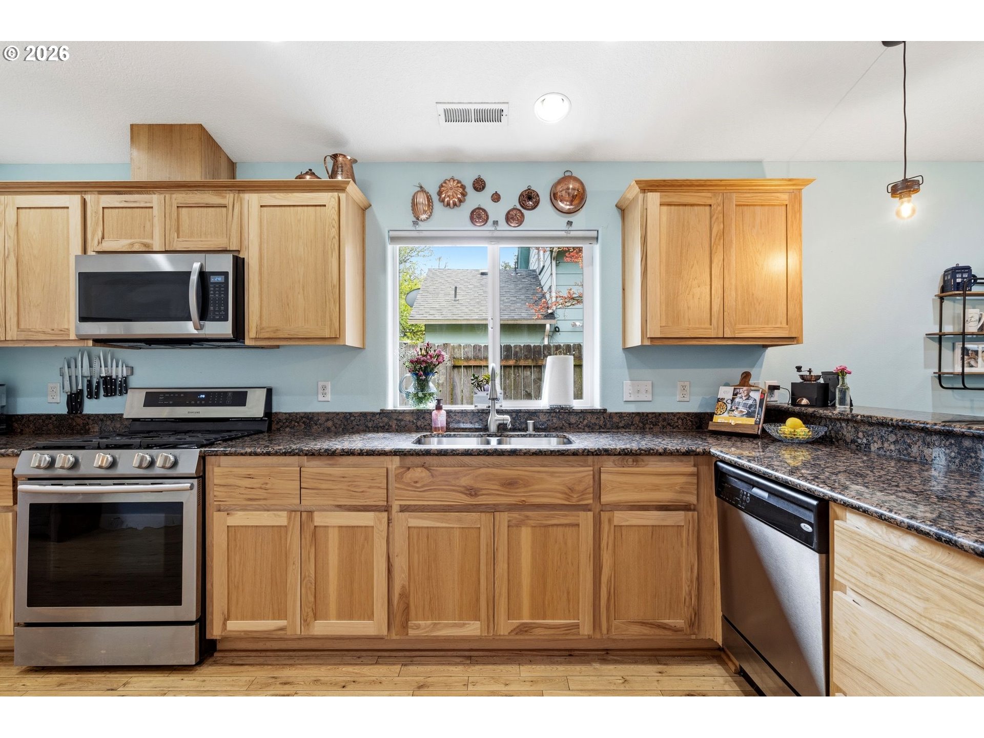 This custom-built 2008 ranch-style home in Ridgefield, WA, offers the convenience of single-level living in a prime location. The property features a functional, open floor plan, designed to maximize interior space and flow. The residence includes two spacious bedrooms and two full bathrooms, all situated on one level for ease of access.The interior showcases quality craftsmanship consistent with its custom build, featuring vaulted ceilings that enhance the natural light throughout the main living areas. The kitchen is equipped with slab granite countertops and a breakfast bar, providing an efficient workspace. The exterior living area includes a covered deck, accessible directly from the main living space, designed for year-round enjoyment.Additional features include a two-car attached garage, providing ample storage and secure parking. The home is situated within the Ridgefield School District and offers straightforward access to the I-5 corridor for commuting. Located near public amenities, including local trails and the Ridgefield National Wildlife Refuge, this property provides a blend of accessible, low-maintenance living in a quiet suburban setting. Experience the durability and layout of a custom-constructed home in one of Southwest Washington’s most desirable communities.