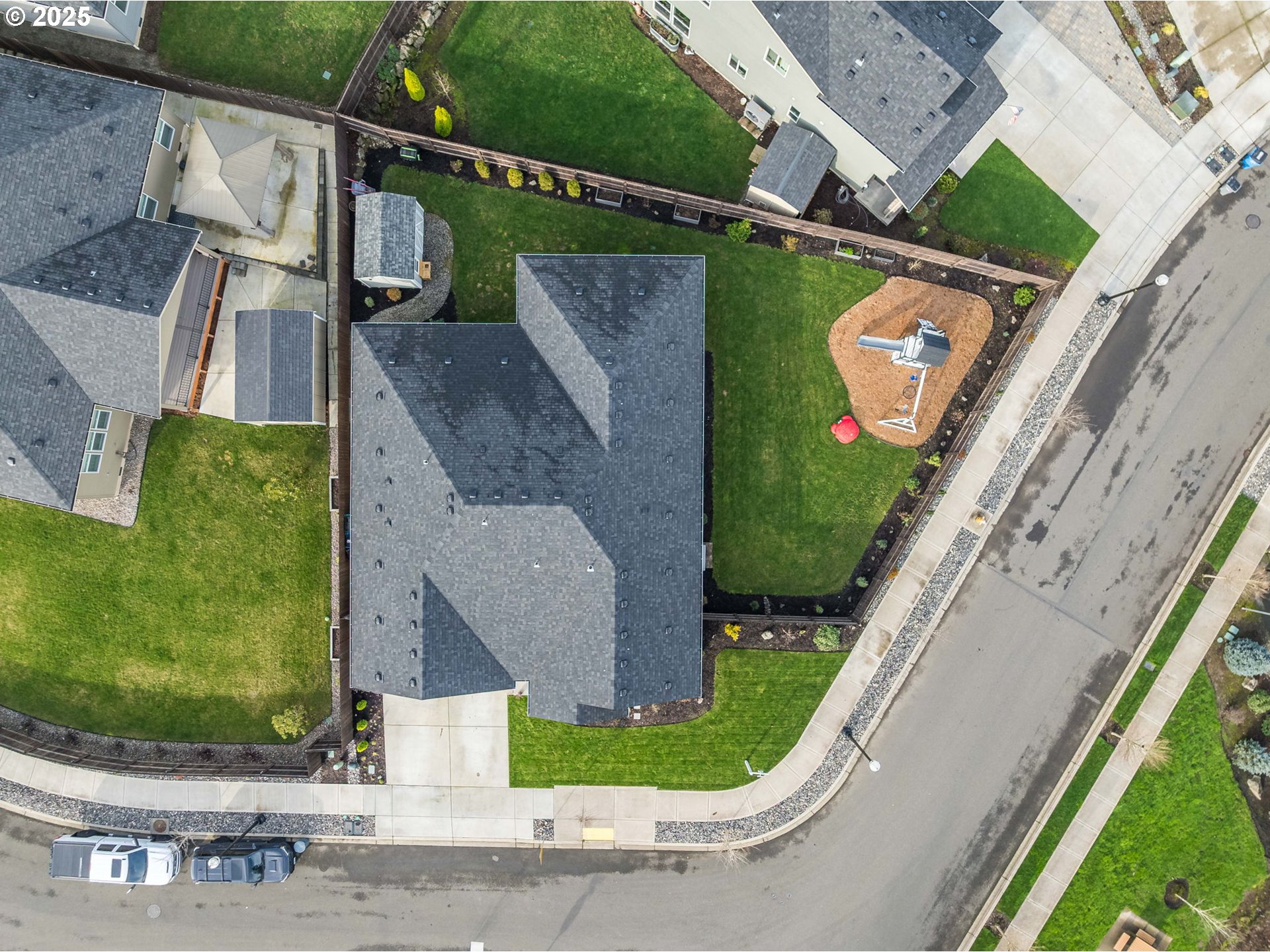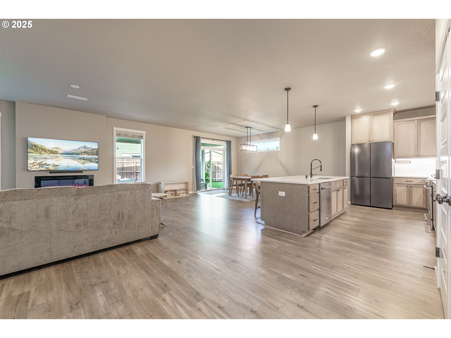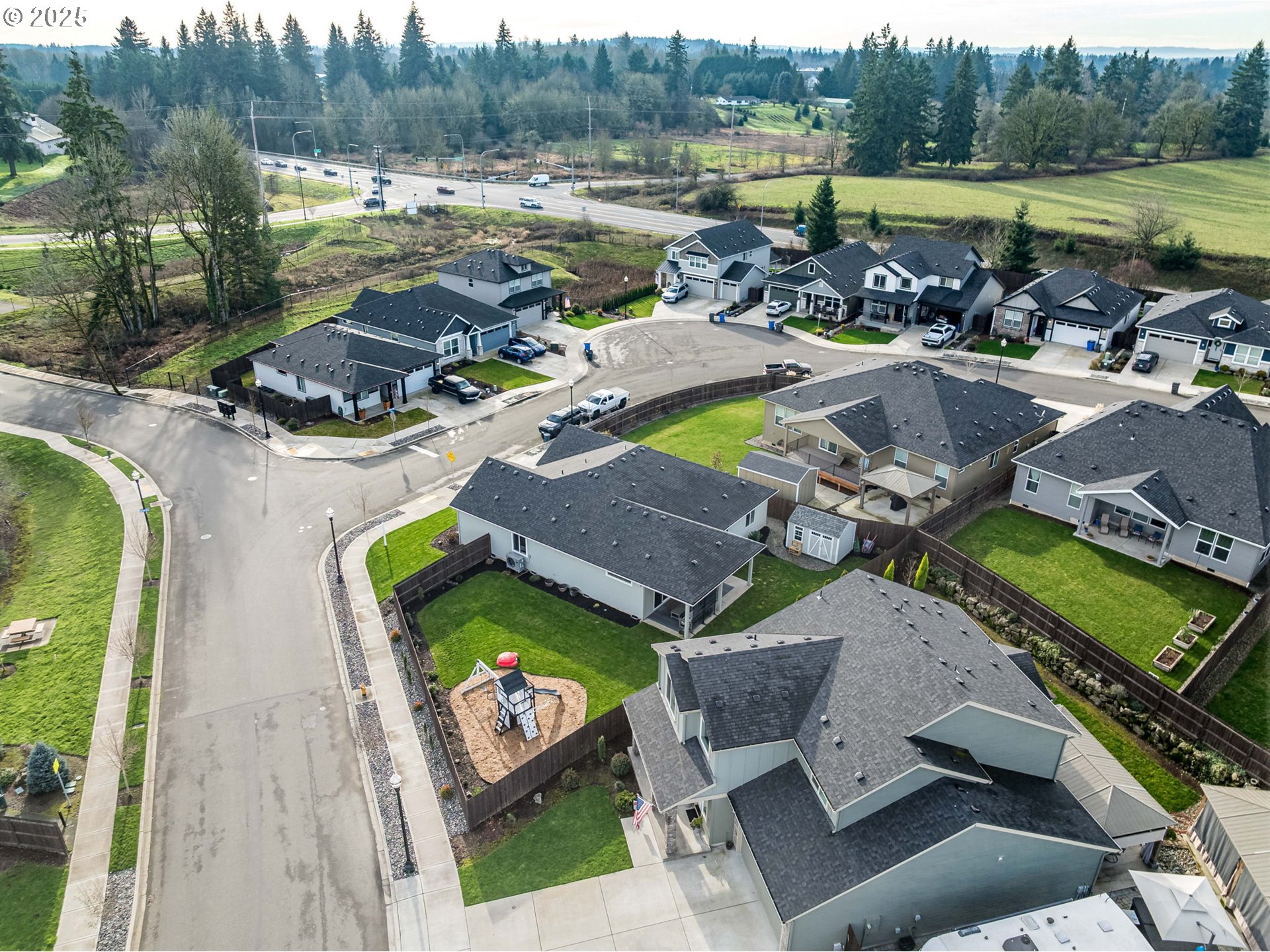 Welcome to this beautifully upgraded 4-bed, 2-bath former model home nestled on a quiet cul-de-sac corner lot. Built in 2022 and designed for single-level living, this home features custom paint, crown molding,and a spacious great-room concept filled with natural light.The gourmet kitchen offers quartz slab countertops, stained cabinetry, double ovens, stainless gas appliances, a full-height subway tile backsplash, under-cabinet & pendant lighting, and an oversized island perfect for entertaining. Enjoy the cozy linear electric fireplace in the great room and the convenience of wider doorways, 9 ft ceilings, and laminate plank flooring throughout the main living areas.The luxurious primary suite features tile bathroom floors and a walk-in tile shower. Additional highlights include a huge 24' x 10' covered patio, 80-gallon hybrid water heater, garden/tool shed, laundry room with cabinets & sink, full landscaping, fenced yard, EV charger circuit, and a massive backyard—with the play structure included!
